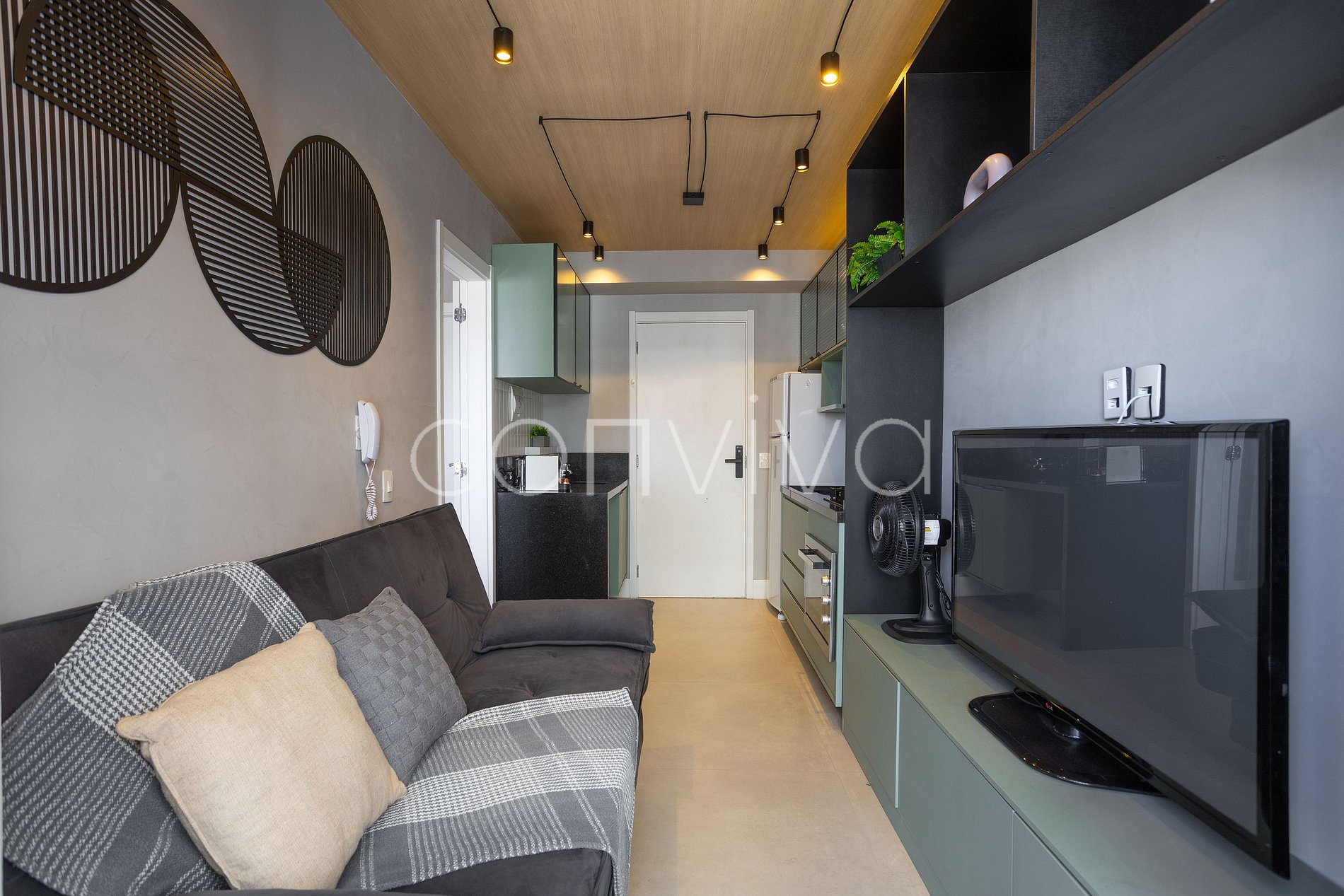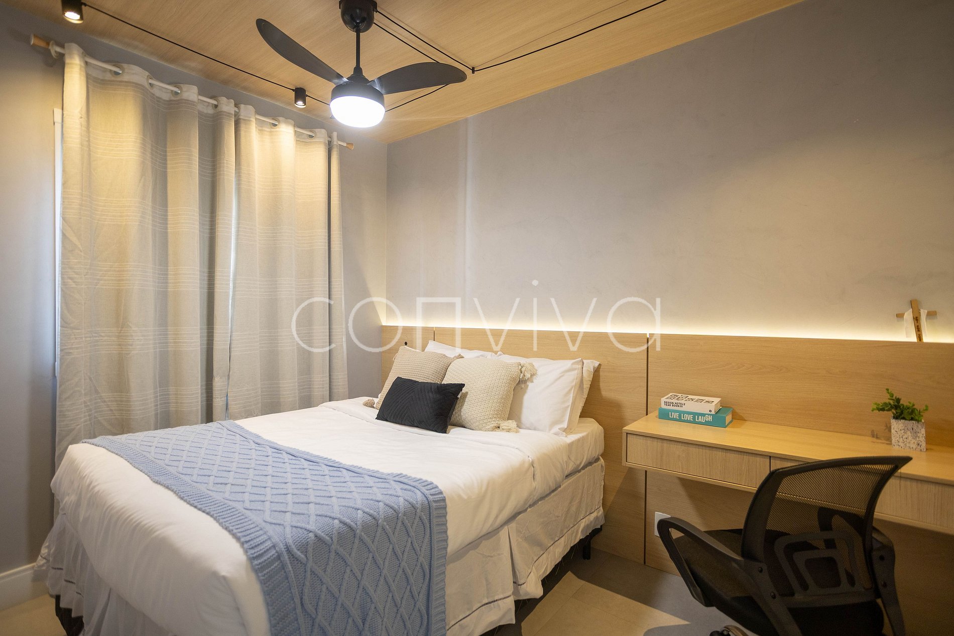 Com 30m² no 15º andar, o espaço foi pensado para short e long stay, oferecendo cama de casal, home office, sofá-cama, banheiro espaçoso e cozinha completa para o dia a dia.
