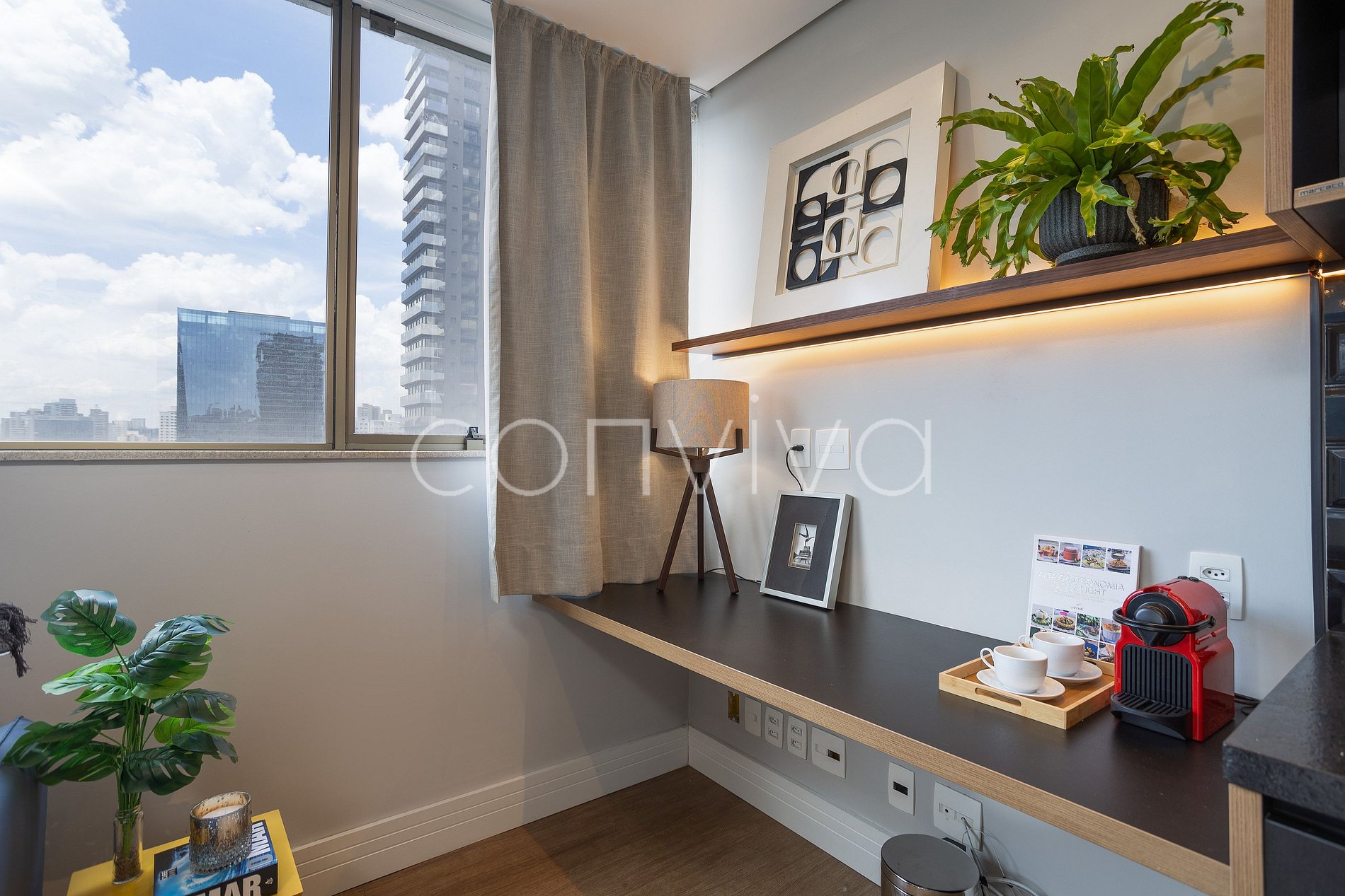 The 40m² space, on the 14th floor, has a queen bed, sofa bed, bathroom and kitchenette with all the utensils you need to prepare your meals.