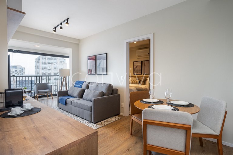 48m² space, on the 18th floor, with a queen size bed, bathroom, sofa and kitchen. In the best location in Pinheiros, close to the Faria Lima metro.