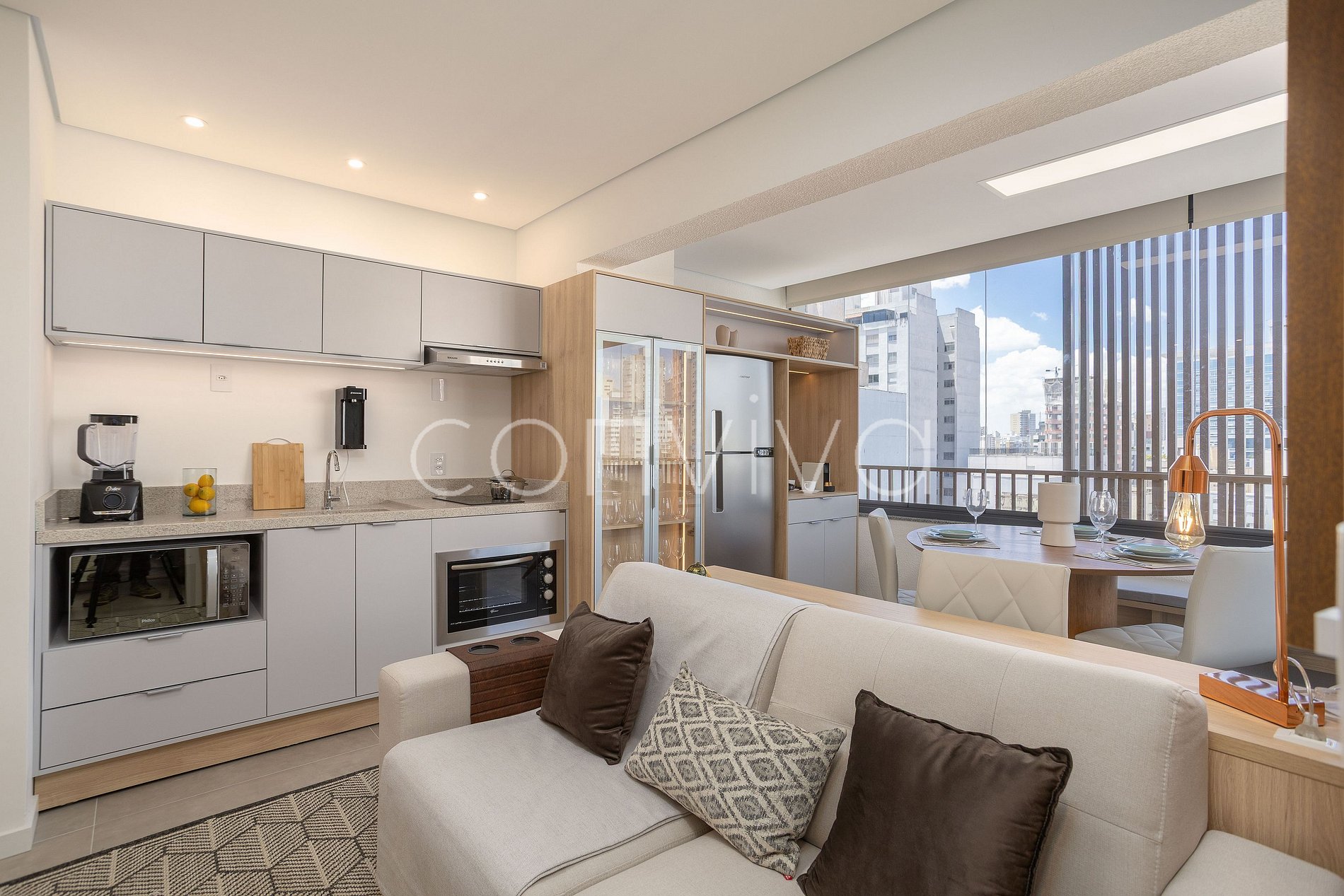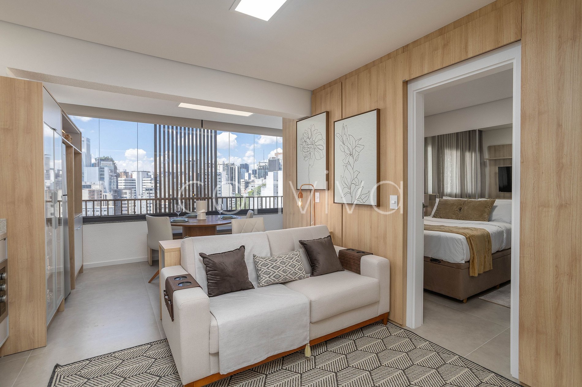 Apartamento de 42m² no 10º andar, com vista livre e panorâmica da cidade de São Paulo. Quarto confortável com cama casal e ar-condicionado, ideal para descanso. Sala generosa com janelas amplas que proporcionam uma vista incrível da cidade. Perfeito para quem busca conforto, tranquilidade e uma localização privilegiada na Consolação, próximo à Avenida Paulista.
