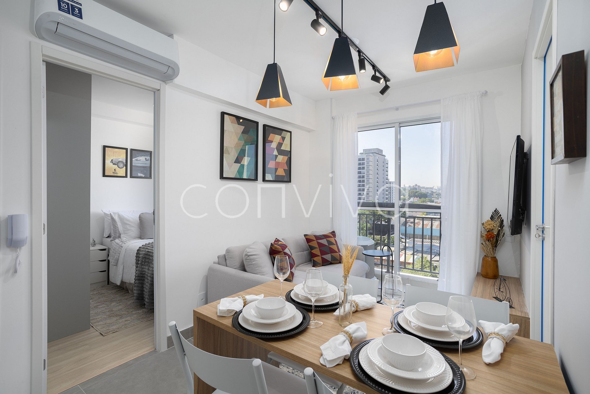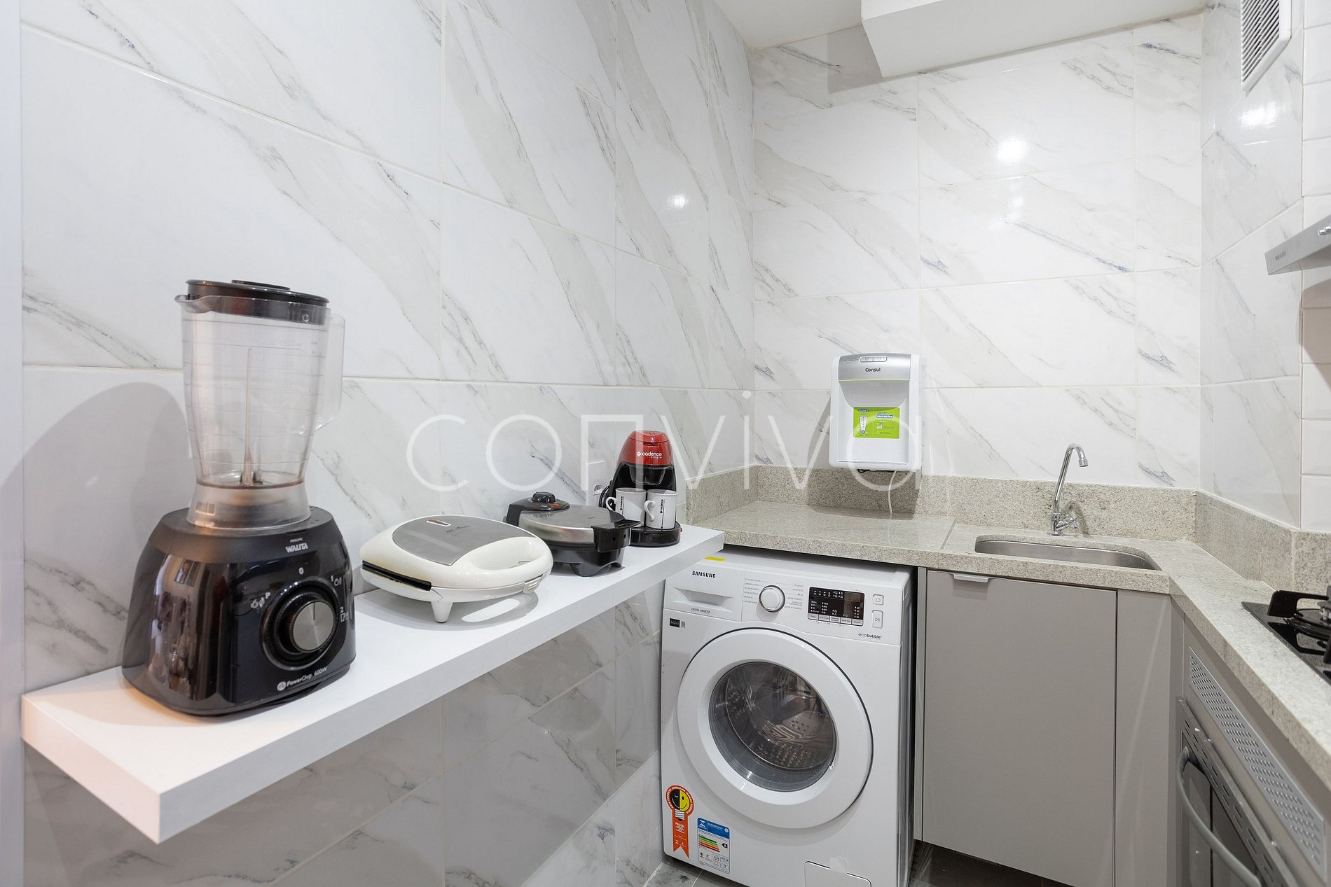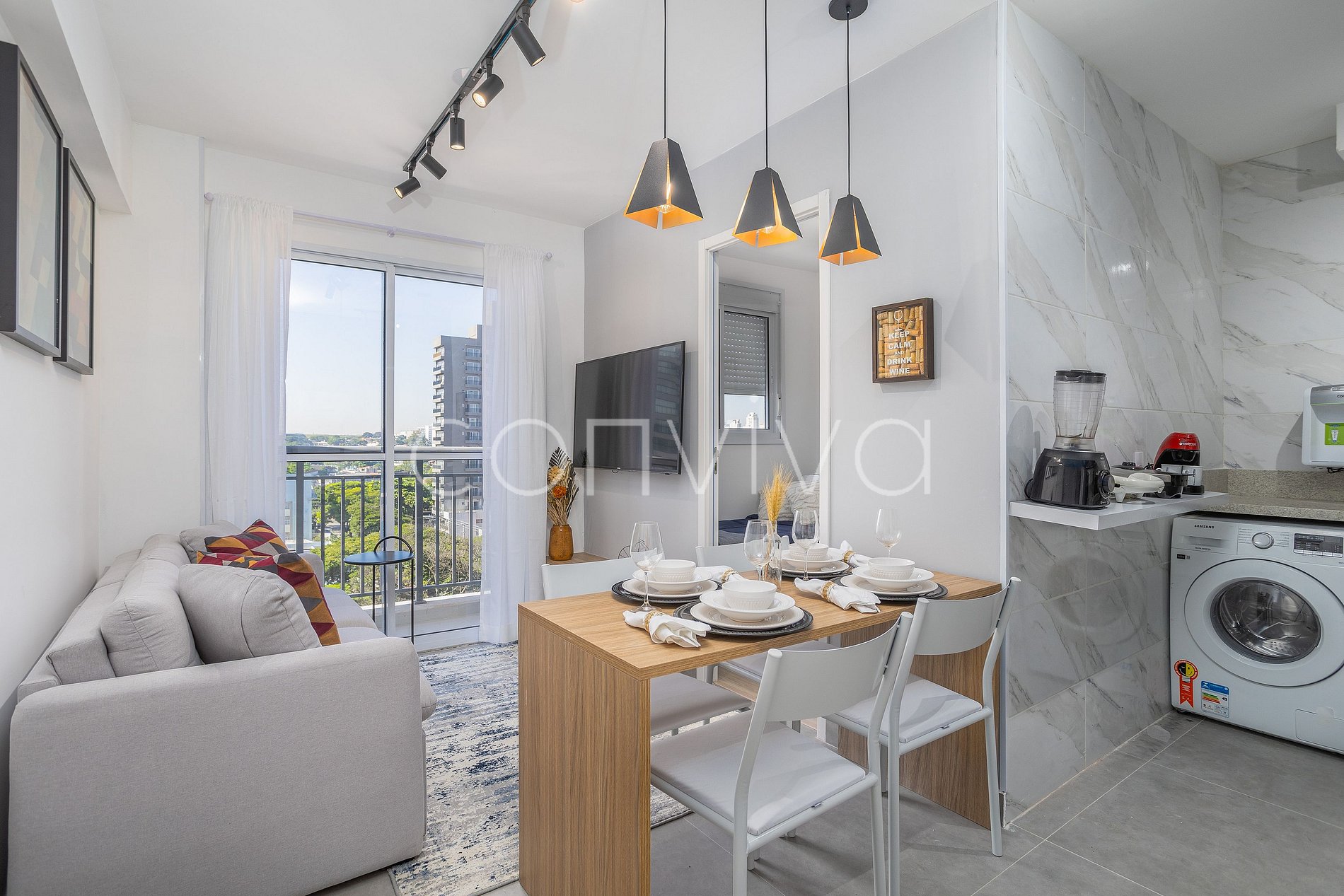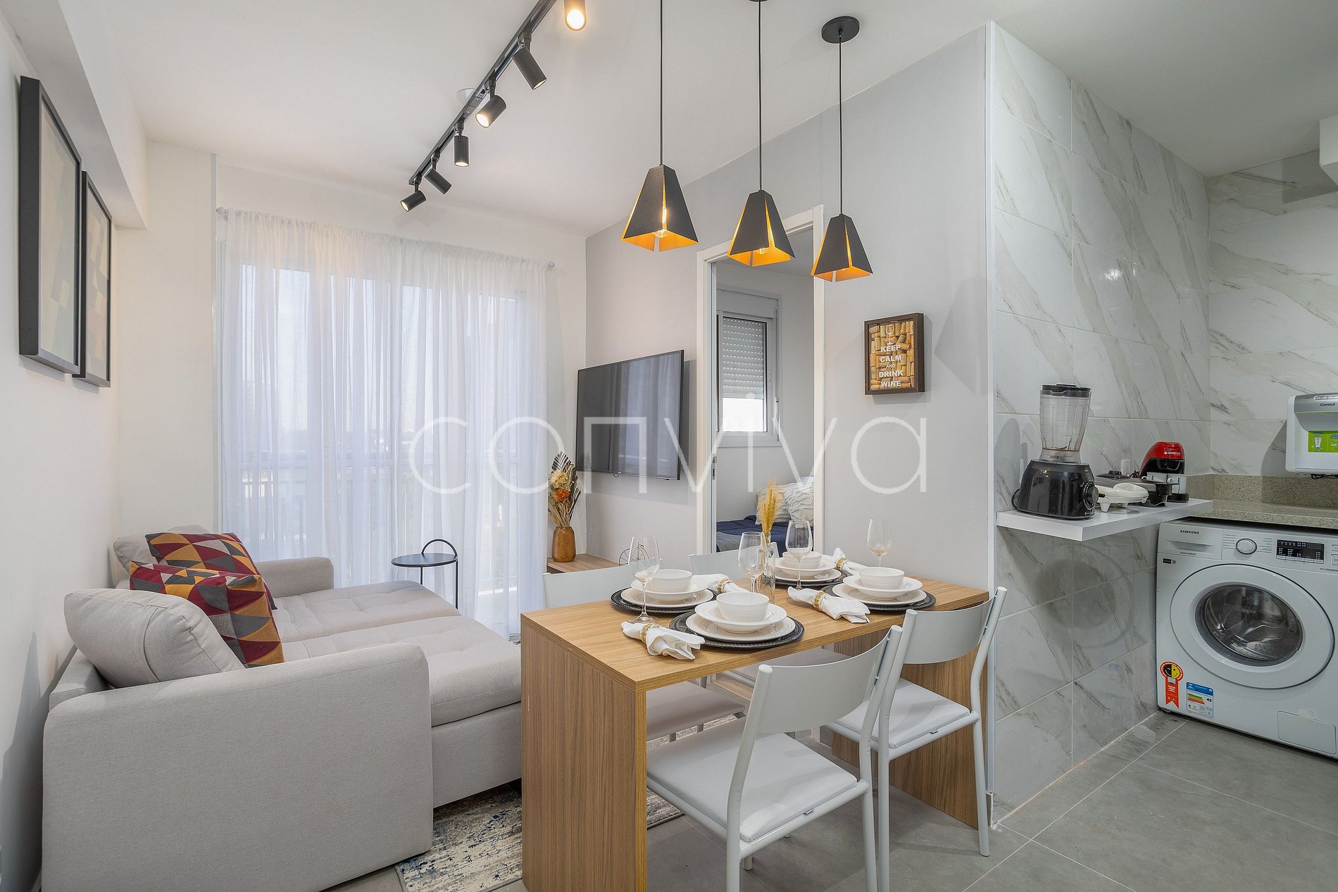 With 36m², on the 7th floor, it has two bedrooms, one with a double bed and the other with a single bed and home office space, sofa bed in the living room, bathroom and fully equipped kitchen.