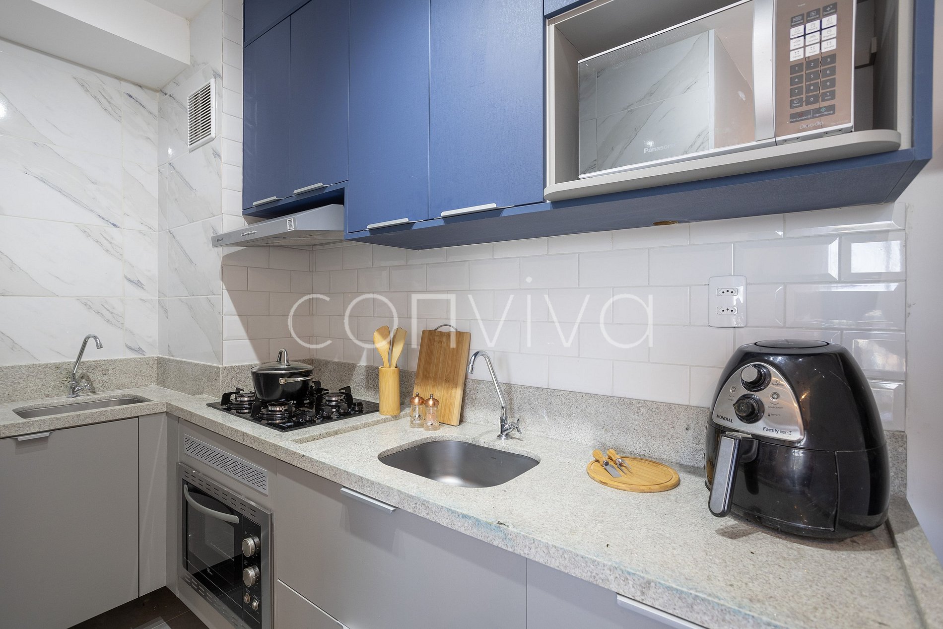 With 36m², on the 7th floor, it has two bedrooms, one with a double bed and the other with a single bed and home office space, sofa bed in the living room, bathroom and fully equipped kitchen.