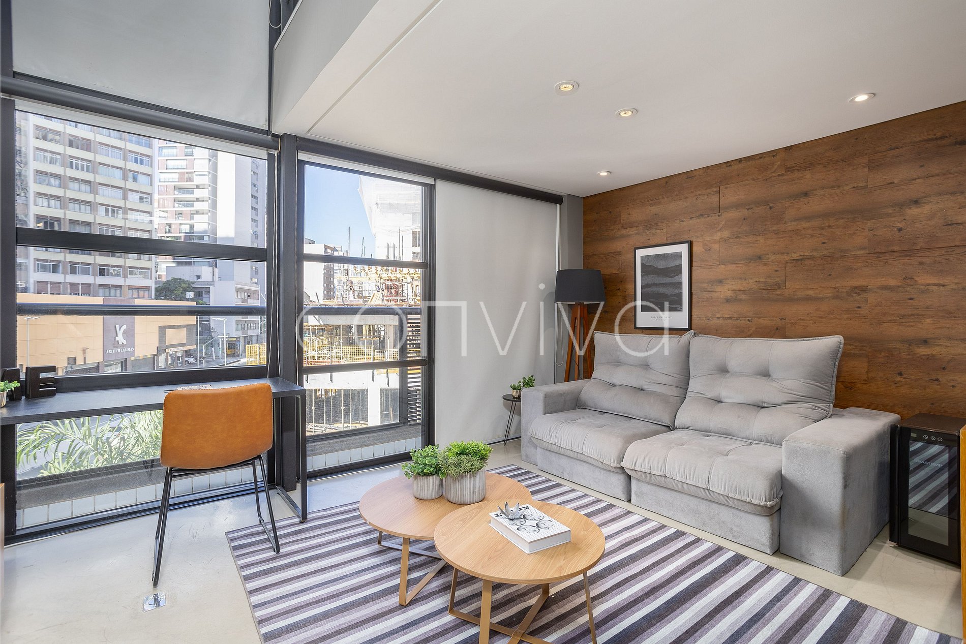 With 48m², on the 4th floor, the duplex has two floors, suite with queen bed and spacious bathroom, large living room with retractable sofa and home office space, well-equipped full kitchen, with basic cleaning included.