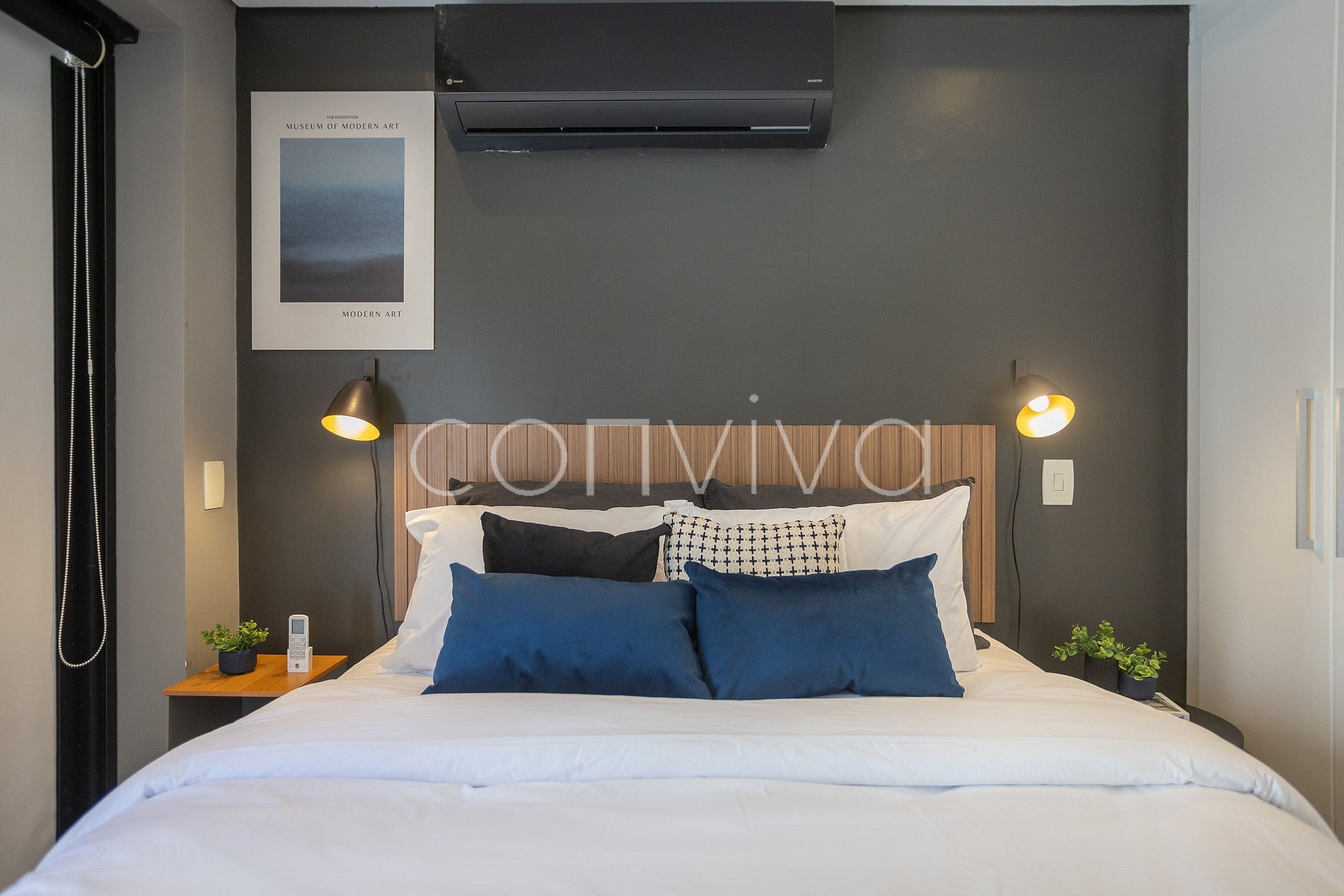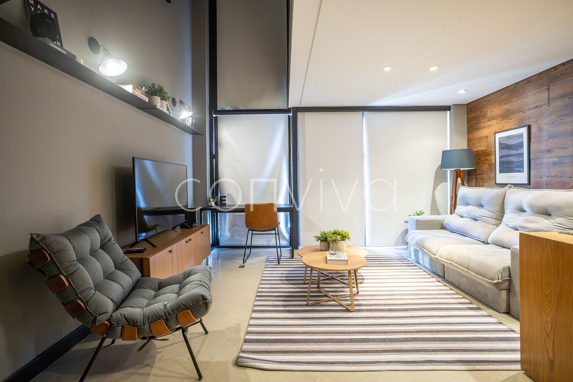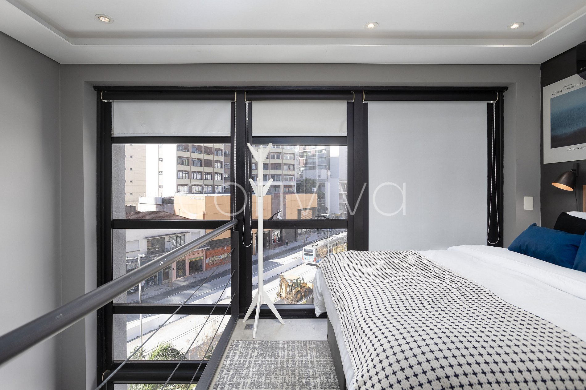 With 48m², on the 4th floor, the duplex has two floors, suite with queen bed and spacious bathroom, large living room with retractable sofa and home office space, well-equipped full kitchen, with basic cleaning included.