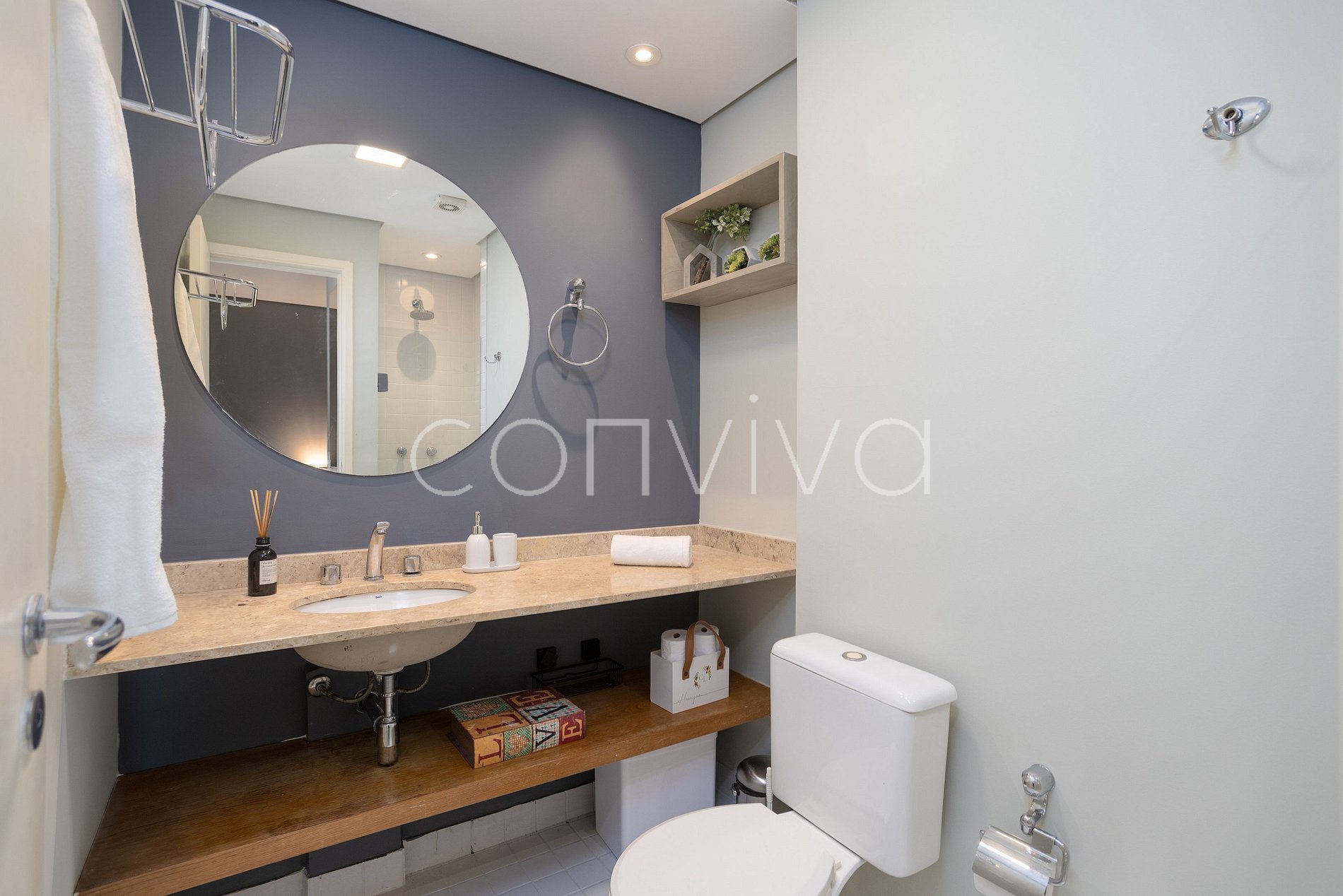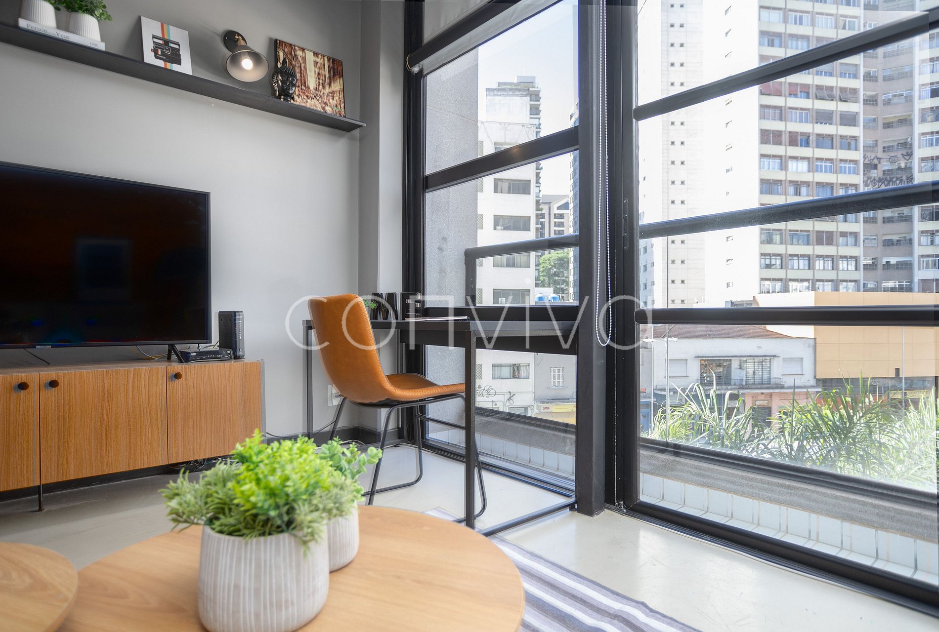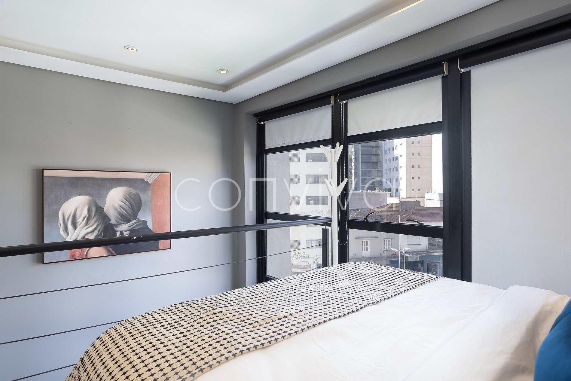 With 48m², on the 4th floor, the duplex has two floors, suite with queen bed and spacious bathroom, large living room with retractable sofa and home office space, well-equipped full kitchen, with basic cleaning included.