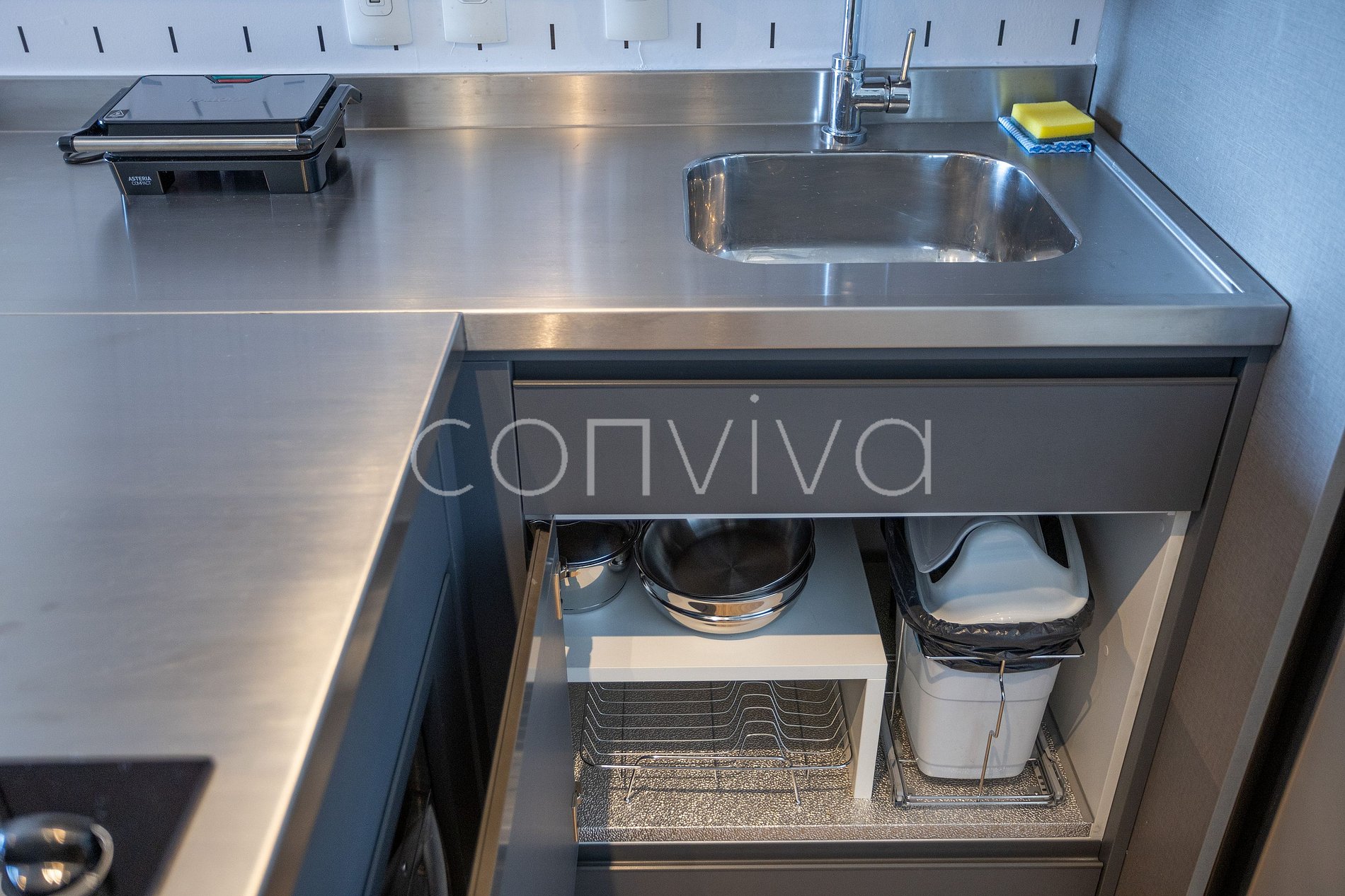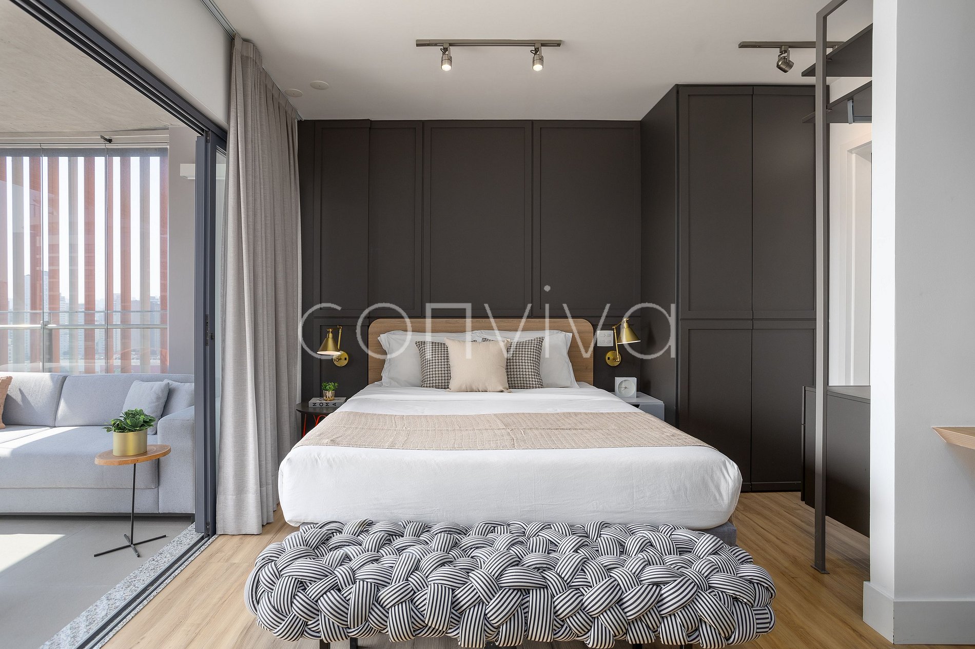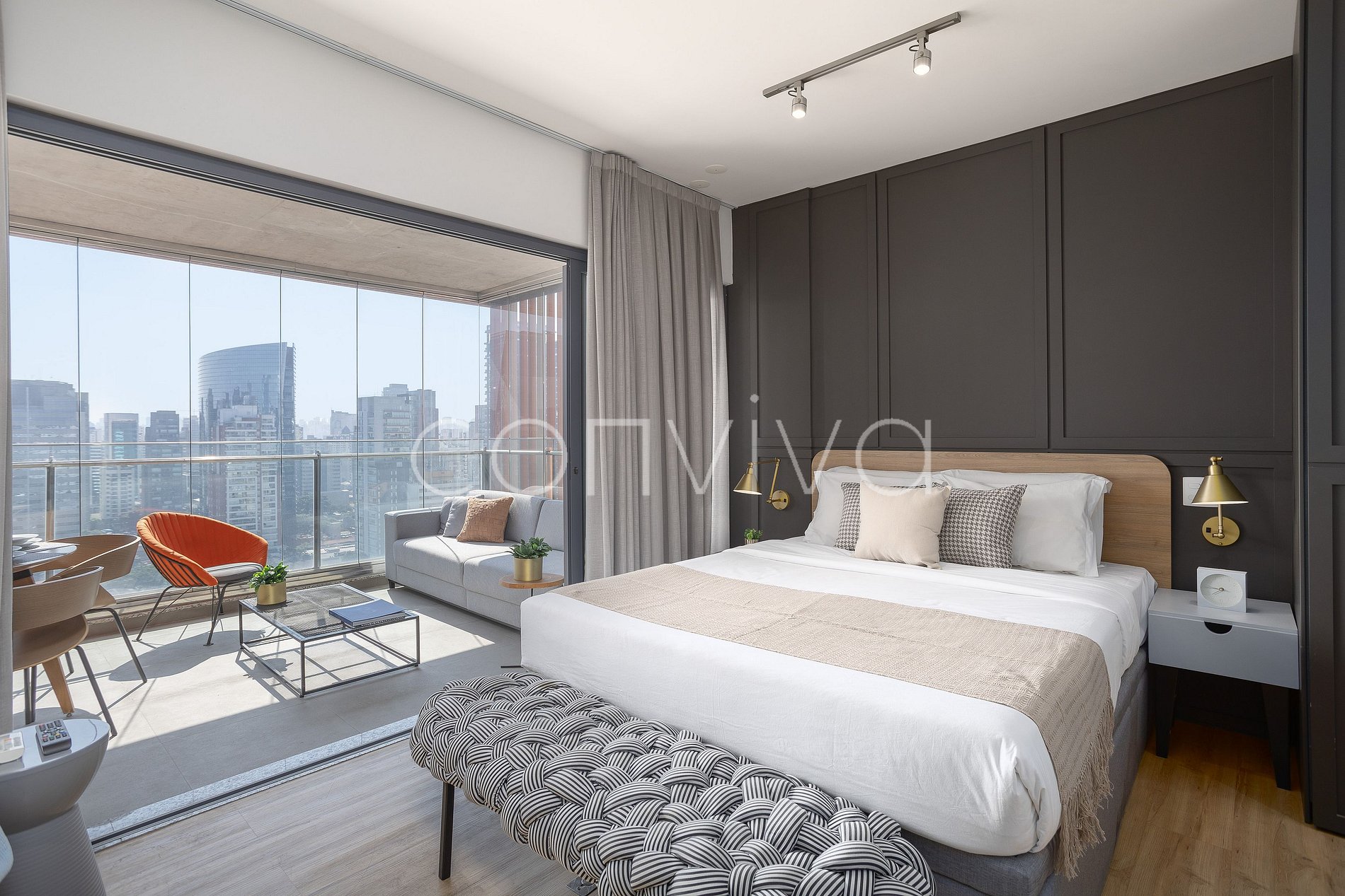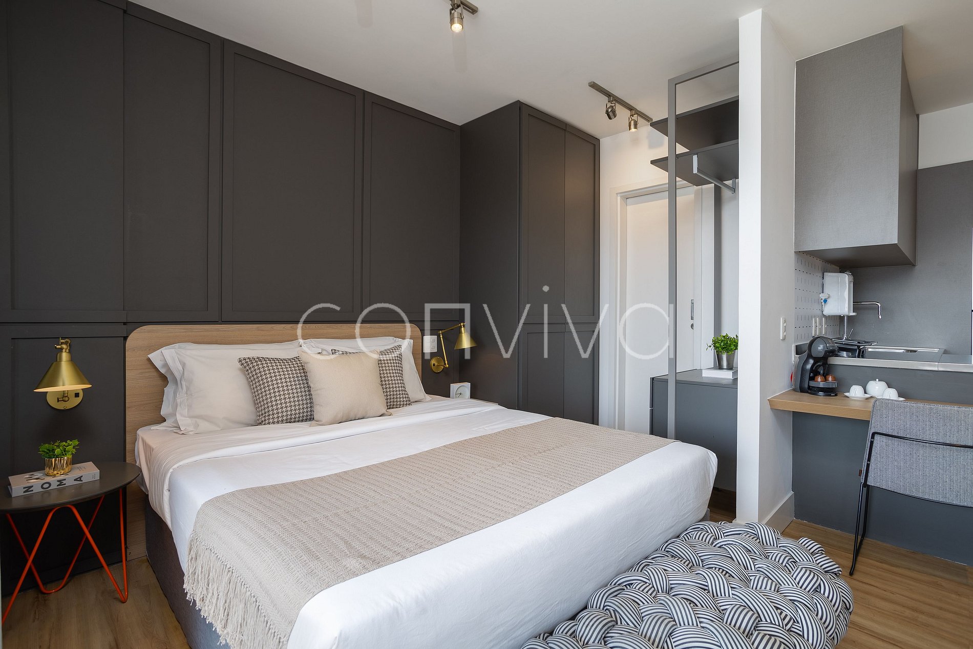 Space of 46m², on the 20th floor, with a queen size bed, kitchenette and balcony.