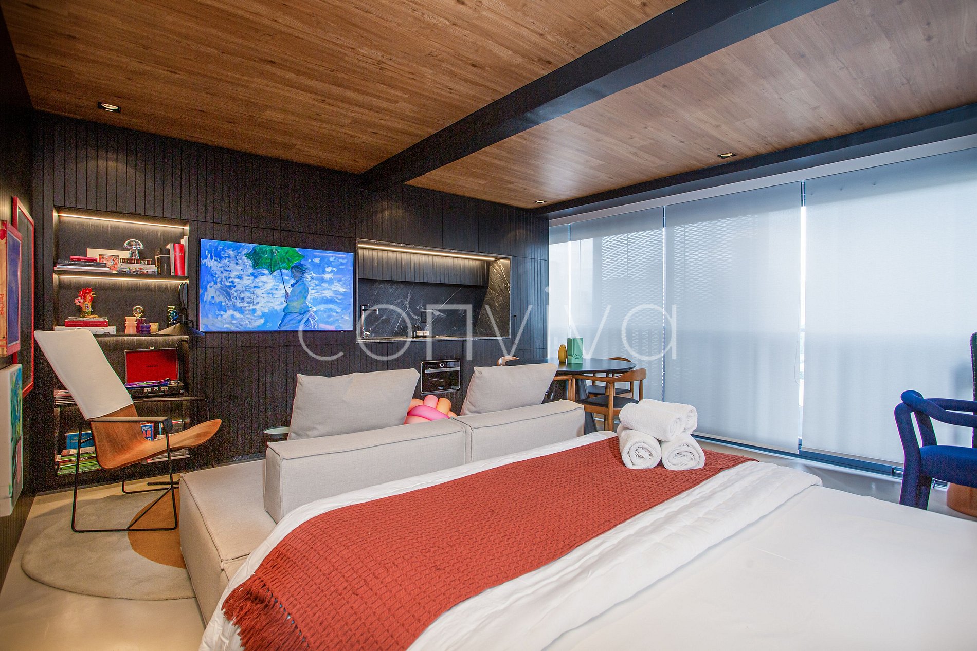 The 44m² space, on the 8th floor, has a queen size bed, sofa, kitchenette, bathroom and stunning decor in the best location in Itaim Bibi.