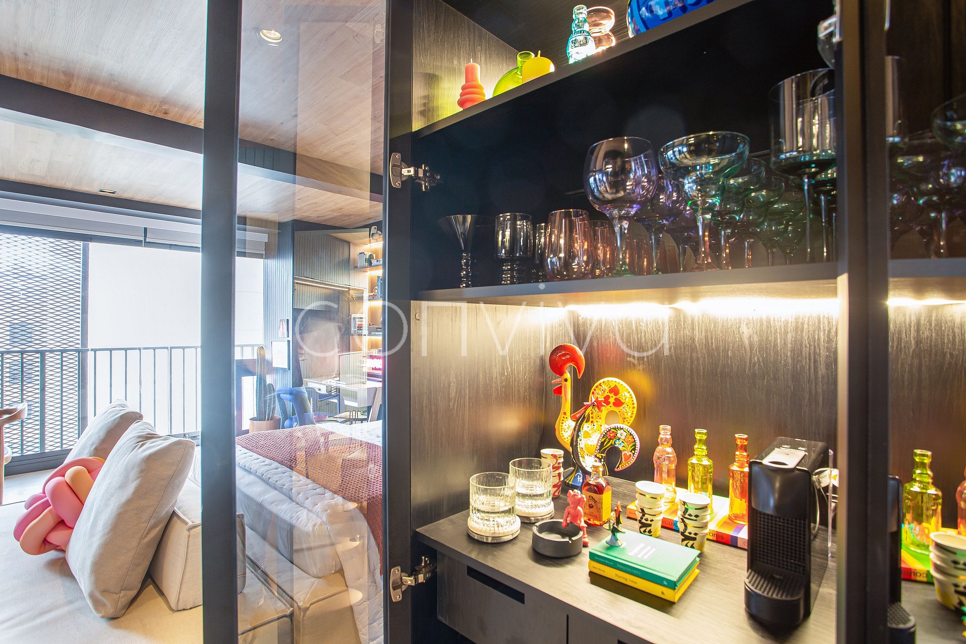 The 44m² space, on the 8th floor, has a queen size bed, sofa, kitchenette, bathroom and stunning decor in the best location in Itaim Bibi.