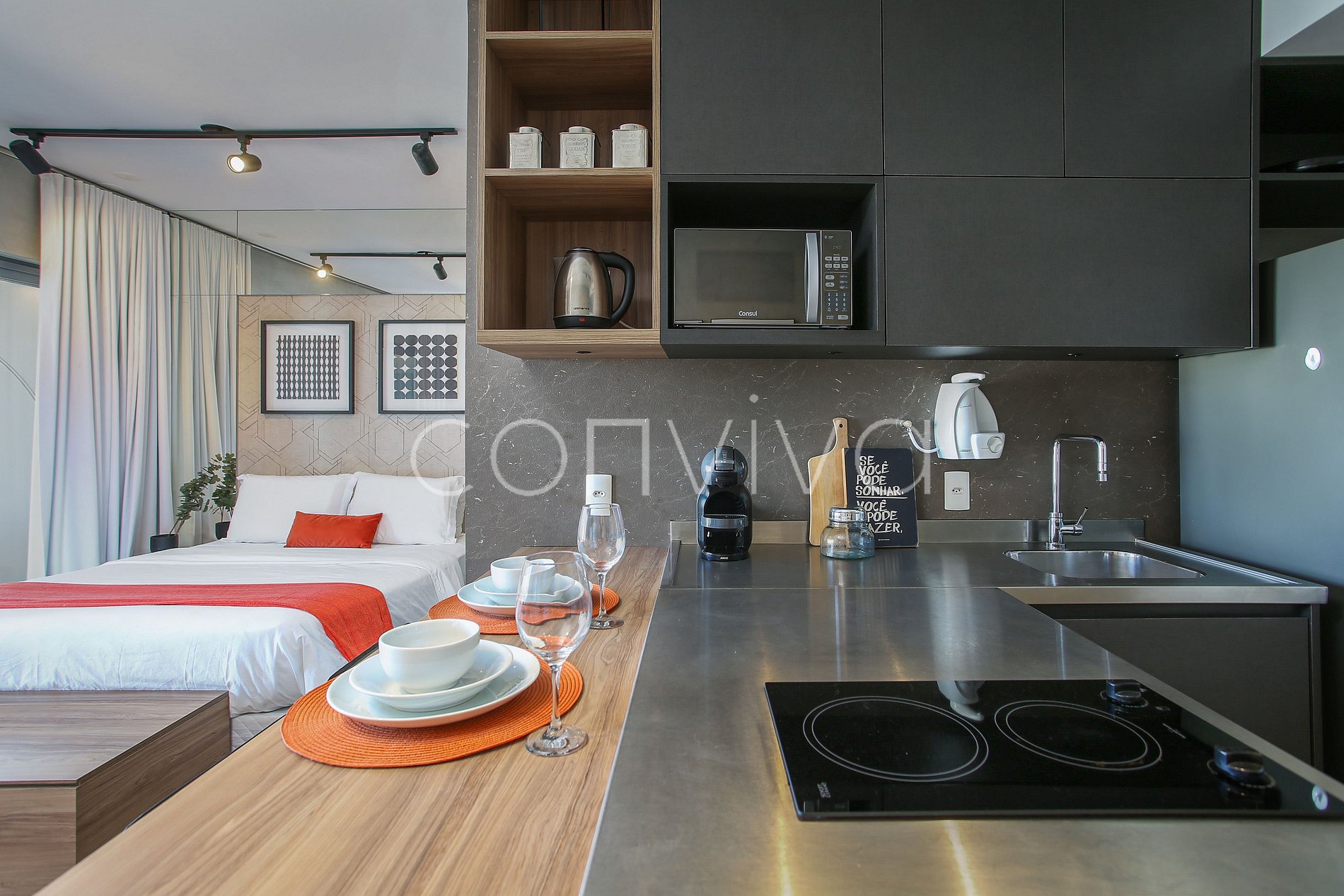A 46m² space, on the 15th floor, with a queen size bed, sofa, bathroom and kitchenette. Super cozy atmosphere.
