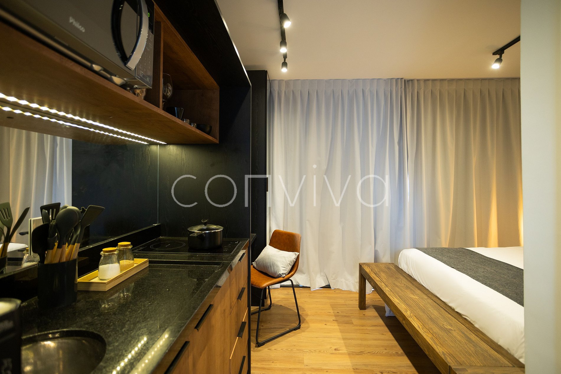 A 21m² space, on the 7th floor, with a double bed, bathroom, balcony and full kitchen.