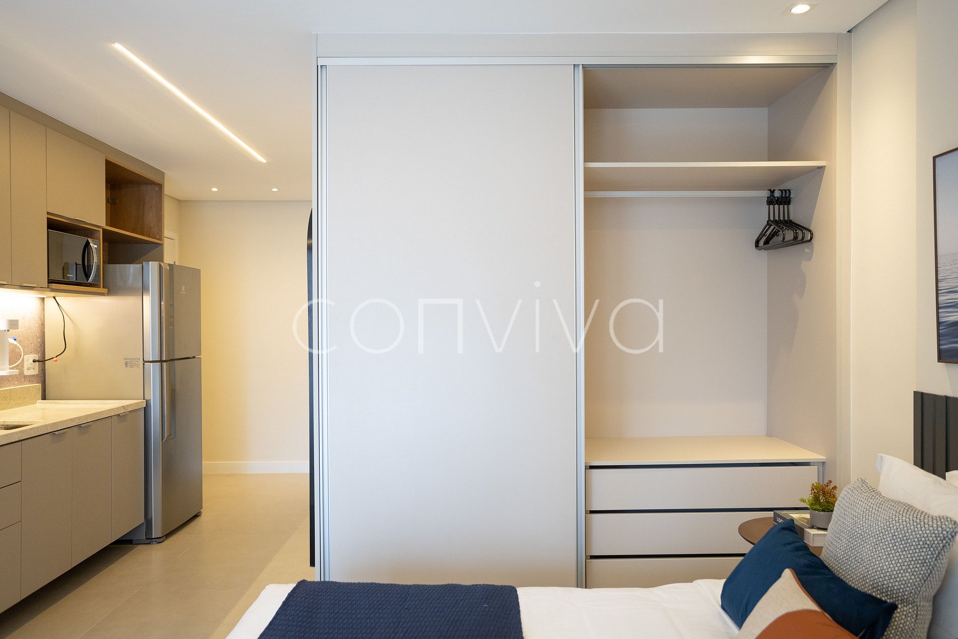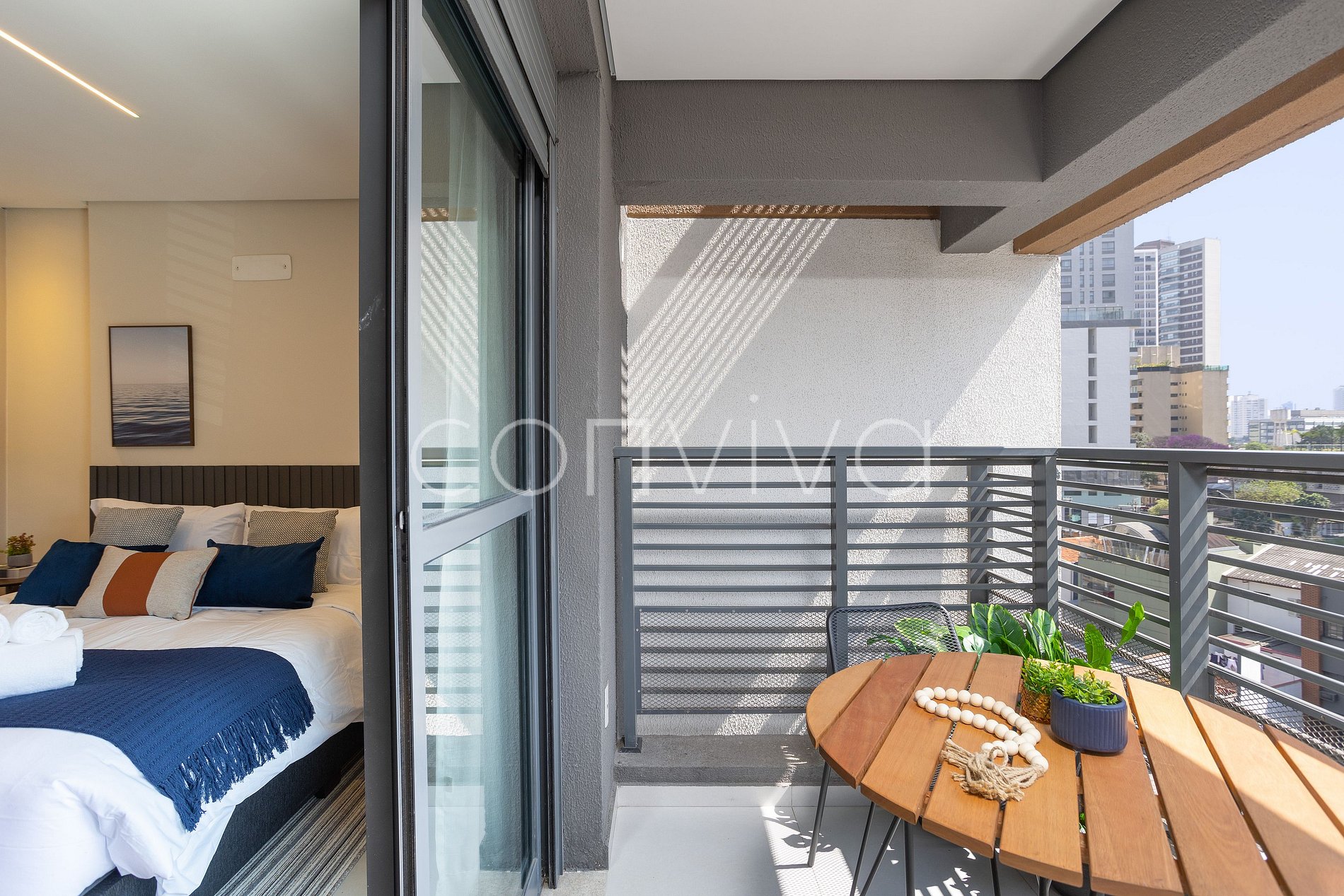 With 35m², on the 6th floor, it has a queen size bed, bathroom, kitchen and balcony overlooking the neighborhood.