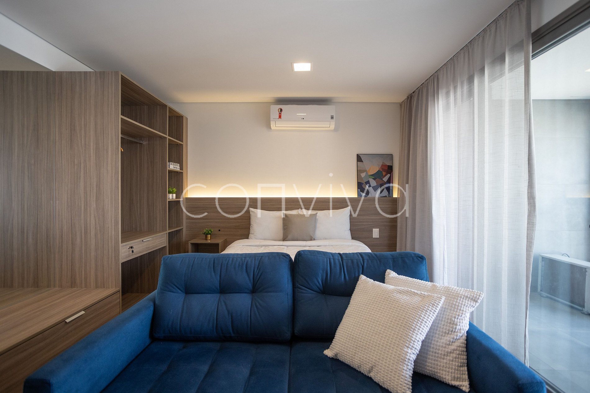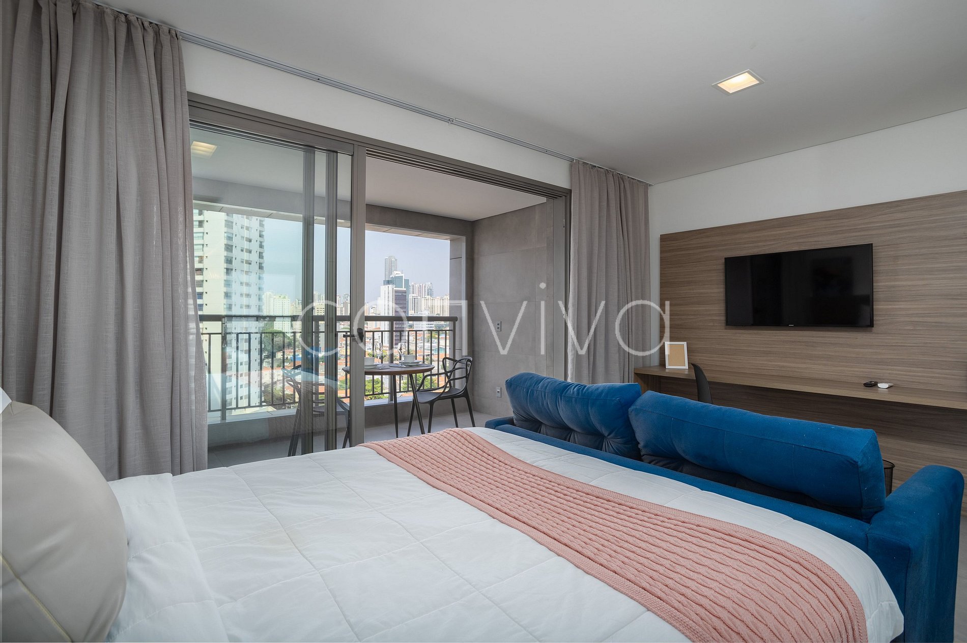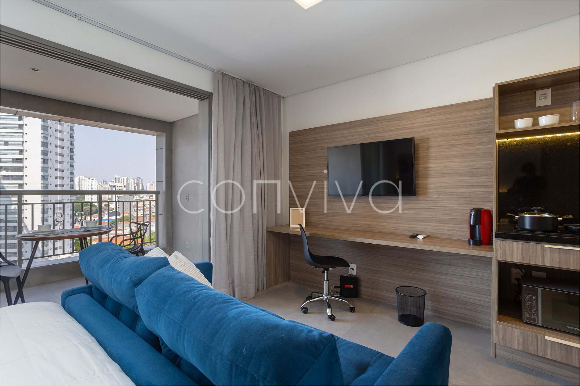 With 35m², on the 8th floor, the studio has a double bed, home office space, full kitchen, bathroom, sofa and balcony overlooking the neighborhood.
