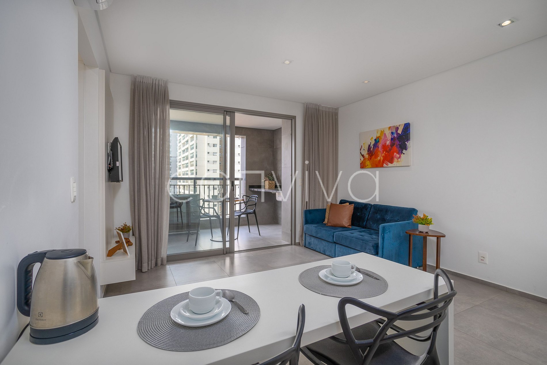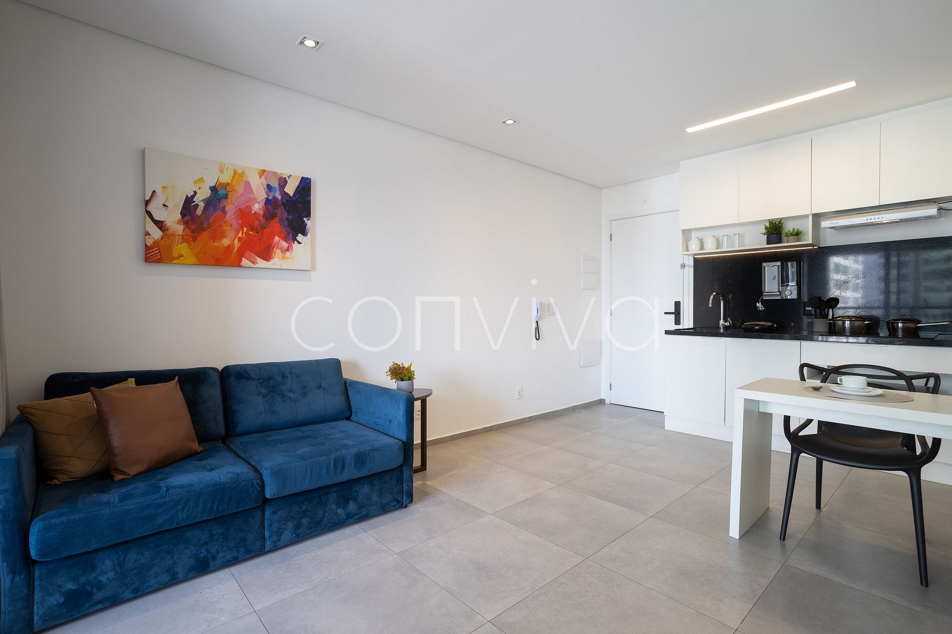 Com 57m², no 11º andar, o apartamento dispõe dois quartos, um com uma cama de casal e o outro com uma cama de solteiro e espaço para home office, cozinha equipada, banheiro, sofá e uma varanda com vista para o bairro.