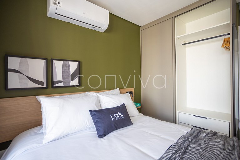 Studio de 25m², no 13º andar, com uma cama queen size, cozinha compacta, banheiro e varanda.