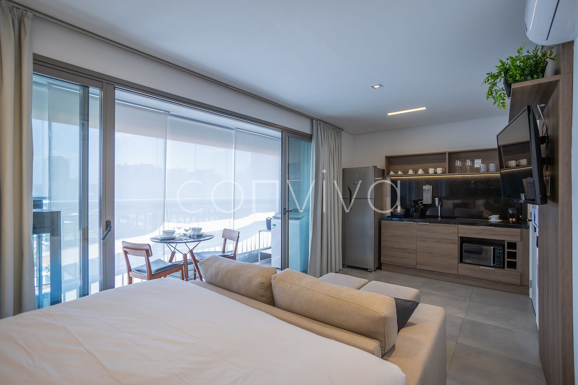 Studio no 9º andar, composto por uma cama de casal, sofá, banheiro, cozinha completa e varanda espaçosa com espaço de lavanderia.