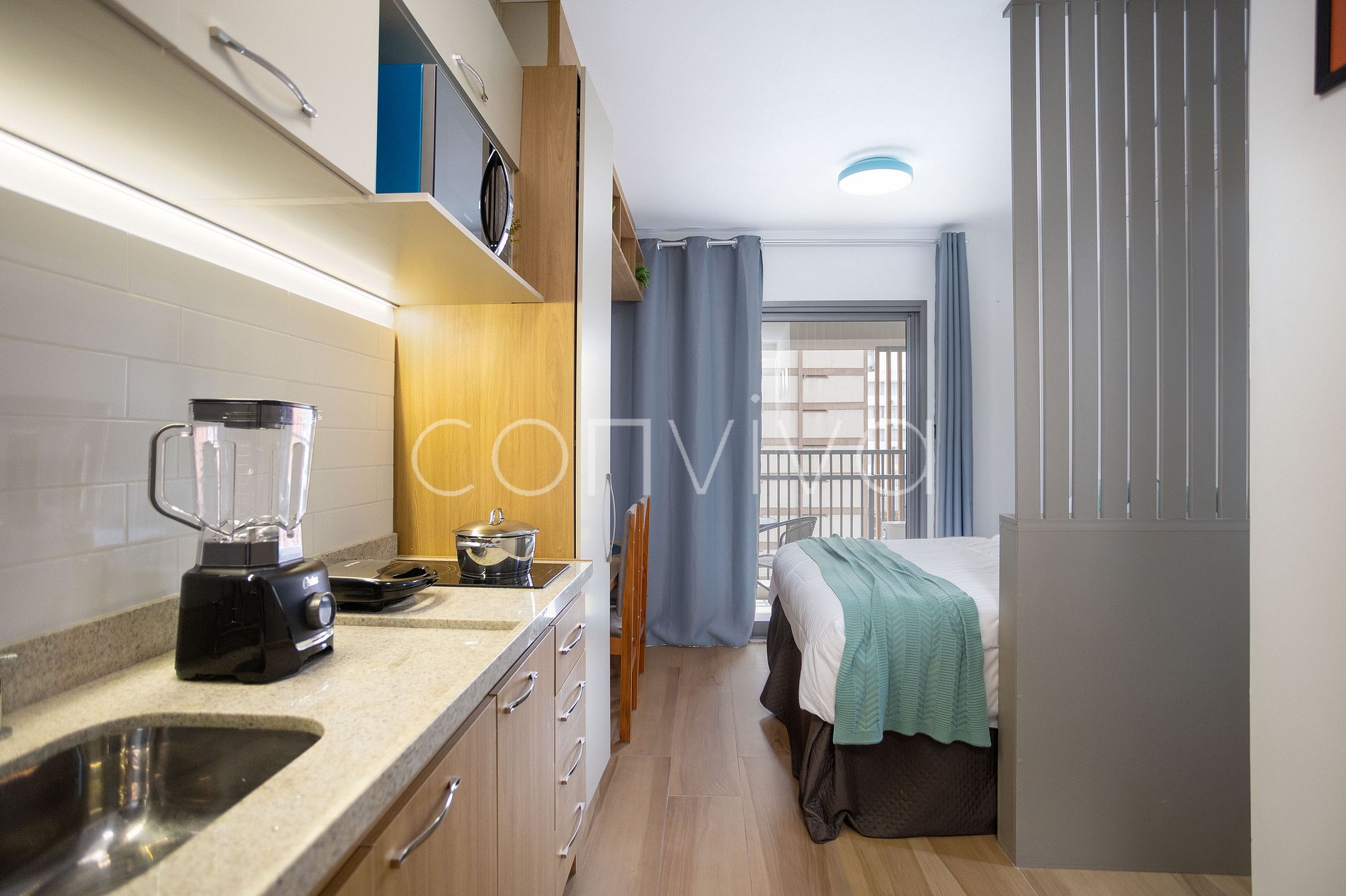 Desfrute de São Paulo no 6º andar. Studio moderno de 22m² com cama queen, varanda com vista para a cidade, cozinha completa, Wi-Fi, Smart TV e ar-condicionado.