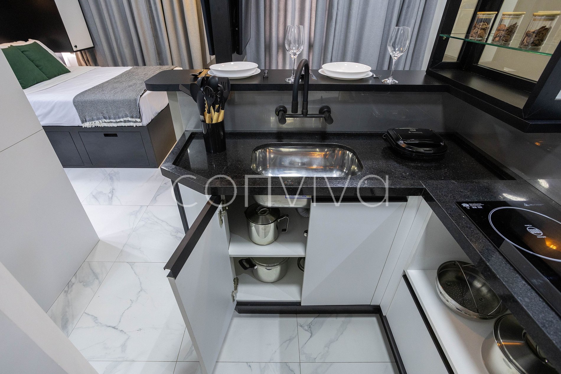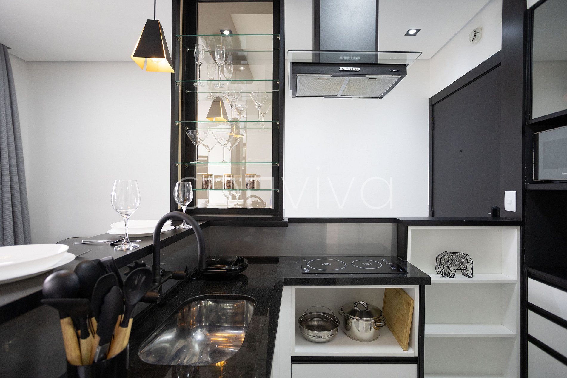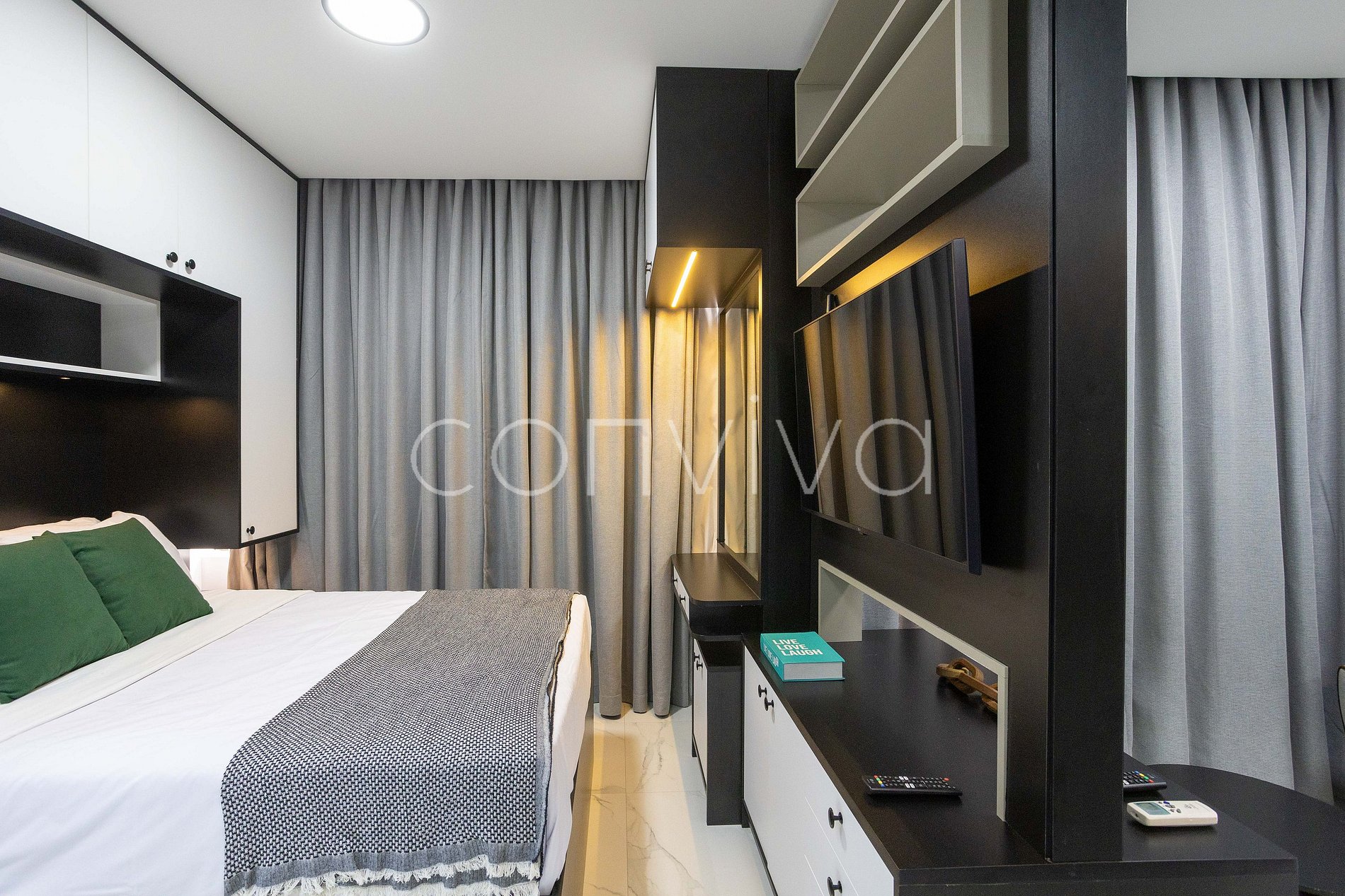 Este apartamento com uma vista espetacular dentro do Hotel Q. Paulista conta com uma cama casal, sala ampla, banheiro espaçoso, bar e cozinha completa.