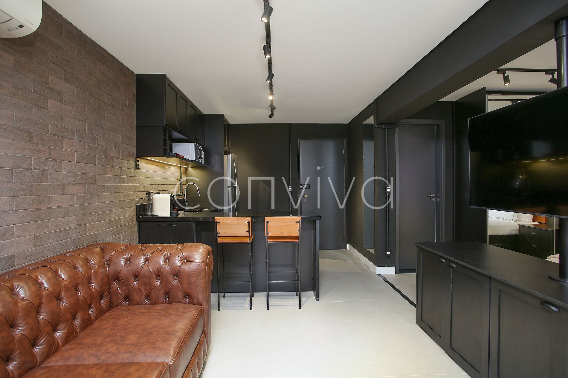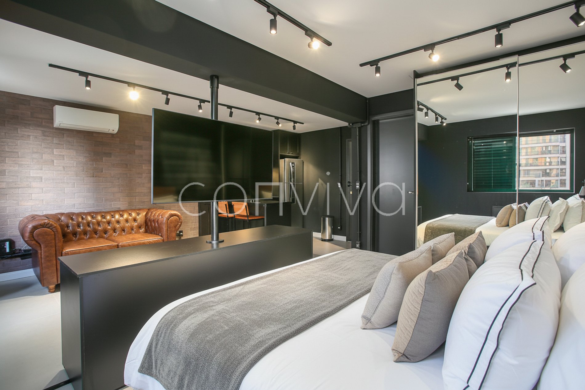 The 40m² space, located on the 3rd floor, has a queen size bed, sofa, bathroom and kitchenette with top quality utensils, next to Avenida Brigadeiro Faria Lima.