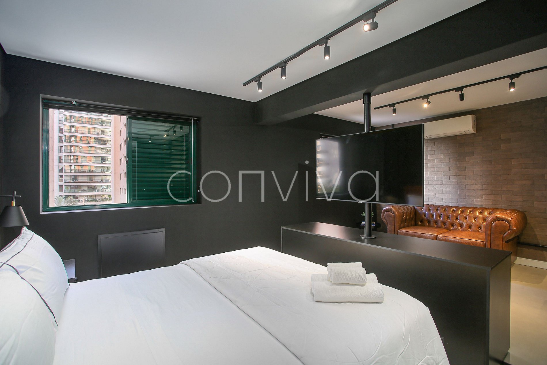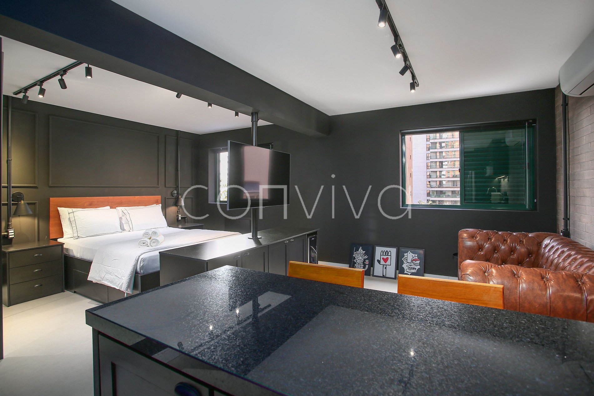 The 40m² space, located on the 3rd floor, has a queen size bed, sofa, bathroom and kitchenette with top quality utensils, next to Avenida Brigadeiro Faria Lima.