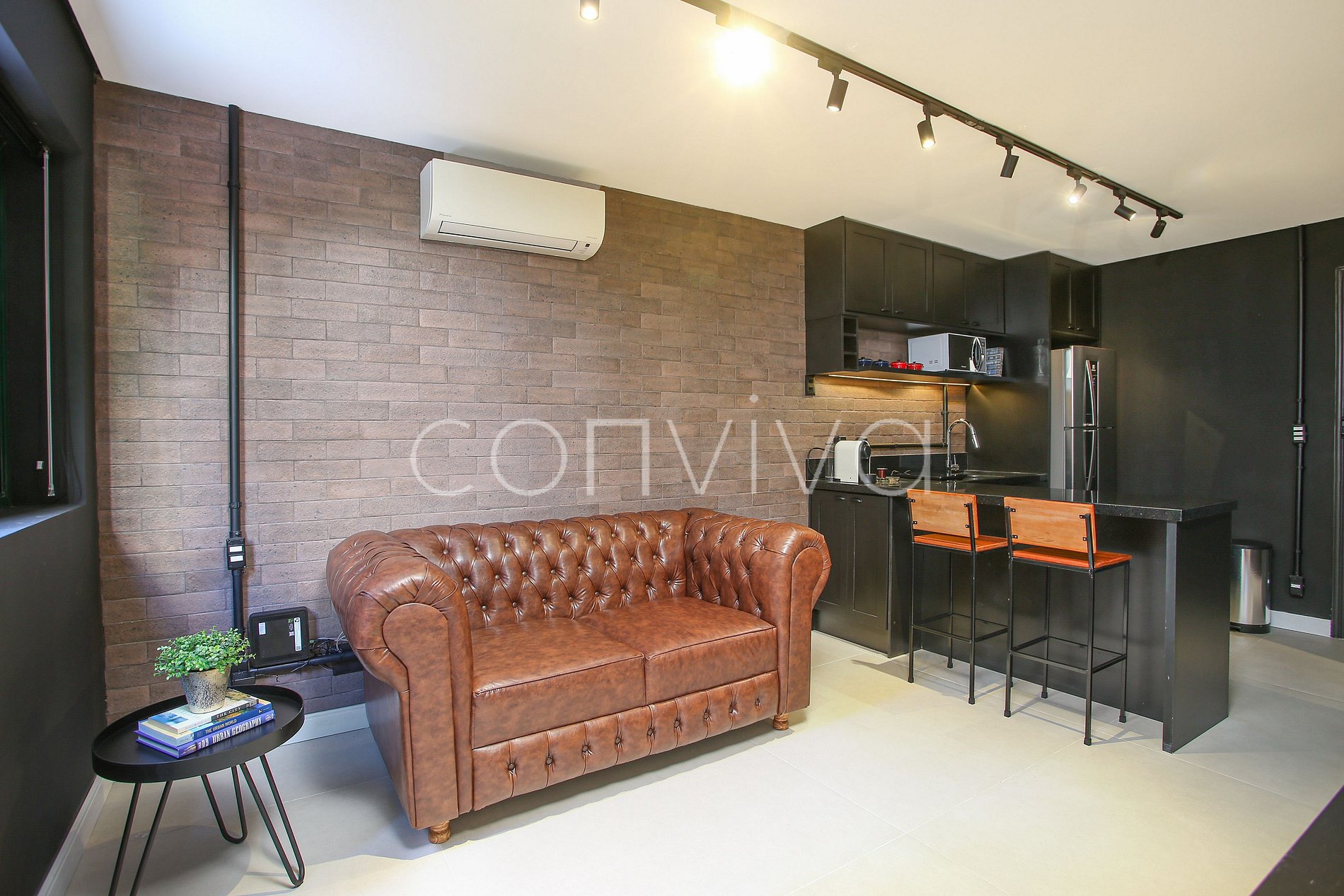 The 40m² space, located on the 3rd floor, has a queen size bed, sofa, bathroom and kitchenette with top quality utensils, next to Avenida Brigadeiro Faria Lima.