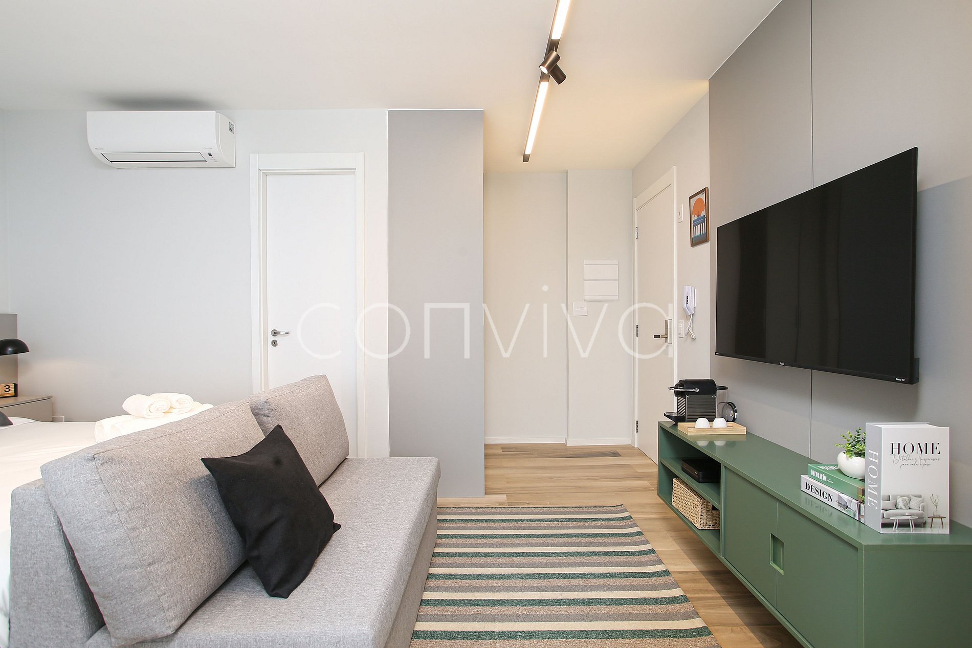 A modern 28m² studio on the 9th floor with a double bed, sofa and contemporary design.