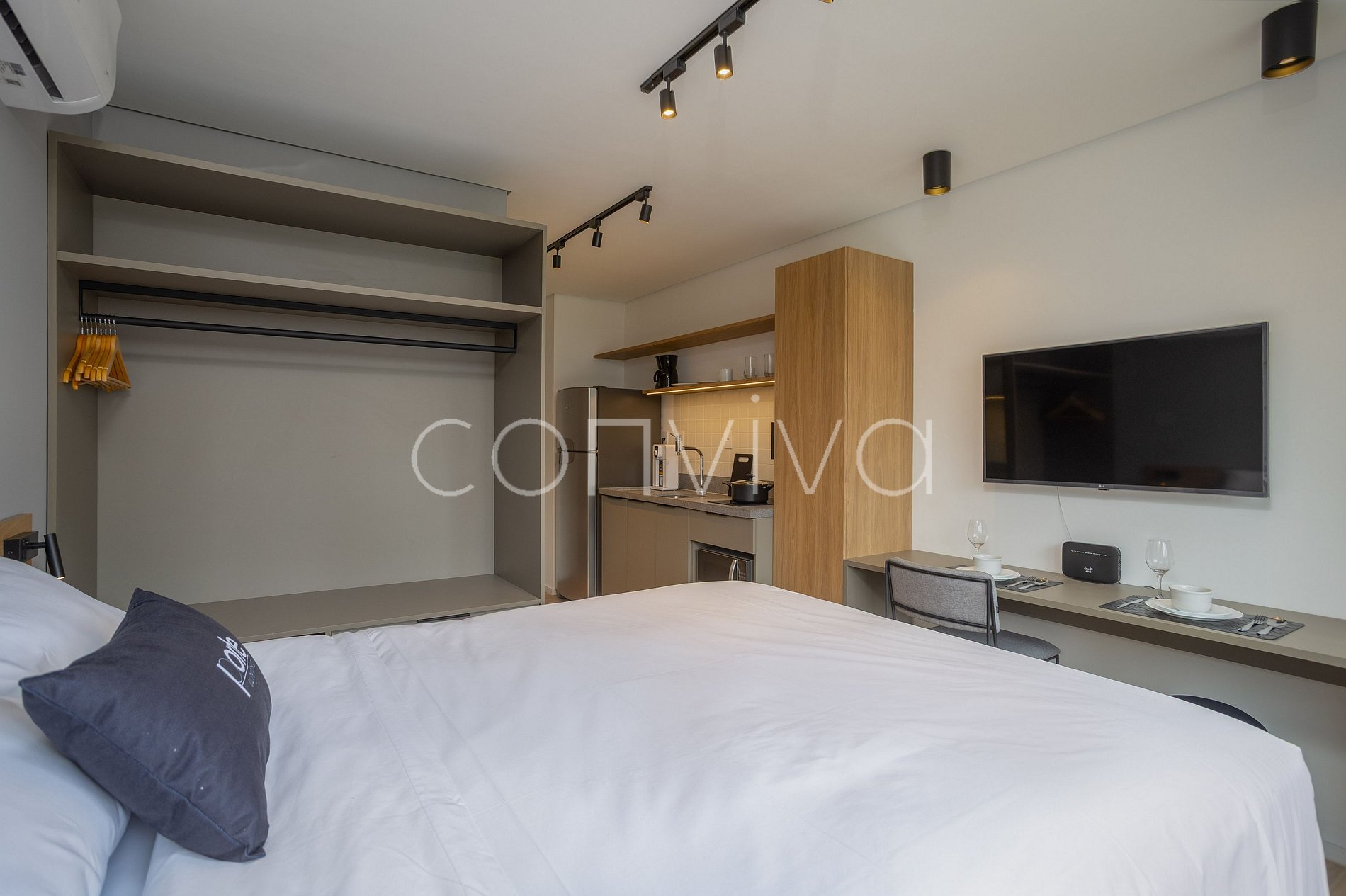 Studio de 25m², no 7º andar, com uma cama queen size, cozinha compacta, banheiro e varanda.