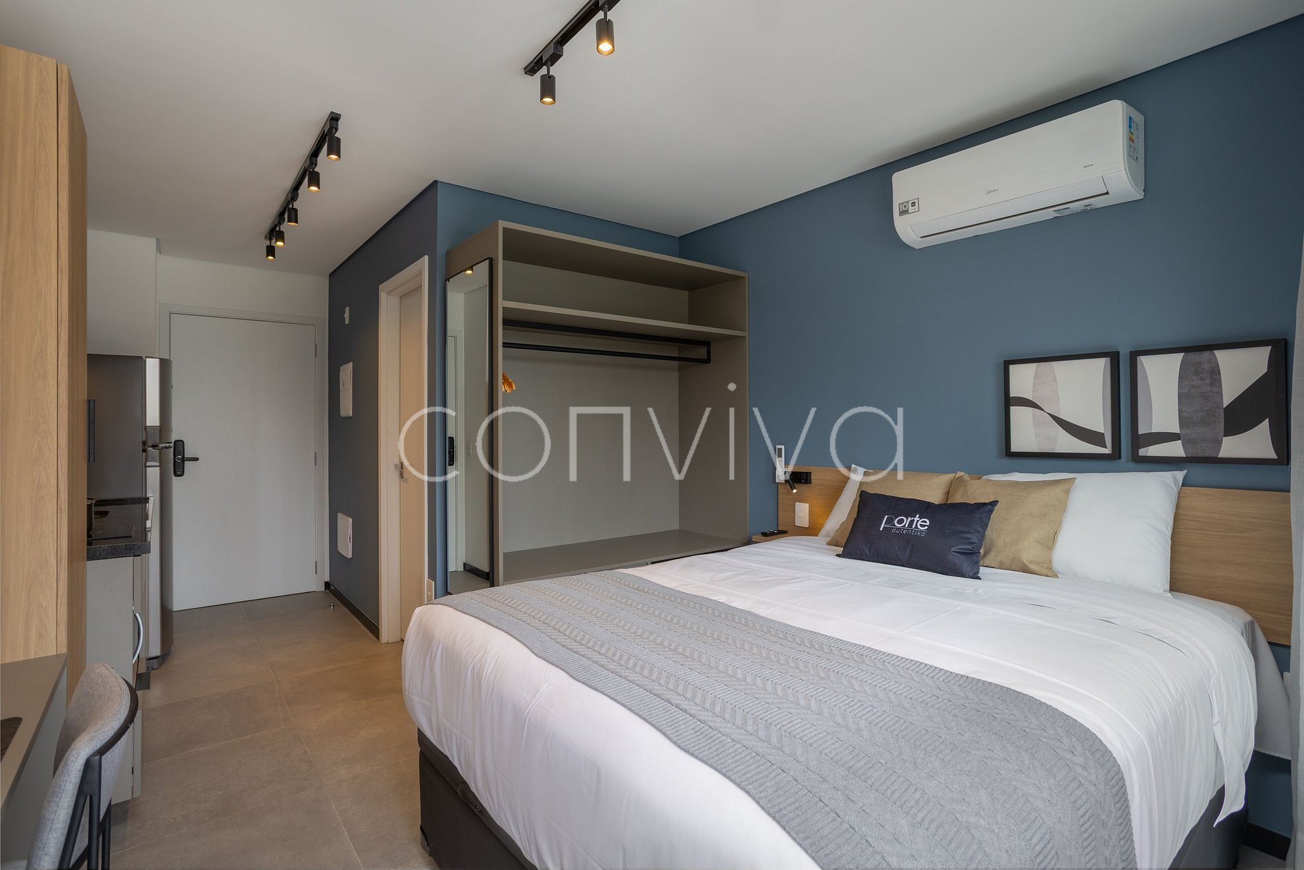 Studio de 25m², no 7º andar, com uma cama queen size, cozinha compacta, banheiro e varanda.