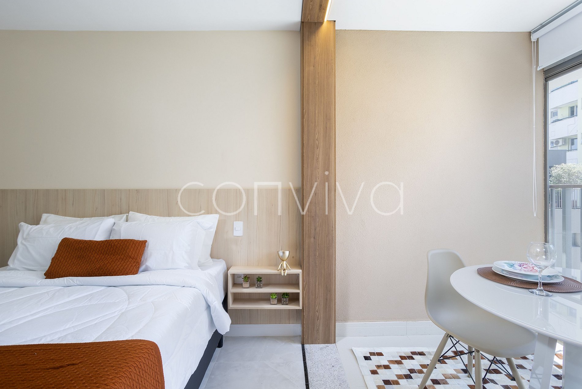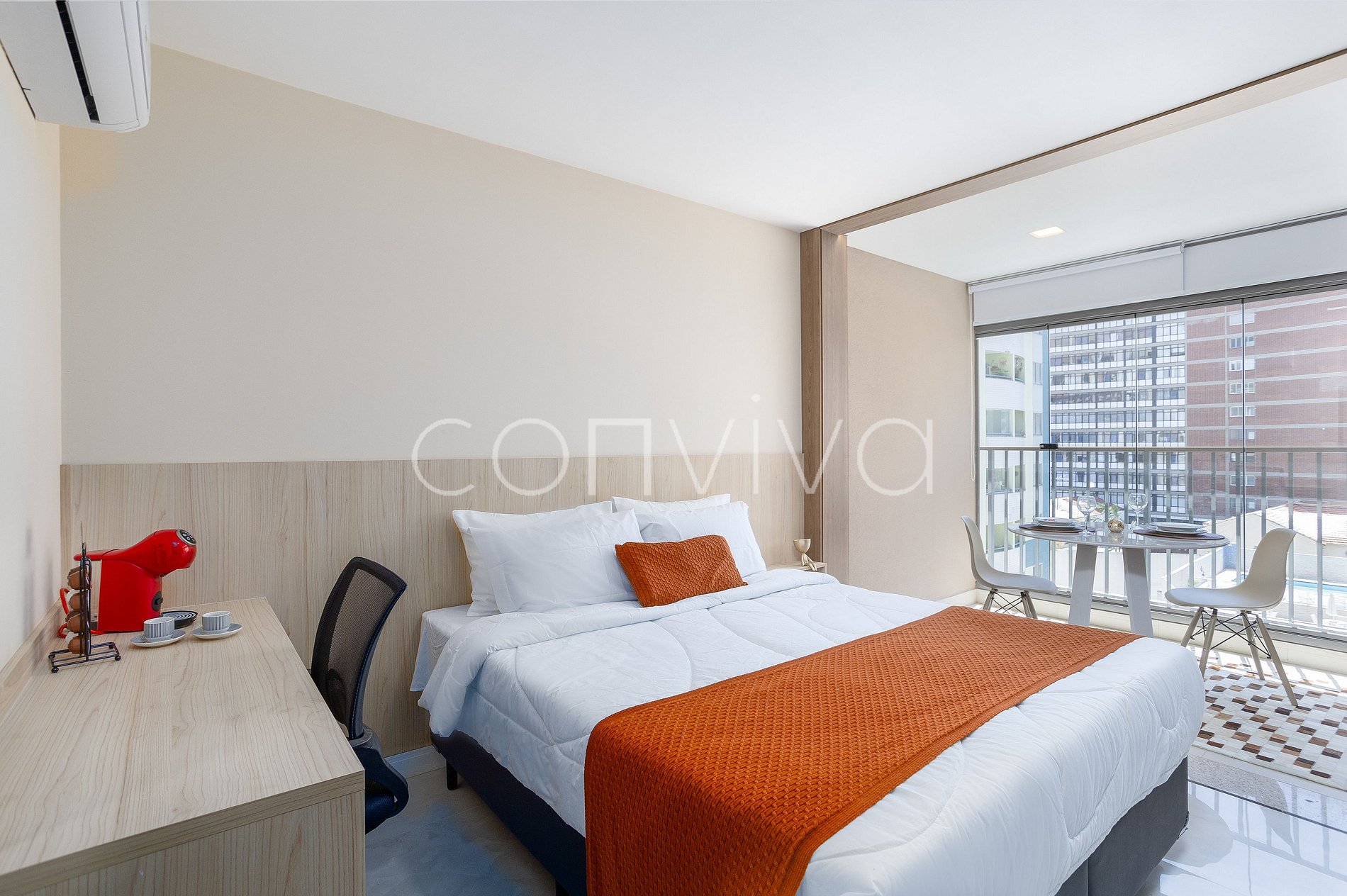 The 28m² space, on the 5th floor, has a double bed, full kitchen, bathroom and balcony with dining table.