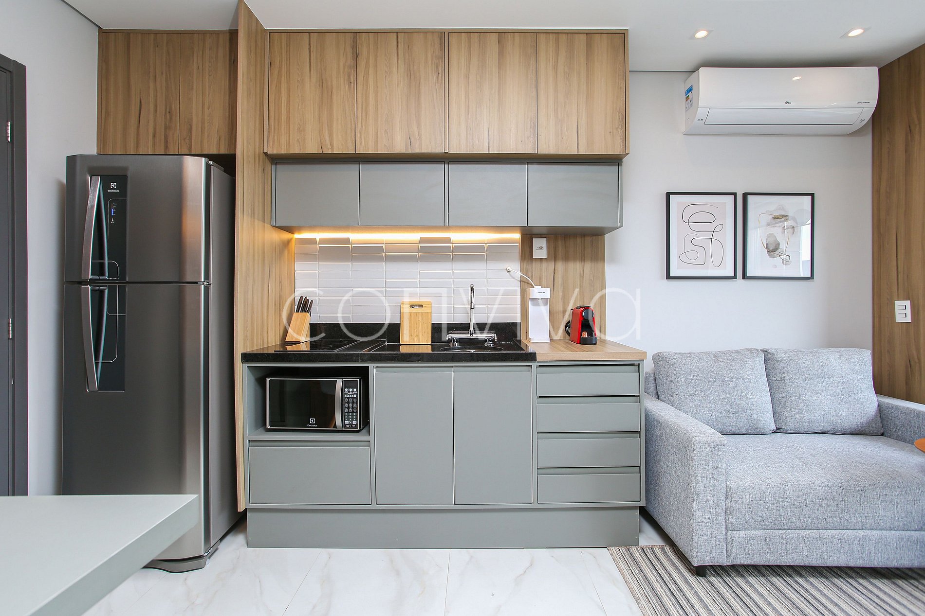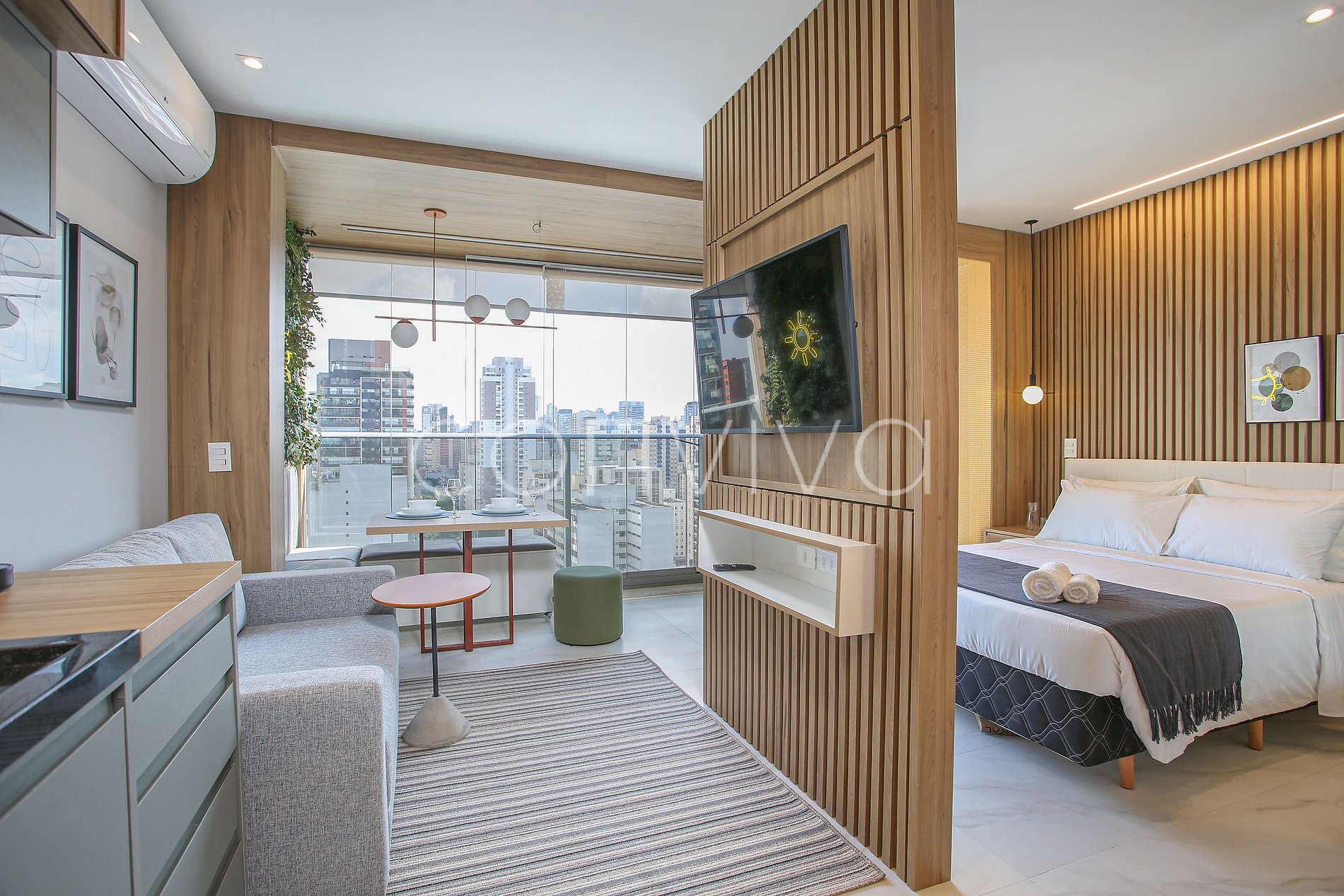 A 30m² space on the 16th floor. With a double bed, sofa, bathroom and kitchenette in the best location in Pinheiros.