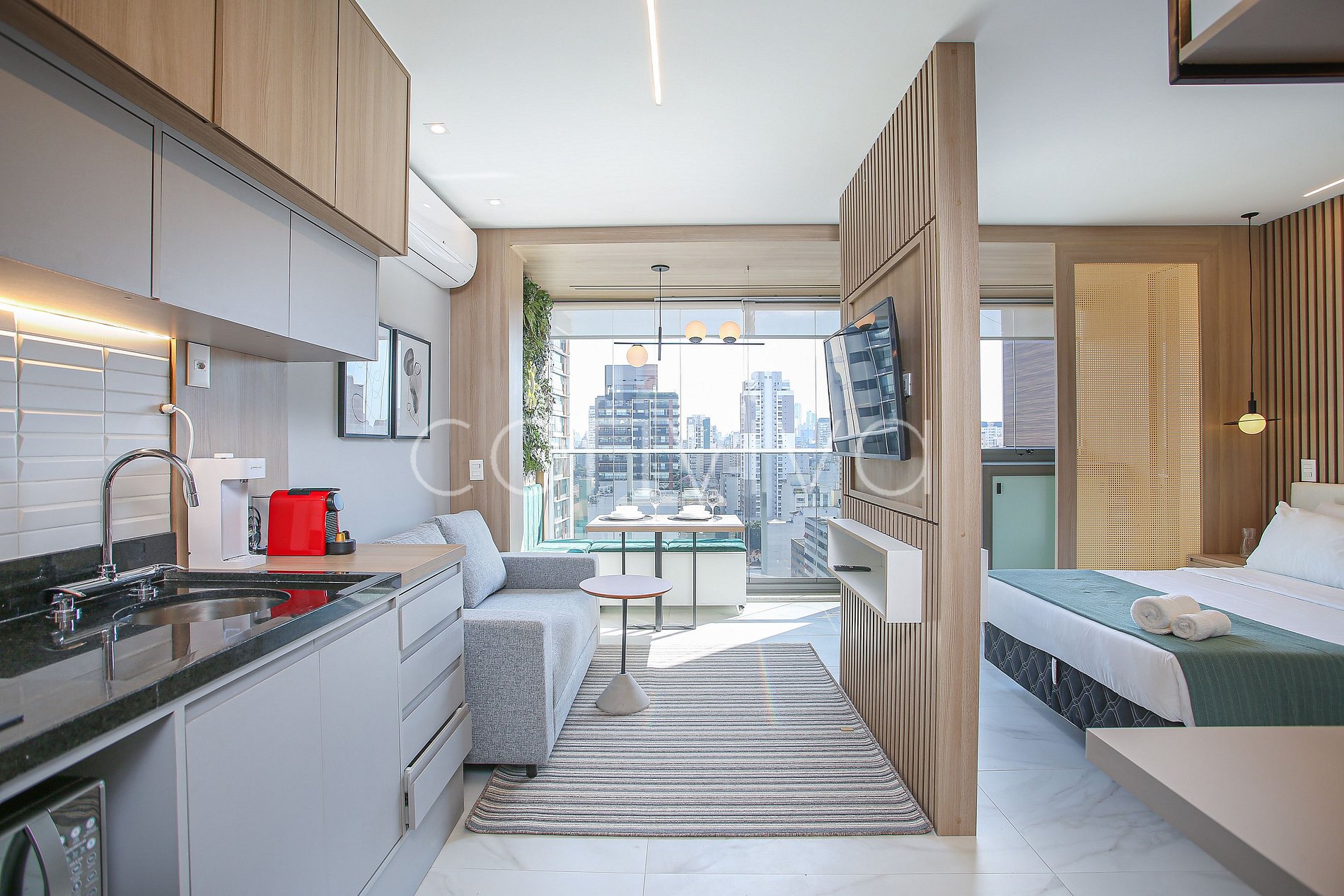 A 30m² space on the 17th floor. With a double bed, sofa, bathroom and kitchenette in the best location in Pinheiros.