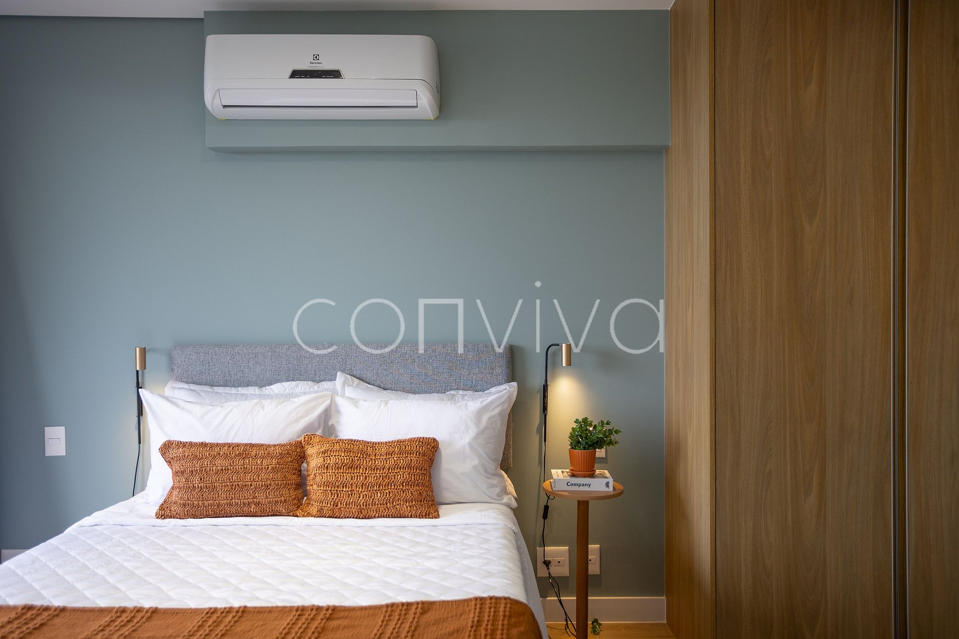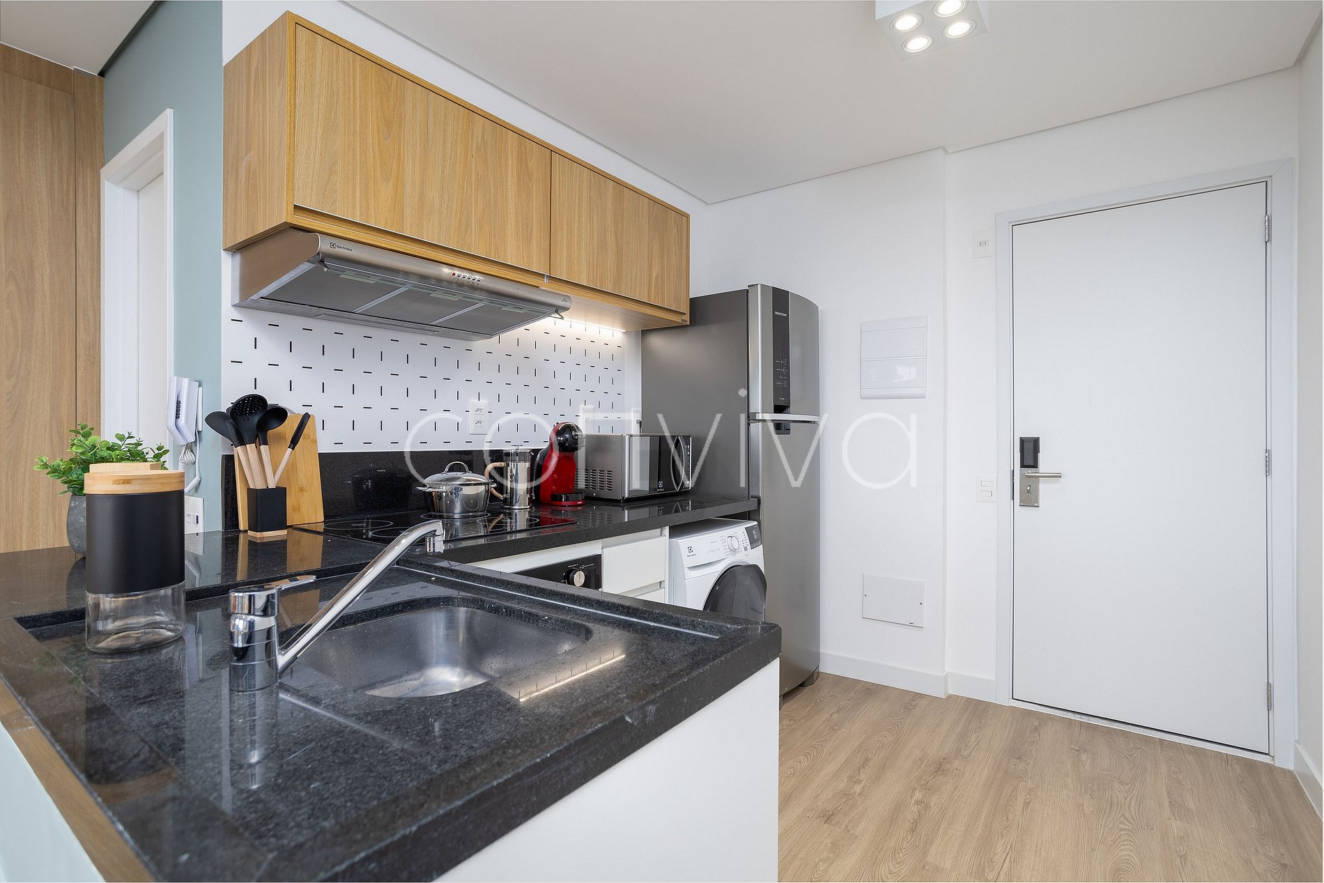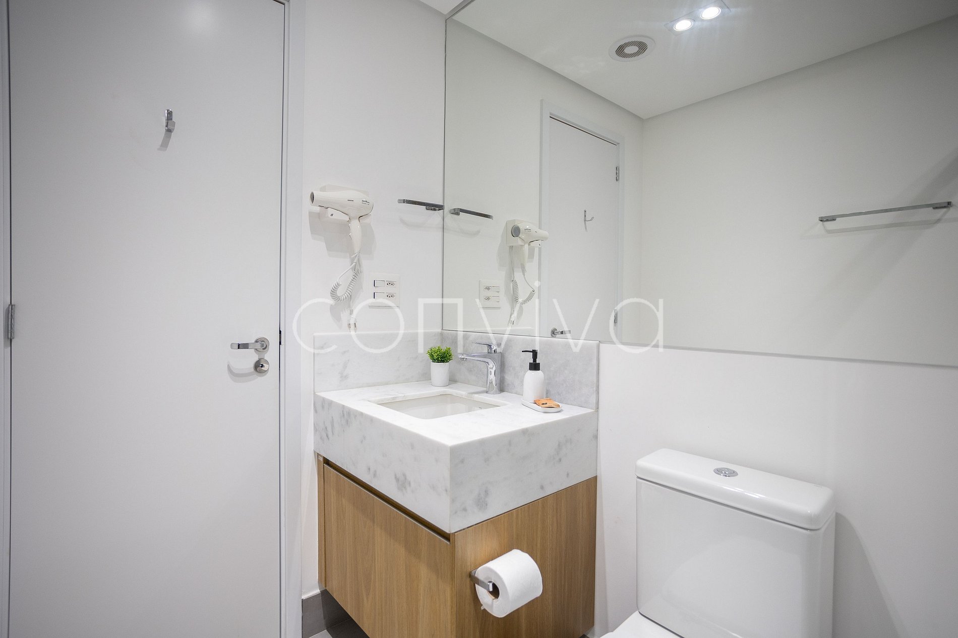 A 38m² space, on the 19th floor, with a queen bed, sofa, bathroom, full kitchen and balcony with a privileged view of the Jockey Club.