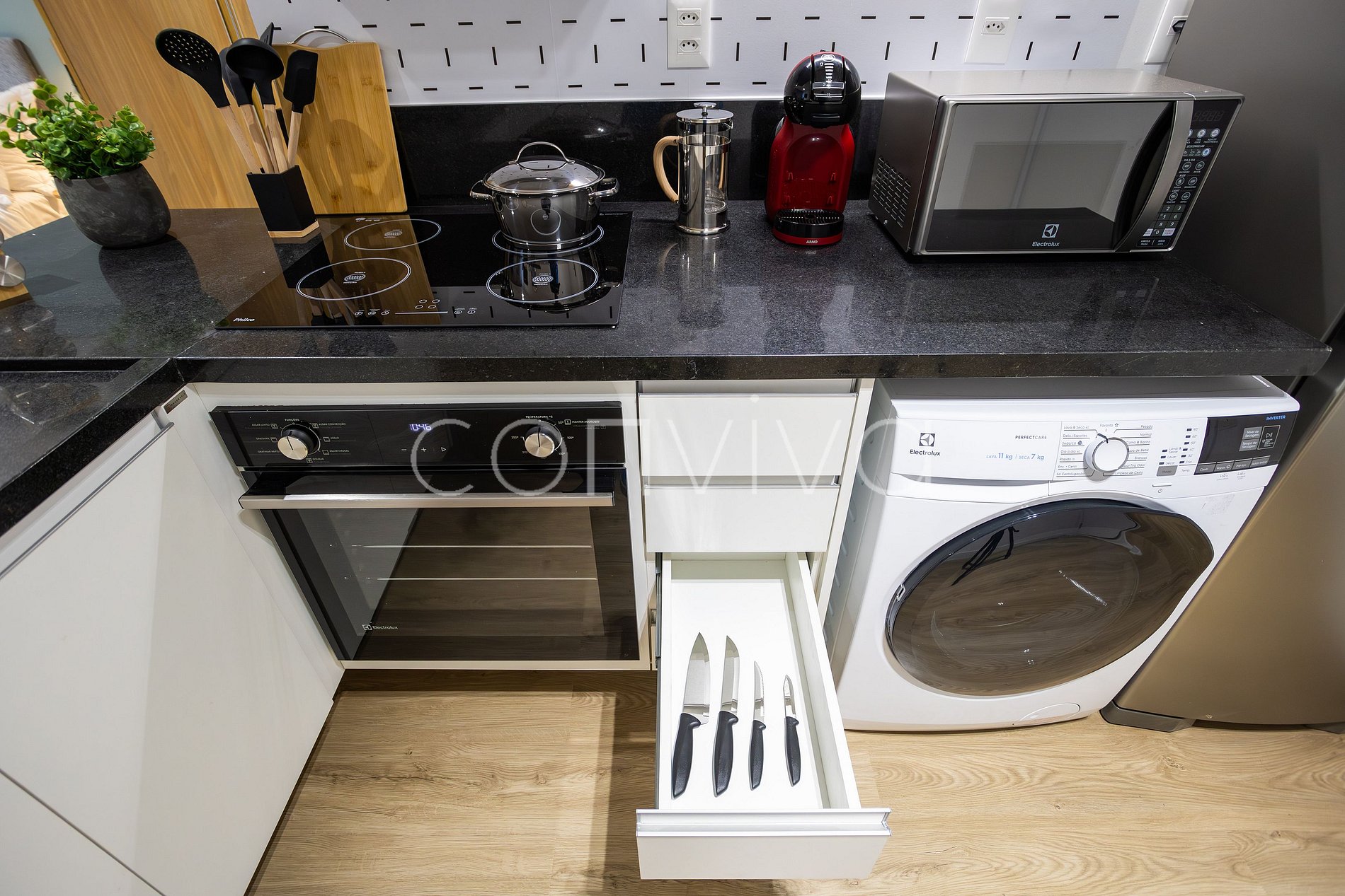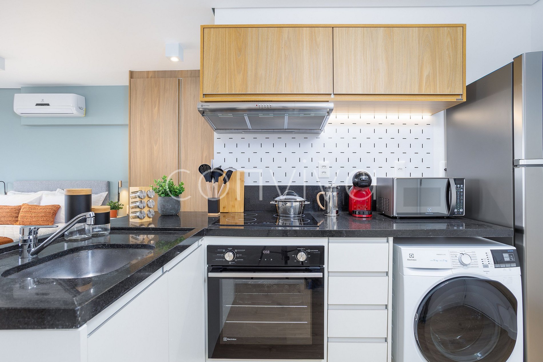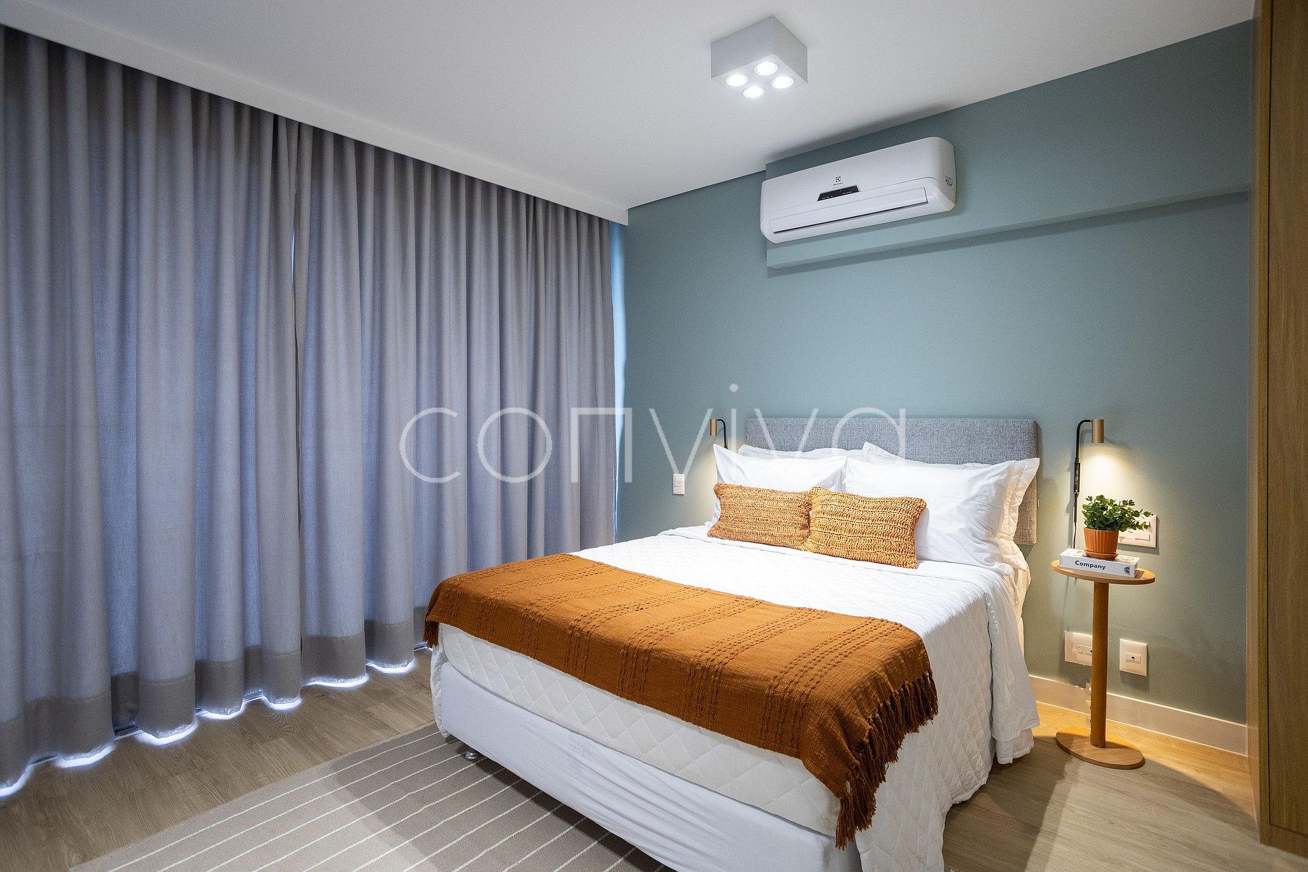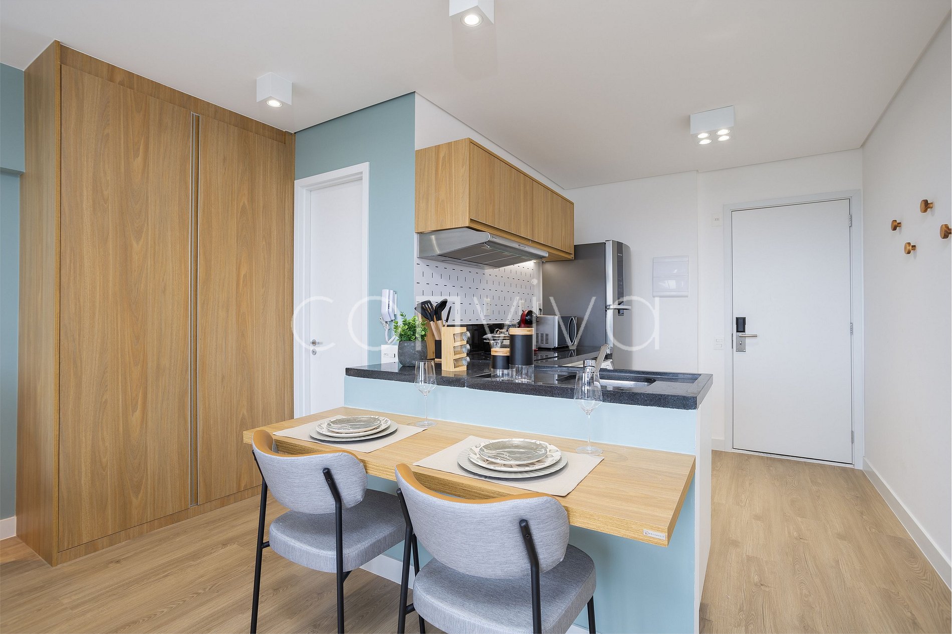 A 38m² space, on the 19th floor, with a queen bed, sofa, bathroom, full kitchen and balcony with a privileged view of the Jockey Club.