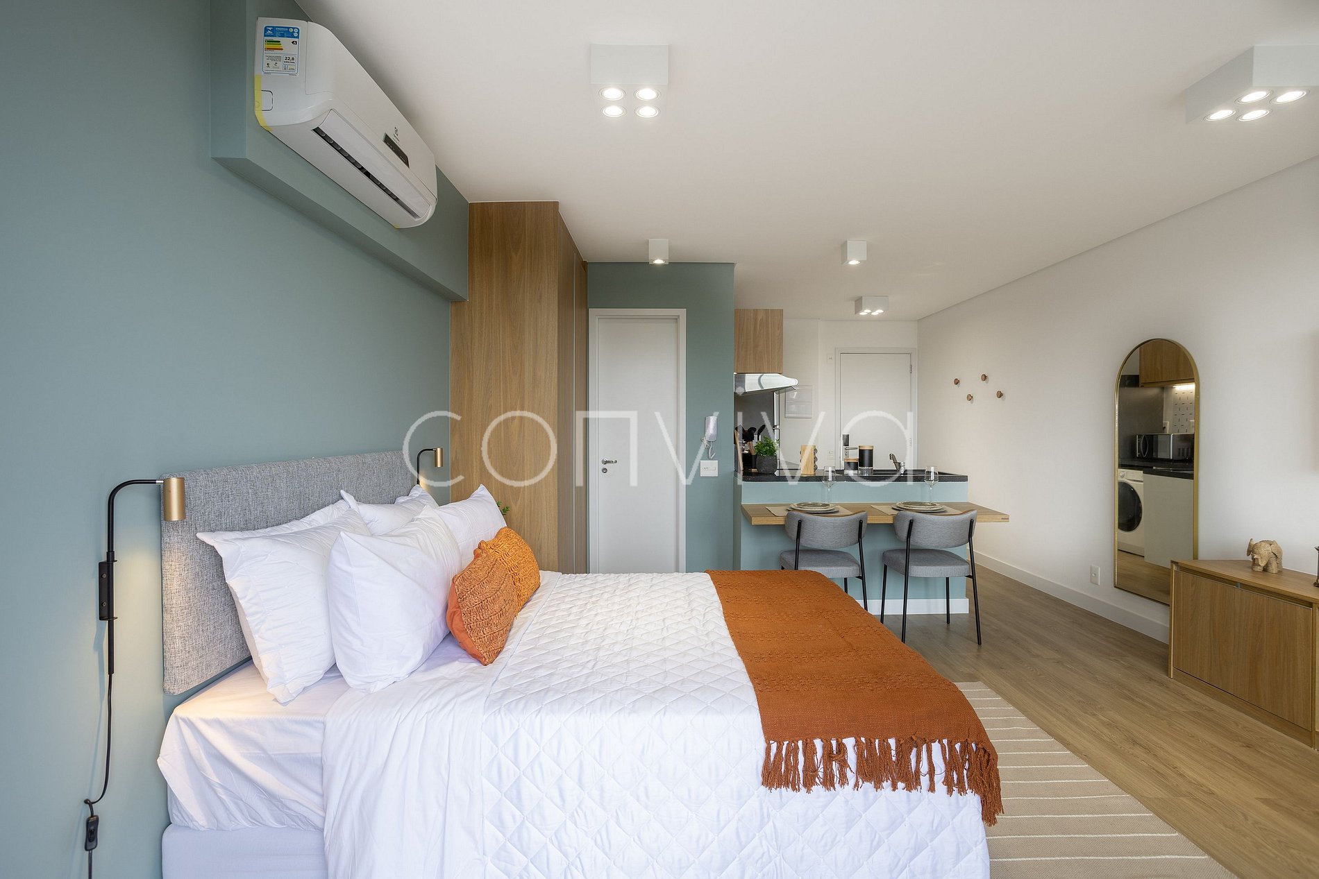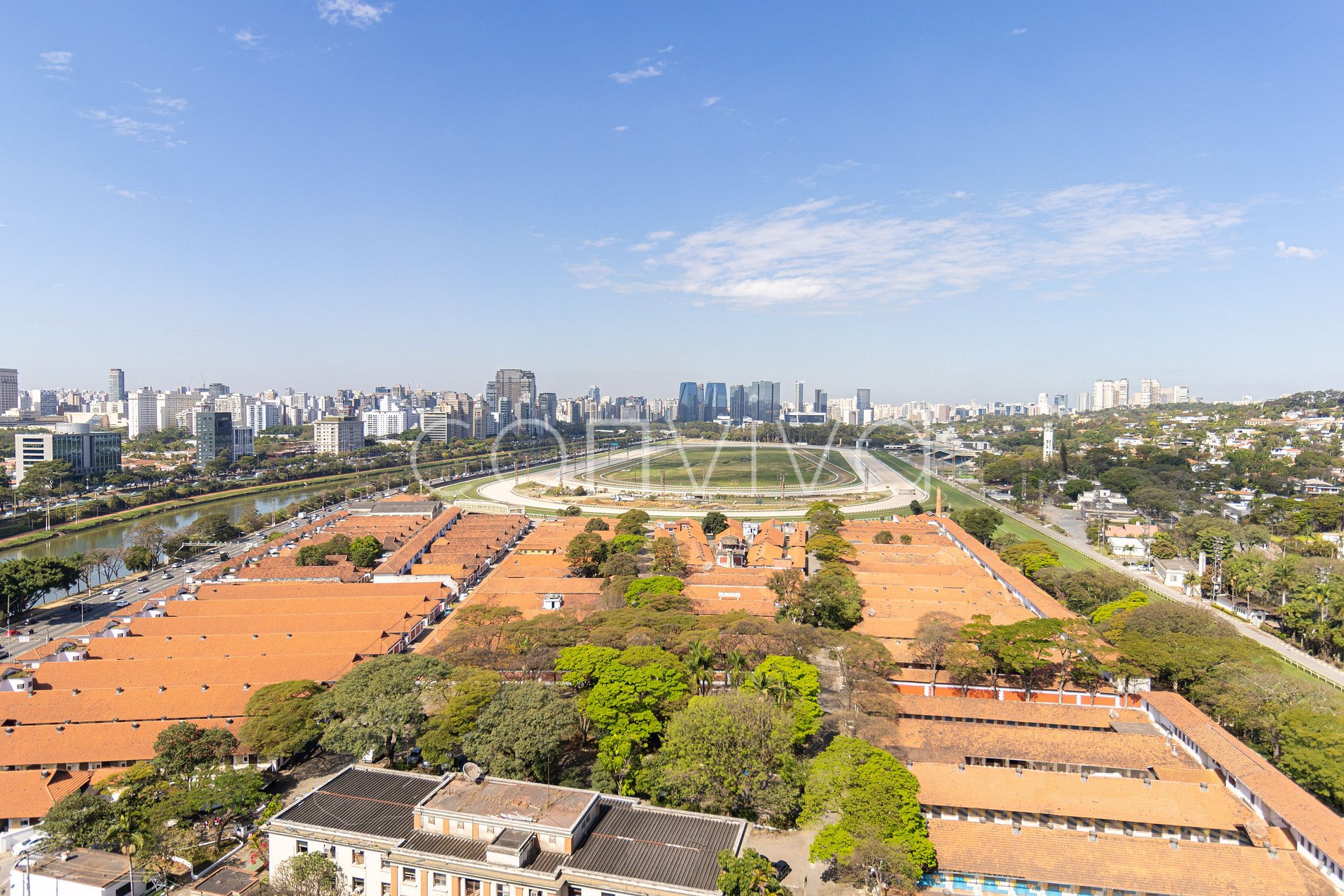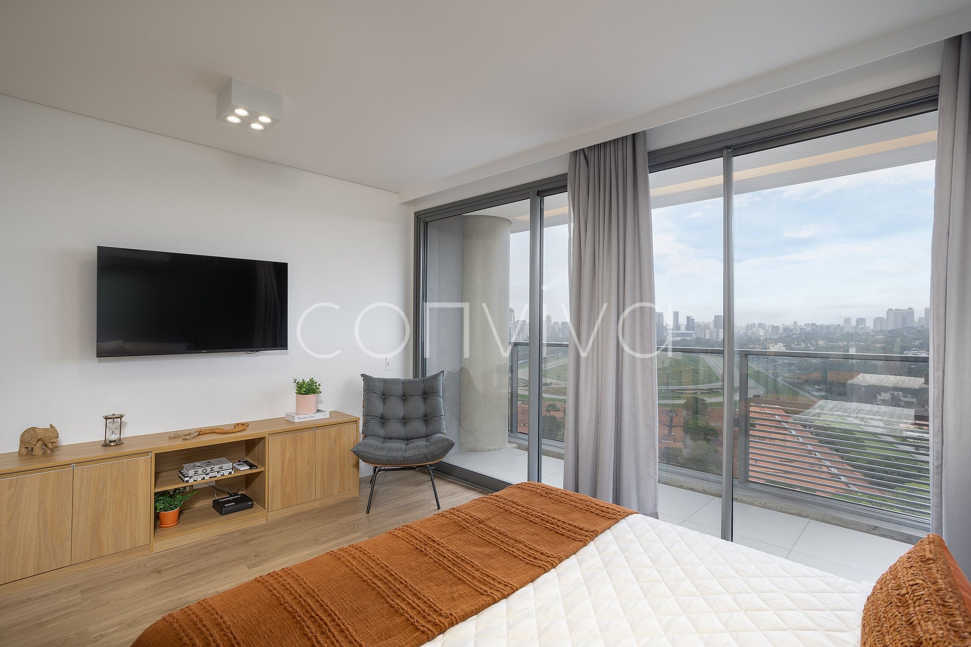 A 38m² space, on the 19th floor, with a queen bed, sofa, bathroom, full kitchen and balcony with a privileged view of the Jockey Club.
