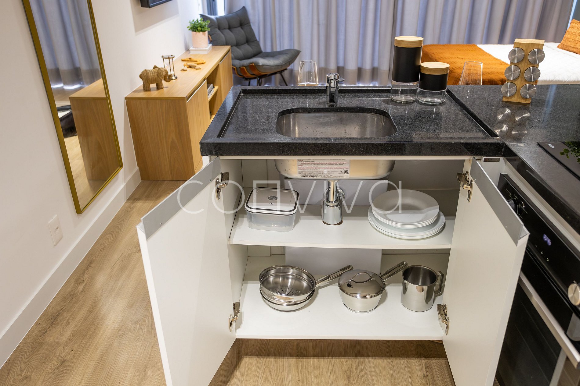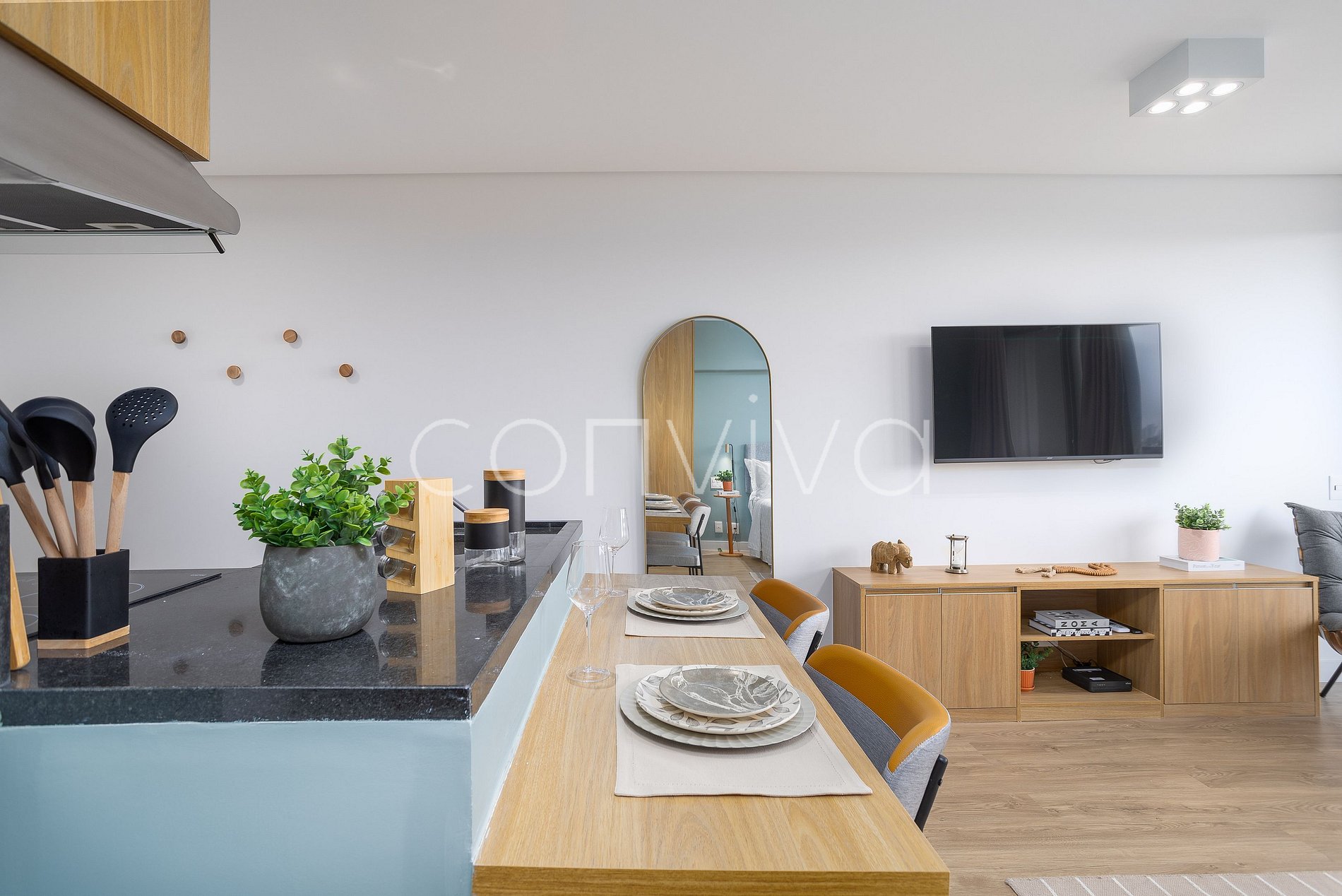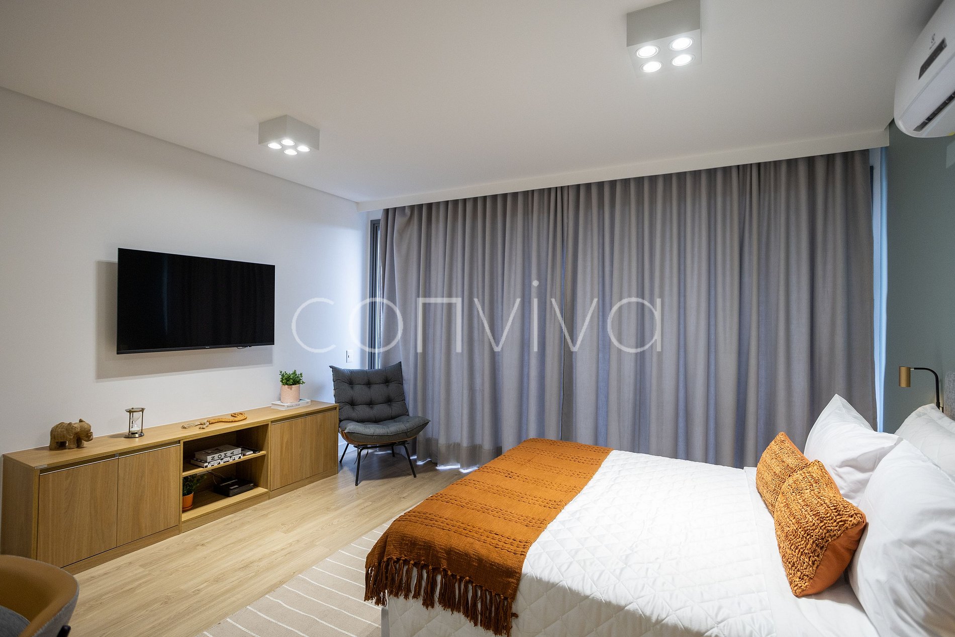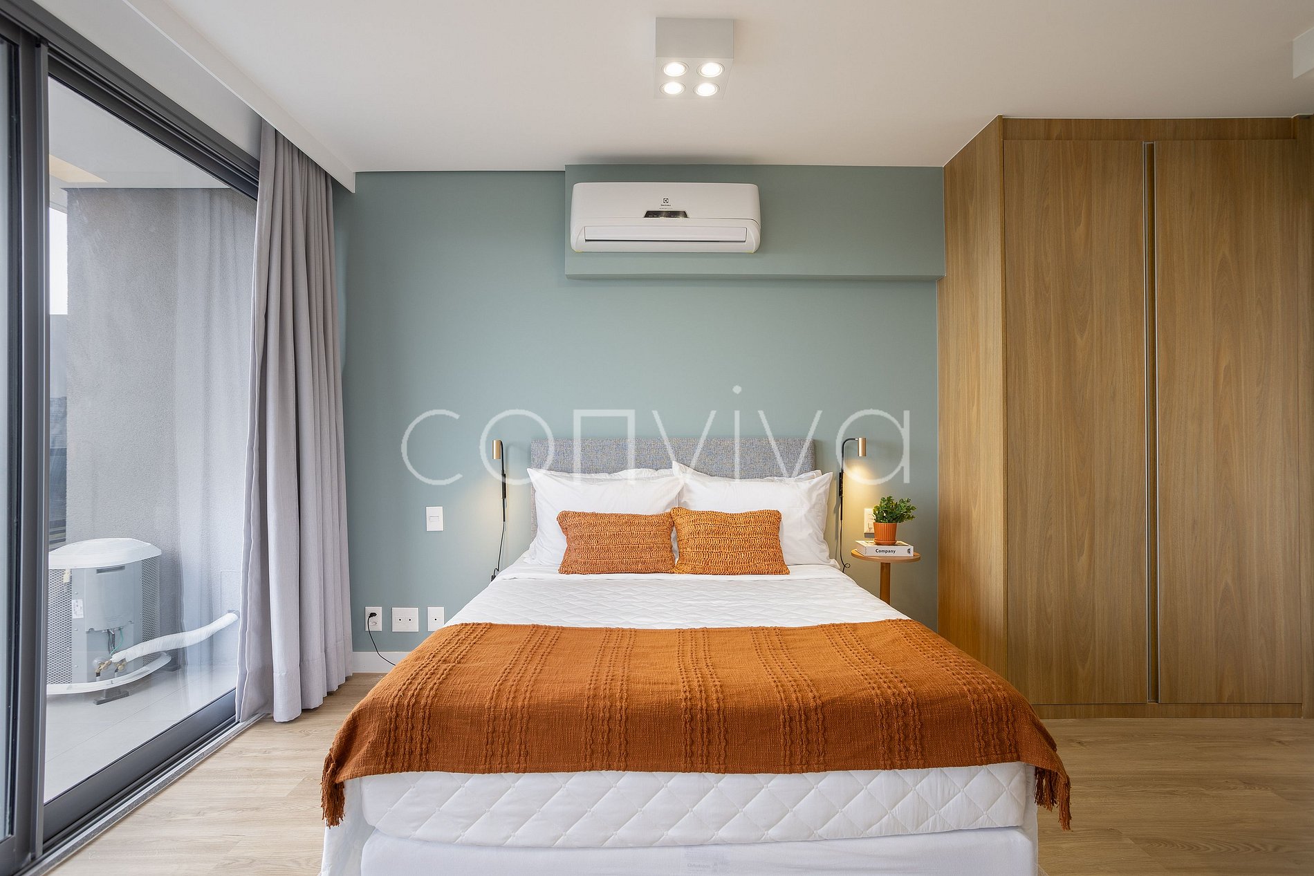A 38m² space, on the 19th floor, with a queen bed, sofa, bathroom, full kitchen and balcony with a privileged view of the Jockey Club.