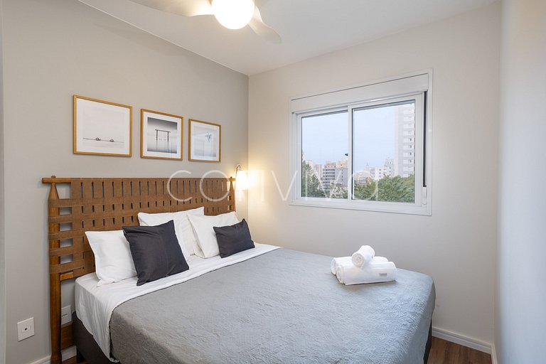 A 35 m² space, on the 4th floor, with a bedroom with a queen bed and another bedroom with a single bed, a spacious bathroom and a fully-equipped kitchen.