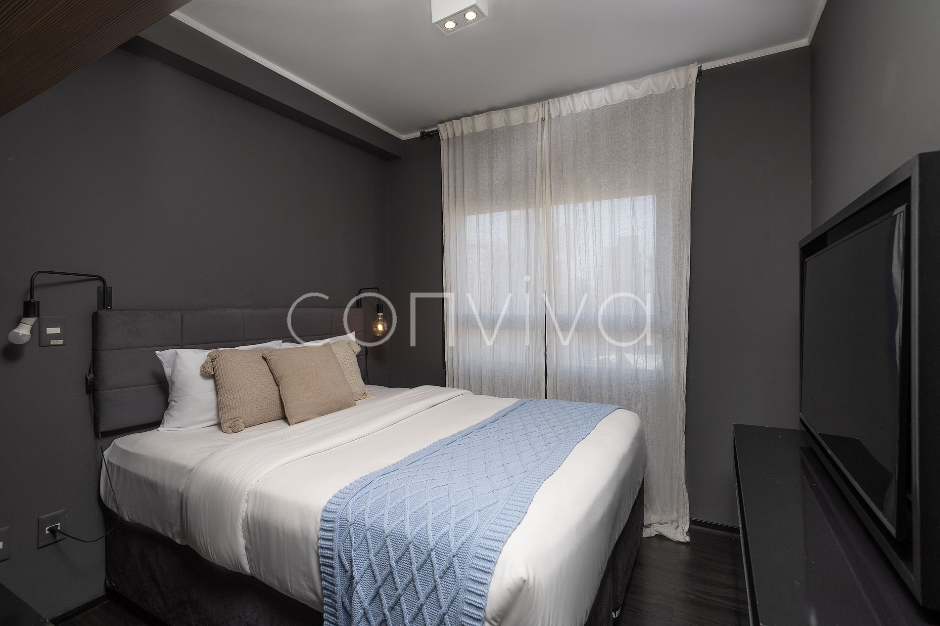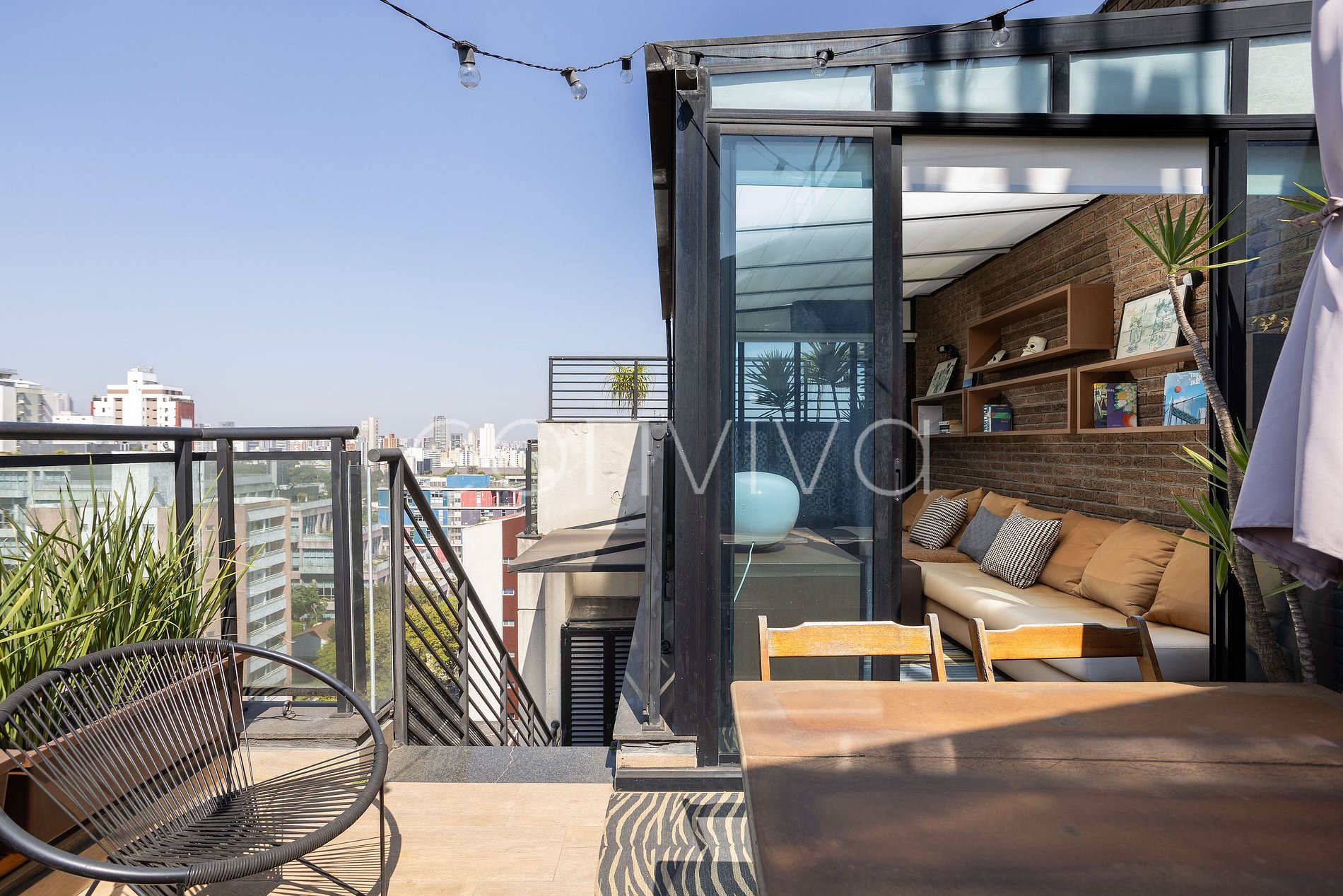 Cobertura duplex de 63m² no 8º andar, localizado na Vila Madalena, com um ambiente integrado, o espaço conta com cama queen size, sofá confortável, banheiro espaçoso, cozinha equipada, terraço privativo e sala de TV!