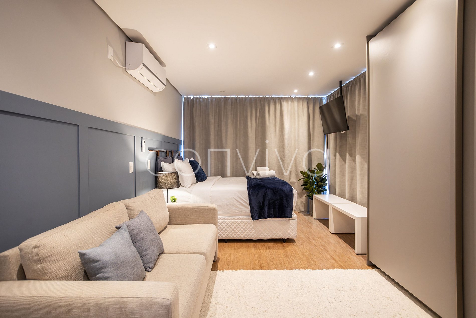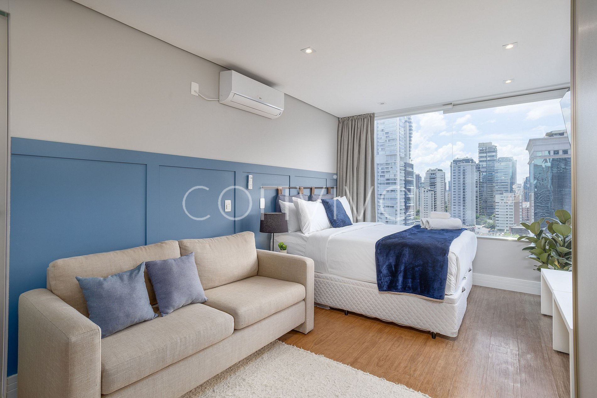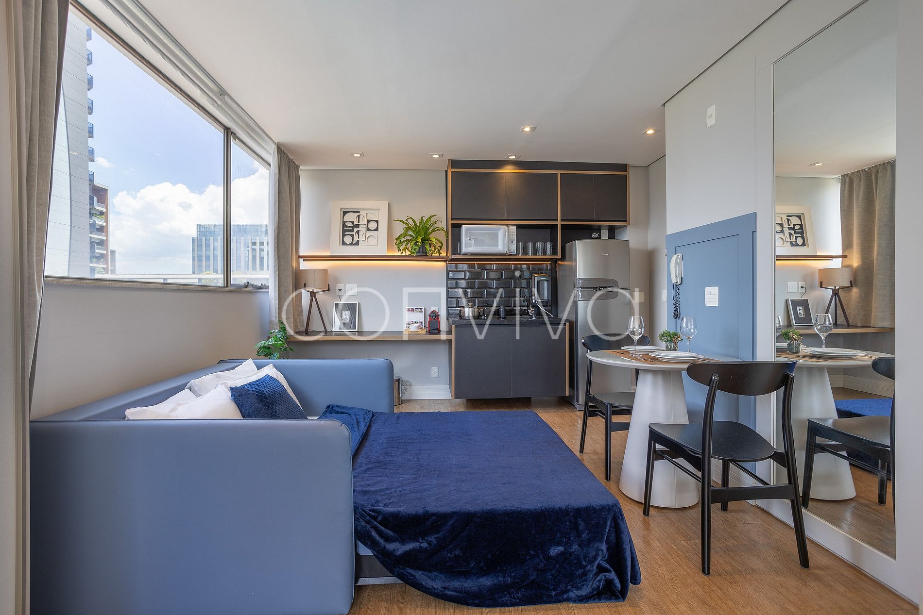 El espacio de 40m², en el 14º piso, dispone de cama de matrimonio, sofá cama, cuarto de baño y cocina americana con todos los utensilios necesarios para preparar sus comidas.