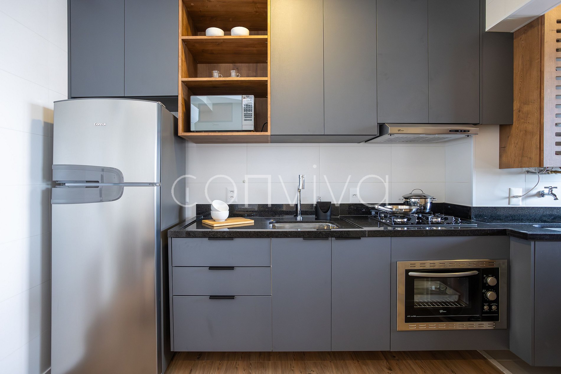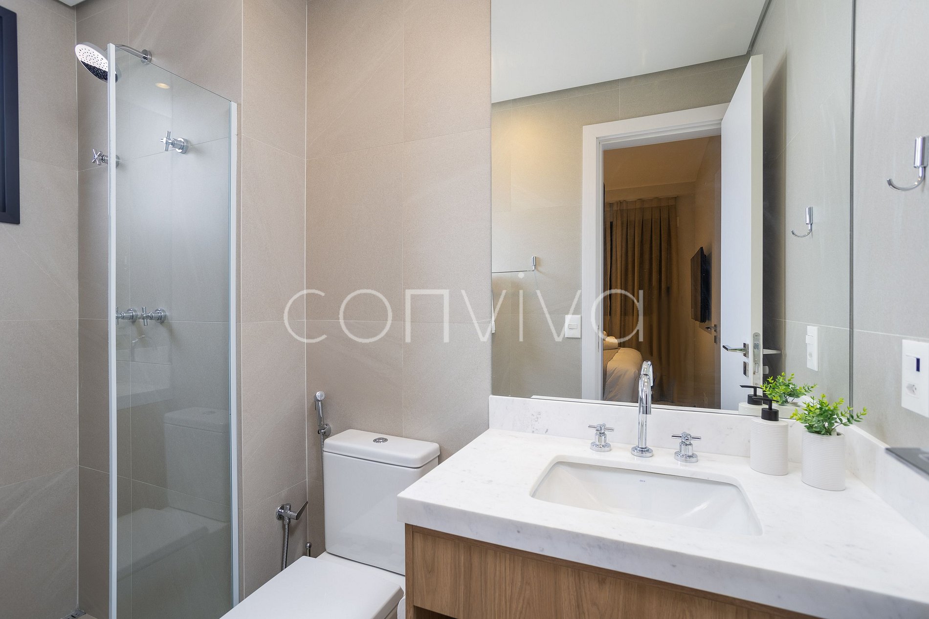 Espacio de 48m², en el piso 18, con cama queen size, baño, sofá y cocina. En la mejor ubicación de Pinheiros, junto al metro Faria Lima.