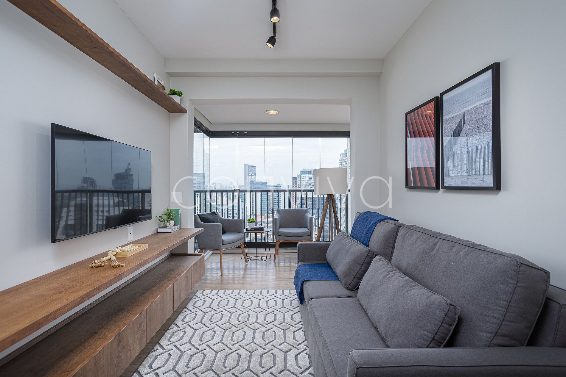 Espacio de 48m², en el piso 18, con cama queen size, baño, sofá y cocina. En la mejor ubicación de Pinheiros, junto al metro Faria Lima.