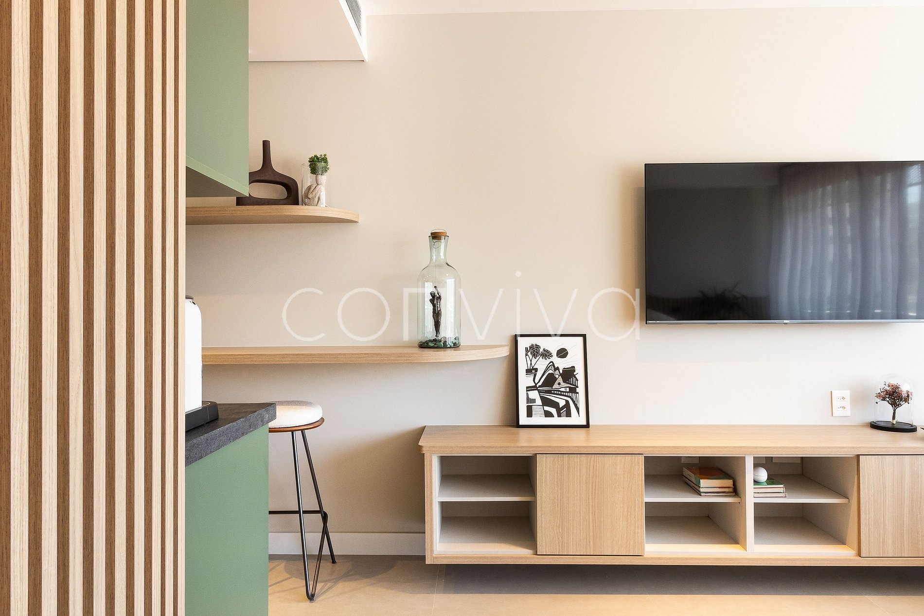 El apartamento de 36m², en el 3er piso, tiene una cama queen size, baño, cocina completa, espacio de oficina en casa, en la mejor ubicación en Pinheiros.