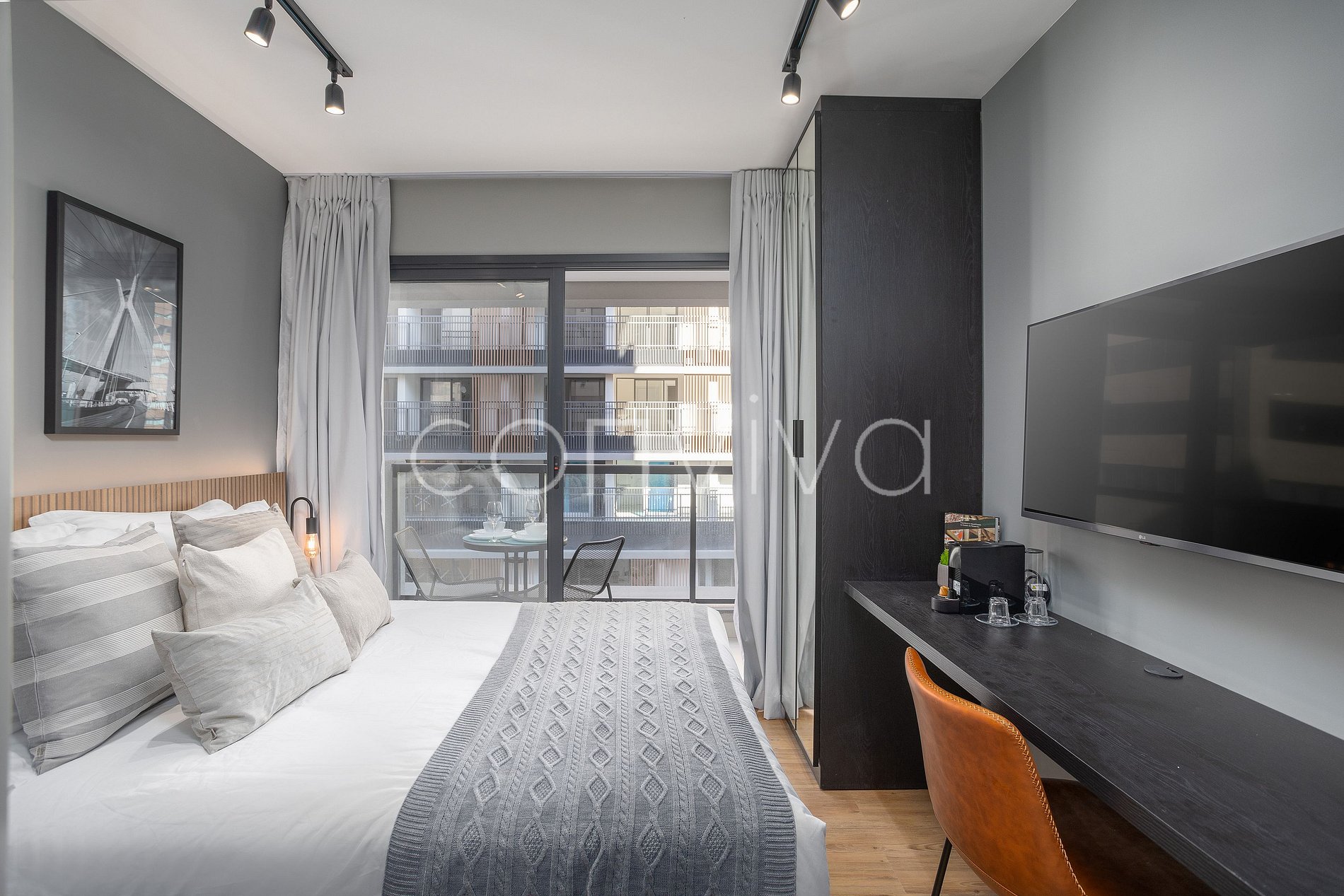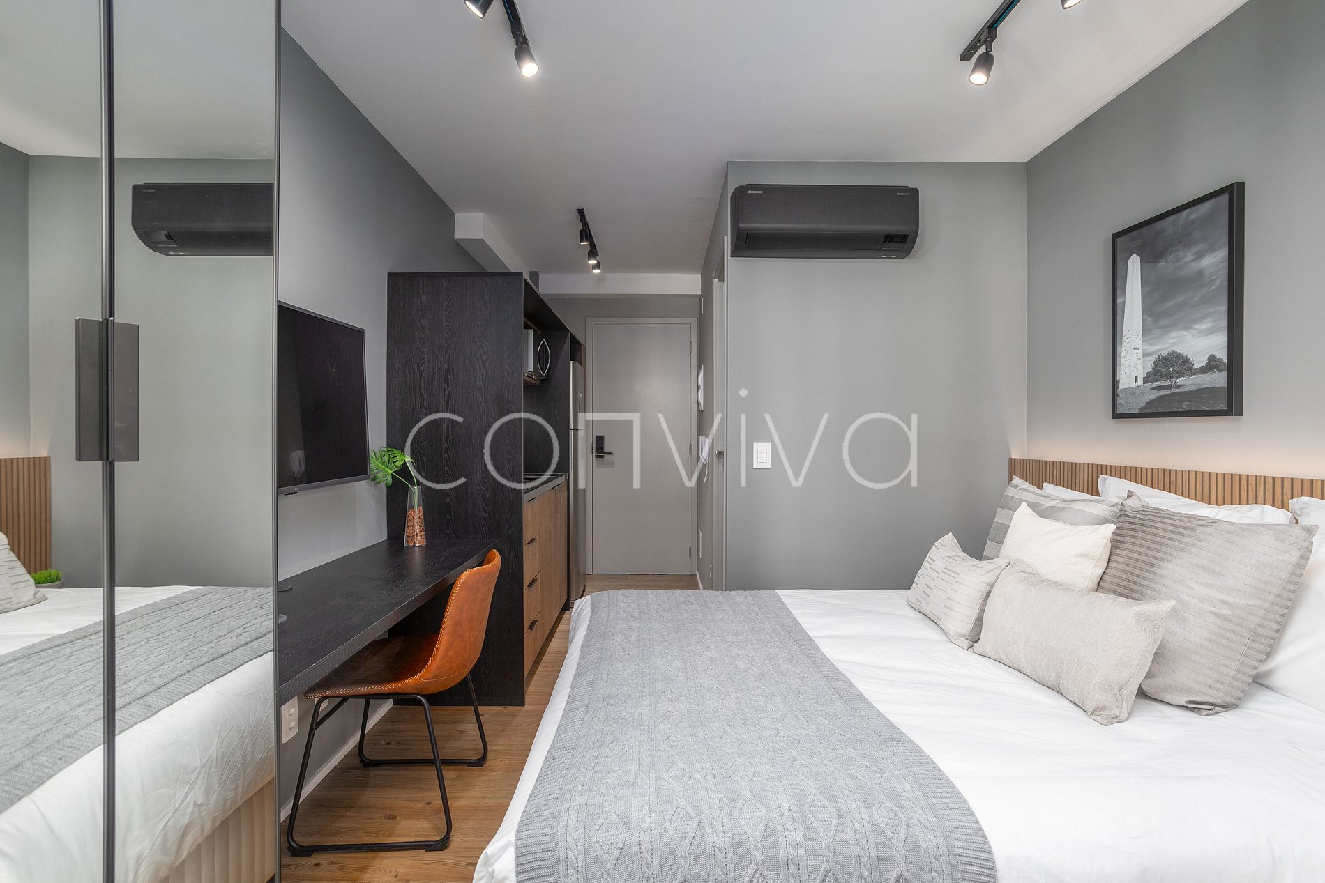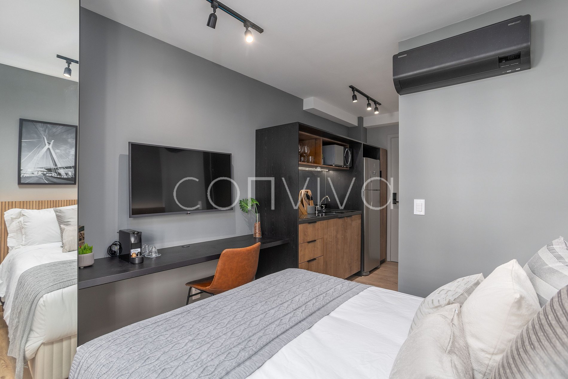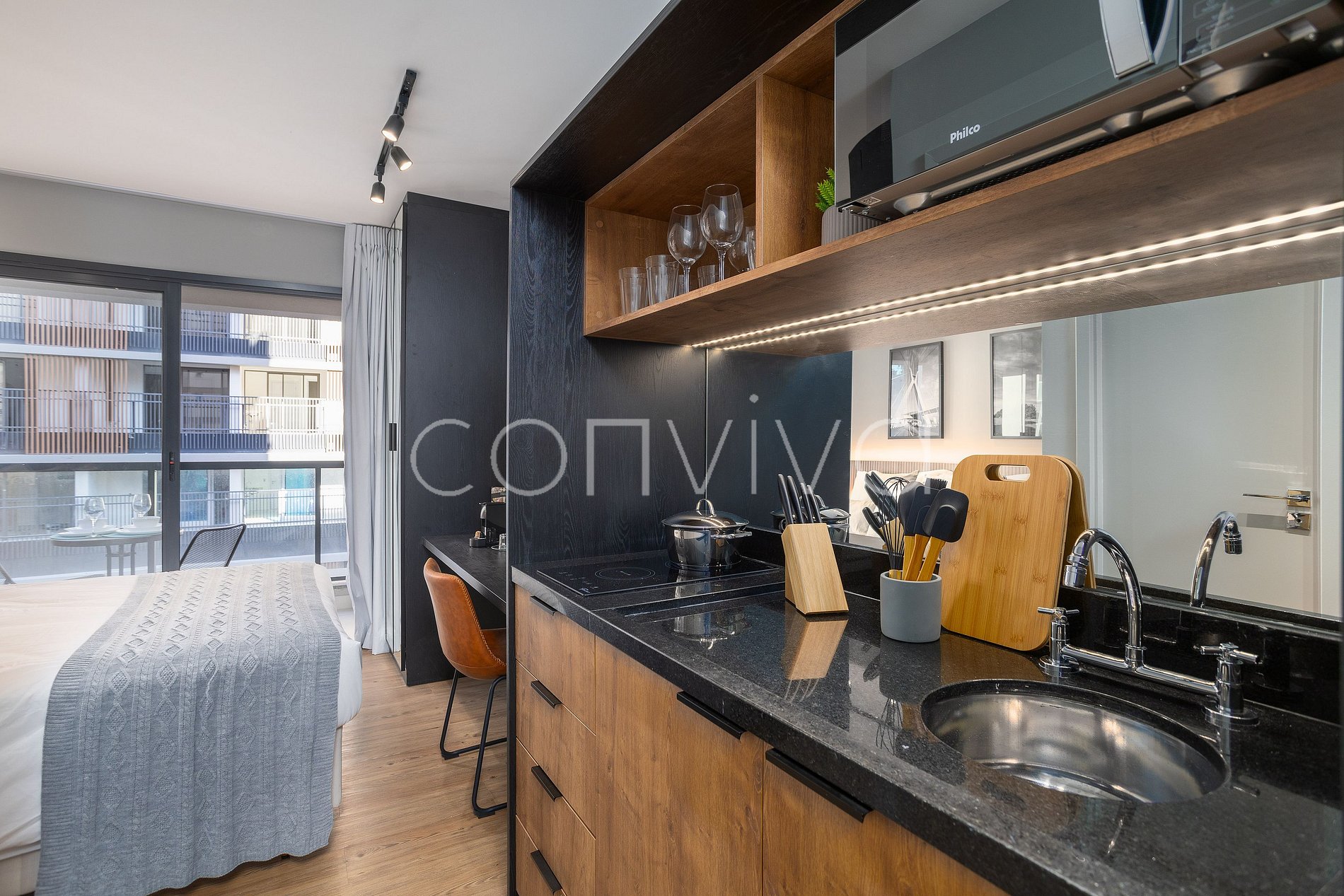 Espacio de 21m², en el 5º piso, con cama de matrimonio, baño, balcón y cocina completa.