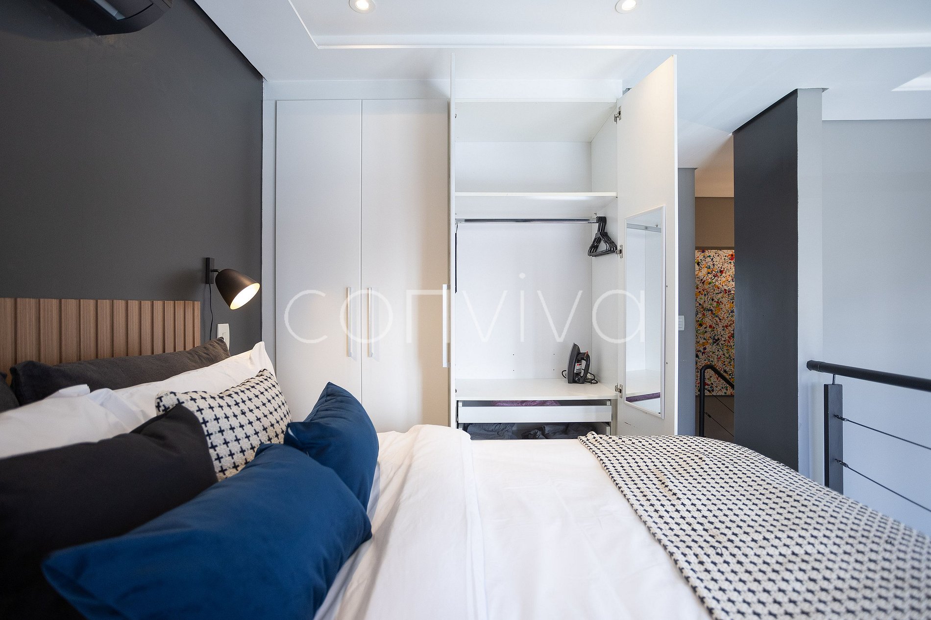 Con 48m², en el 4 º piso, el dúplex tiene dos plantas, suite con cama de matrimonio y amplio cuarto de baño, amplio salón con sofá retráctil y espacio de oficina en casa, cocina completa bien equipada, con limpieza básica incluida.