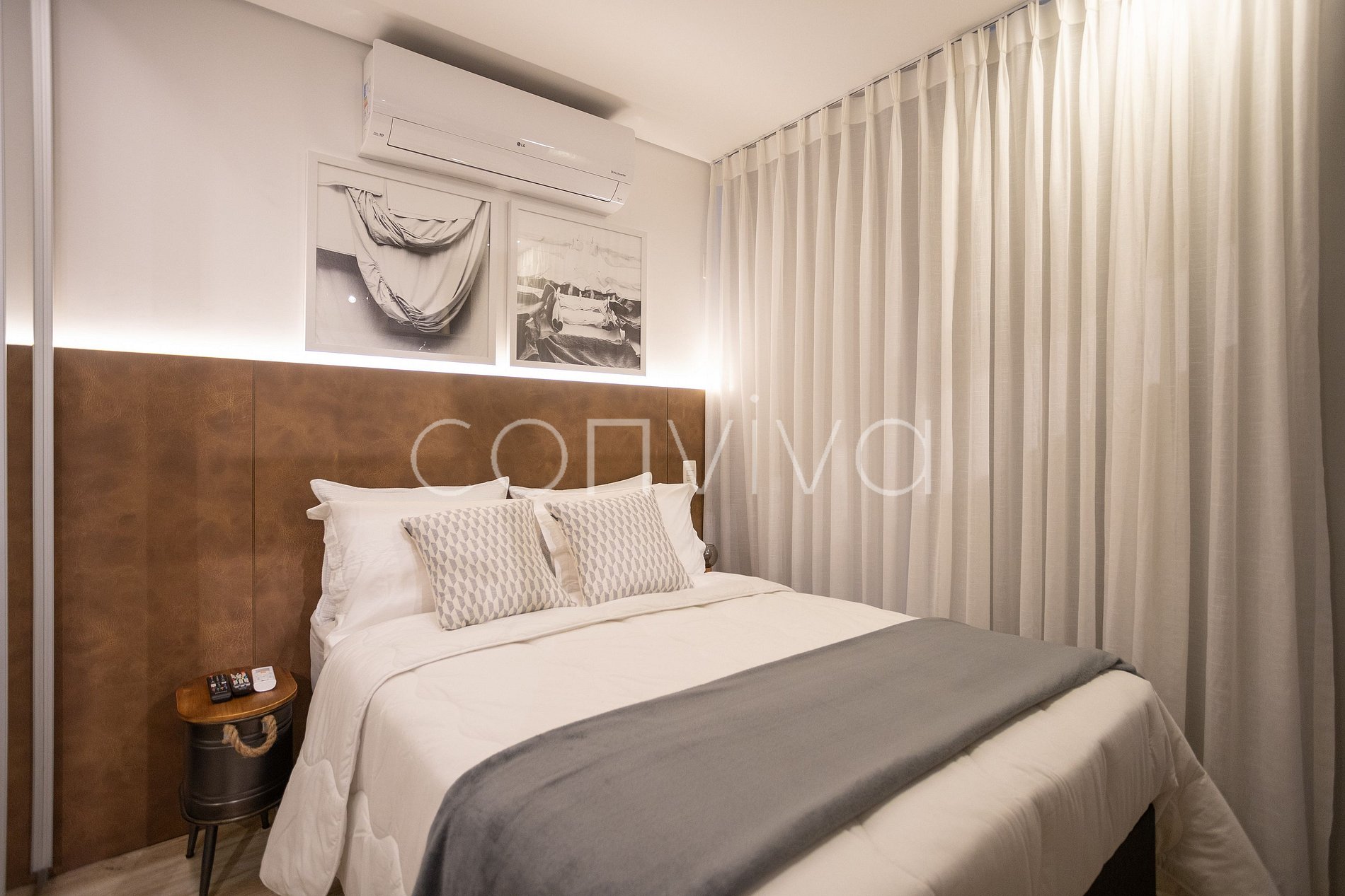 Un espacio de 44m², en el 9º piso, muy bien decorado, con cama queen size, sofá, baño, cocina completa, amplio balcón con home office y lavadero.