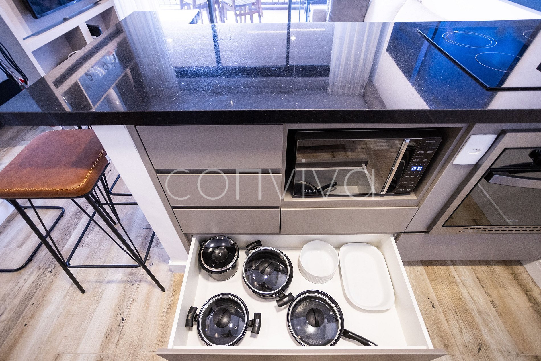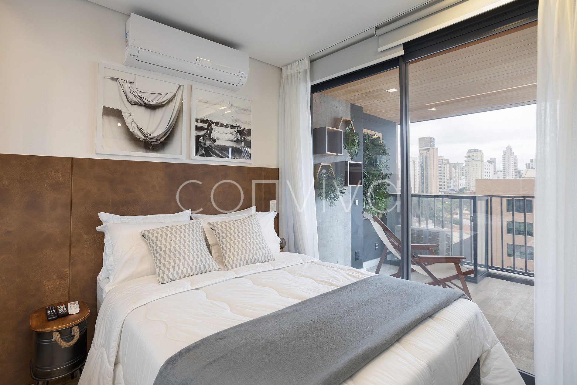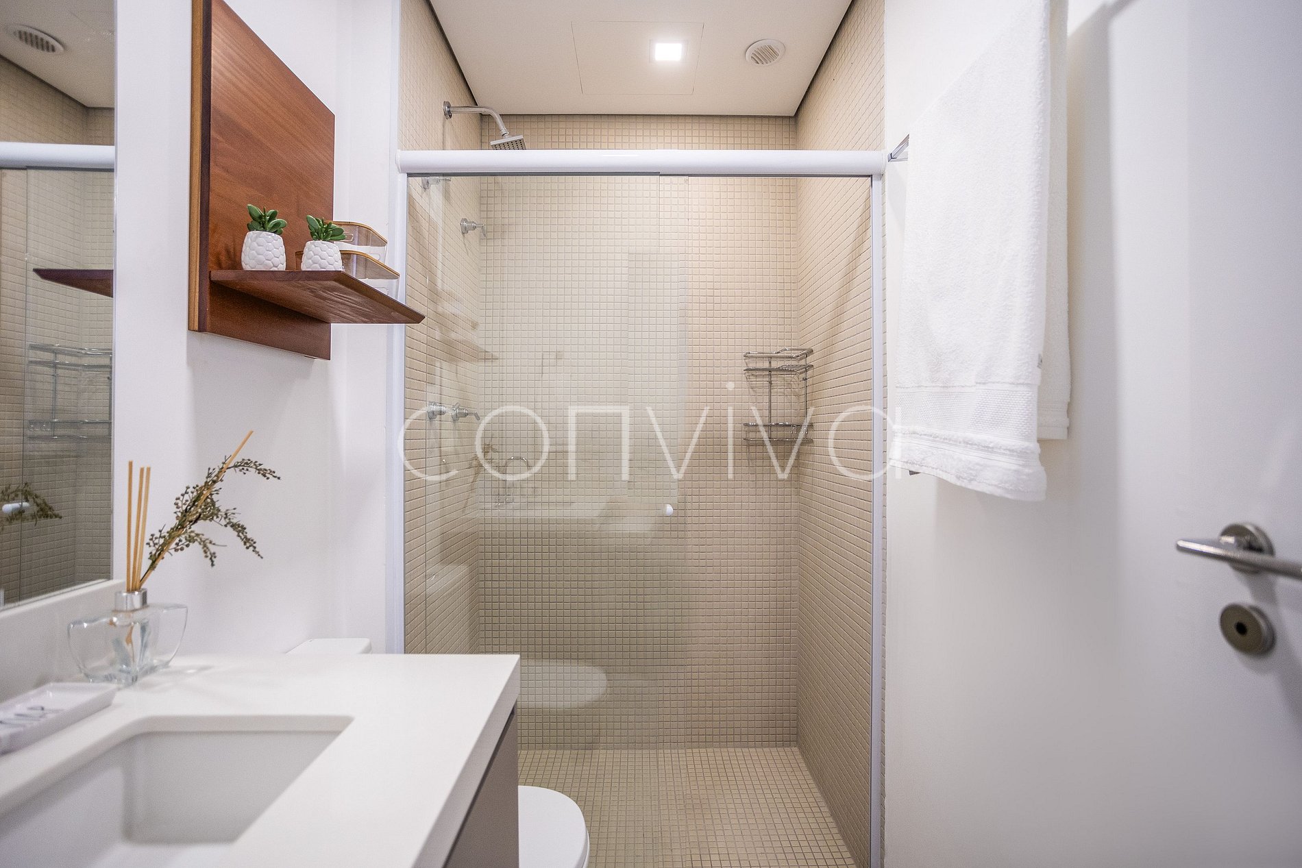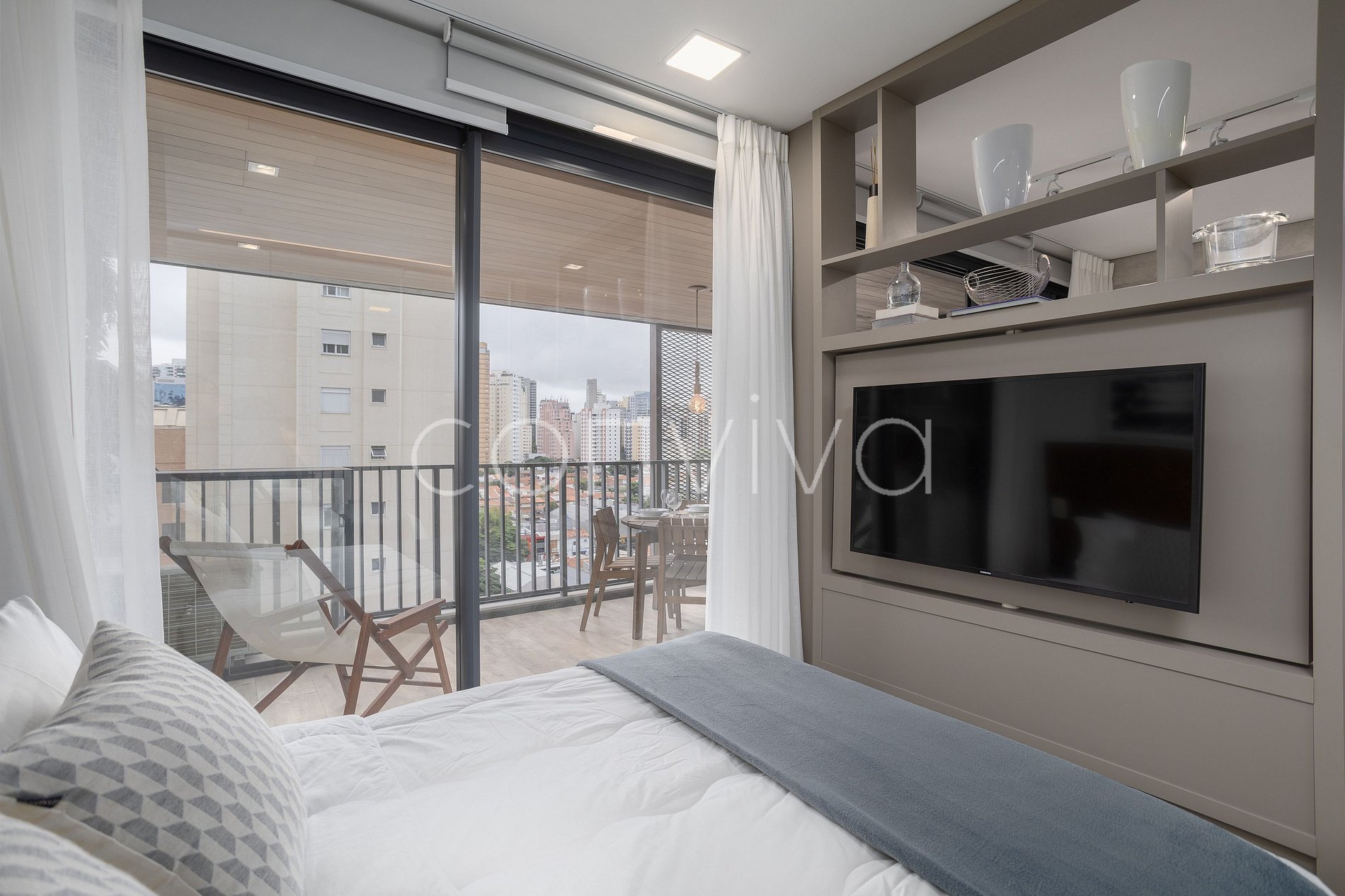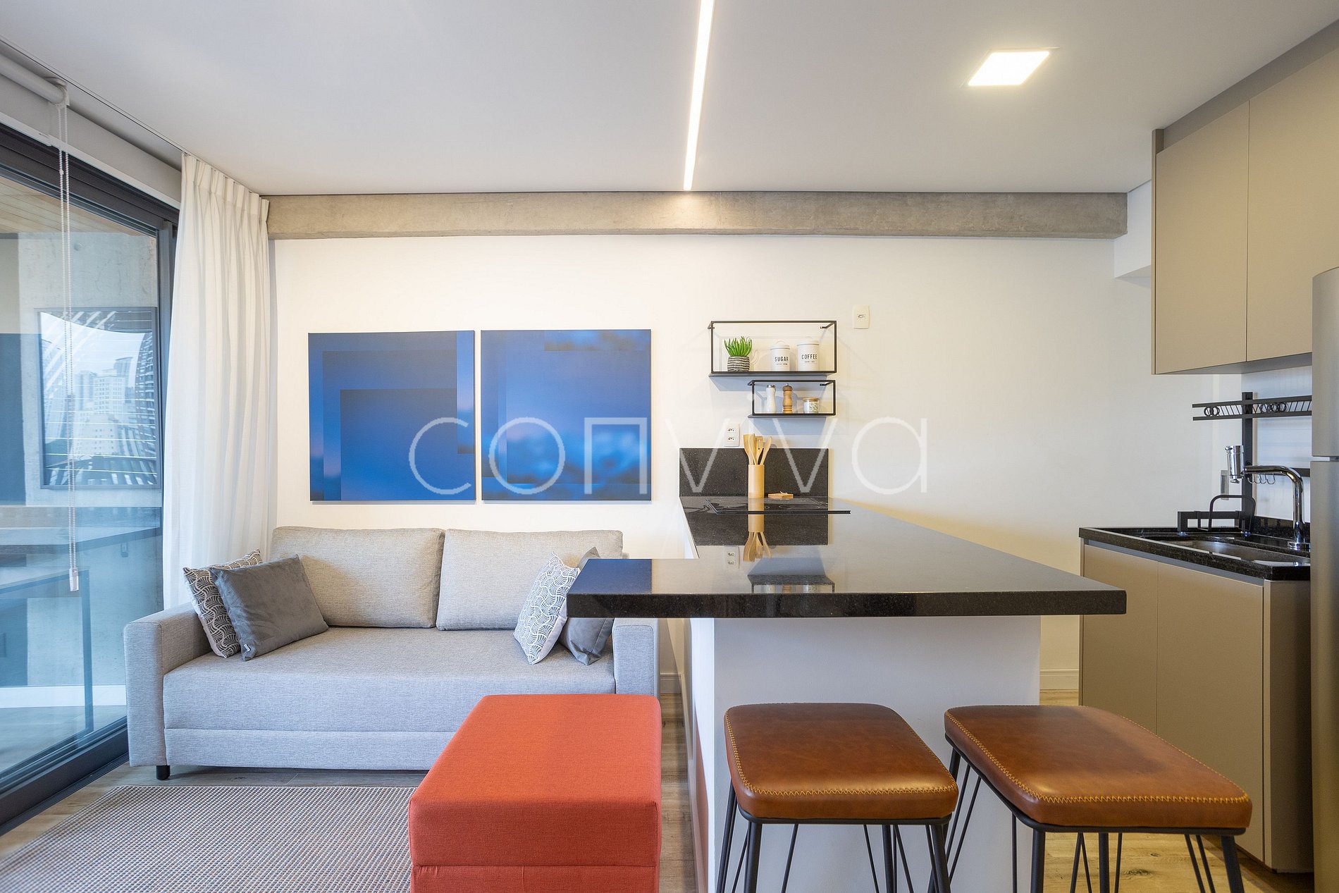 Un espacio de 44m², en el 9º piso, muy bien decorado, con cama queen size, sofá, baño, cocina completa, amplio balcón con home office y lavadero.