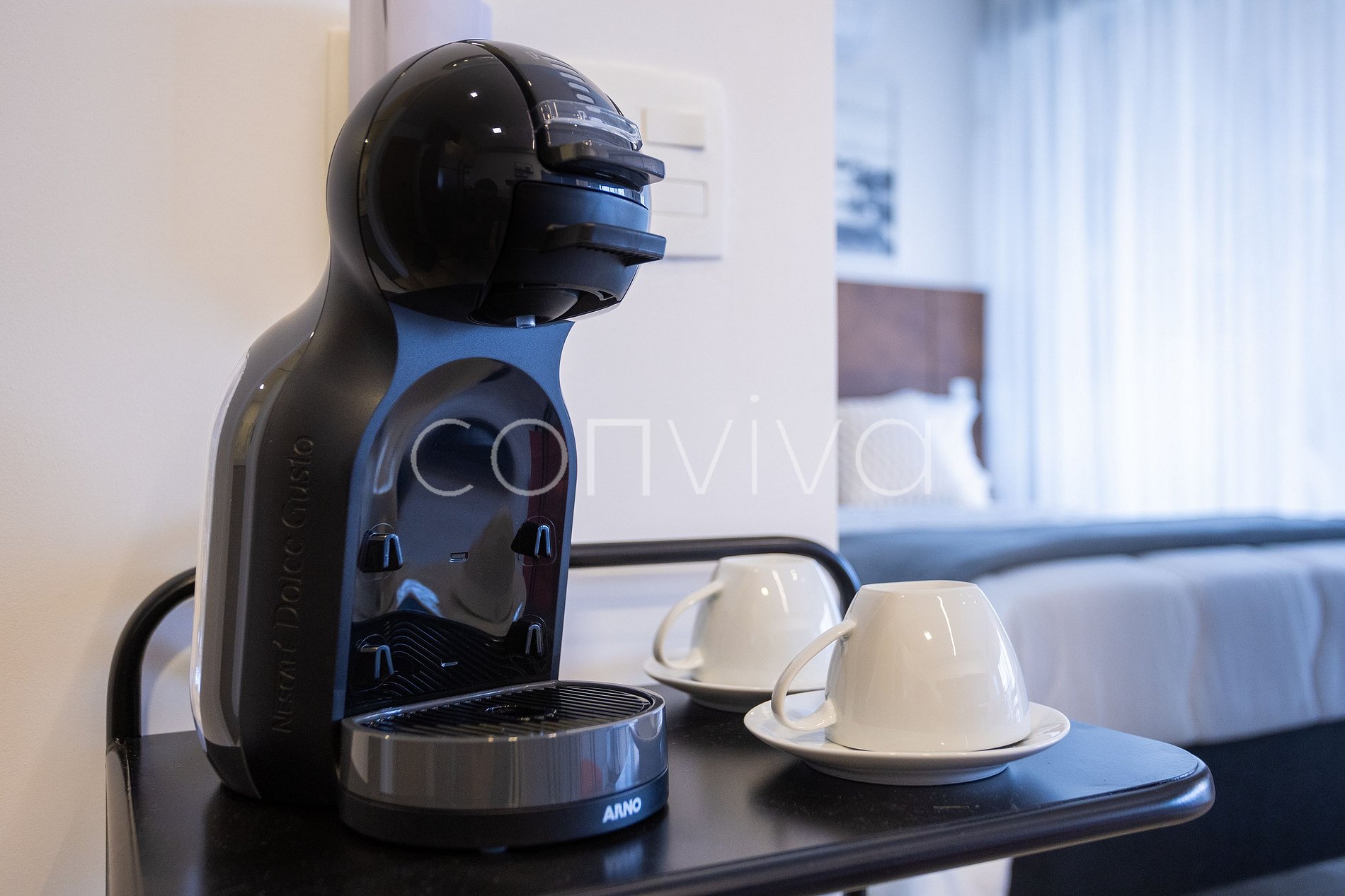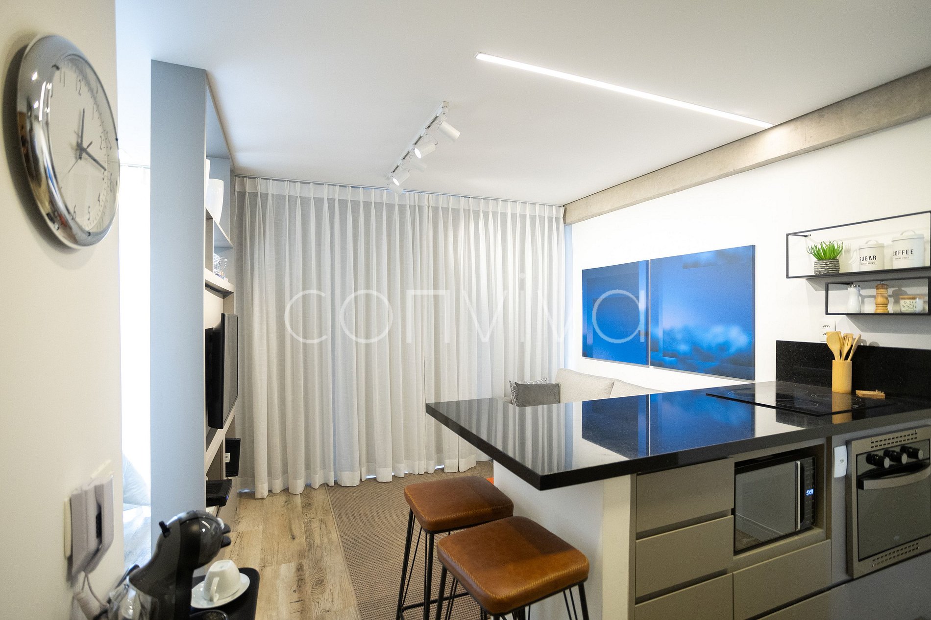 Un espacio de 44m², en el 9º piso, muy bien decorado, con cama queen size, sofá, baño, cocina completa, amplio balcón con home office y lavadero.