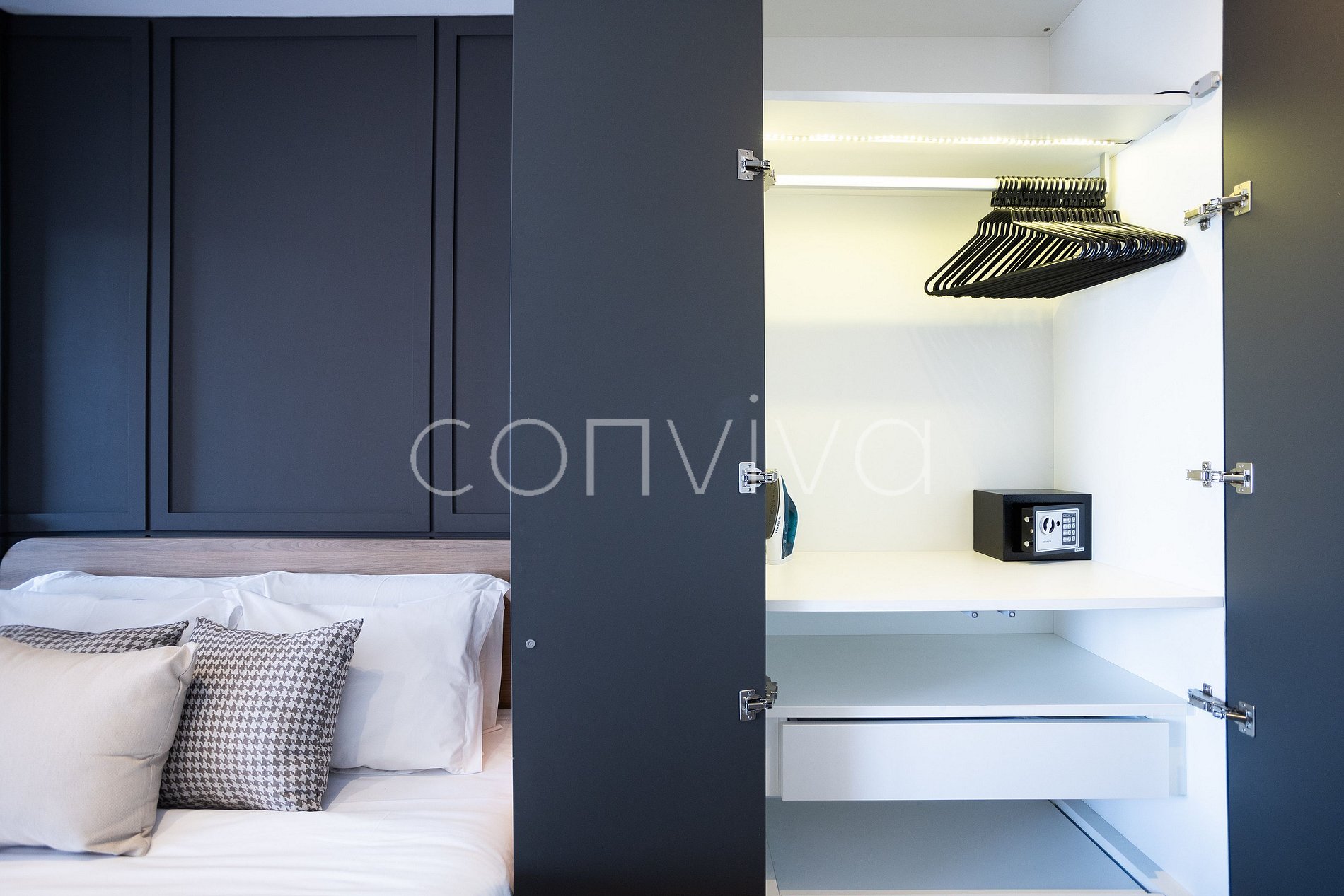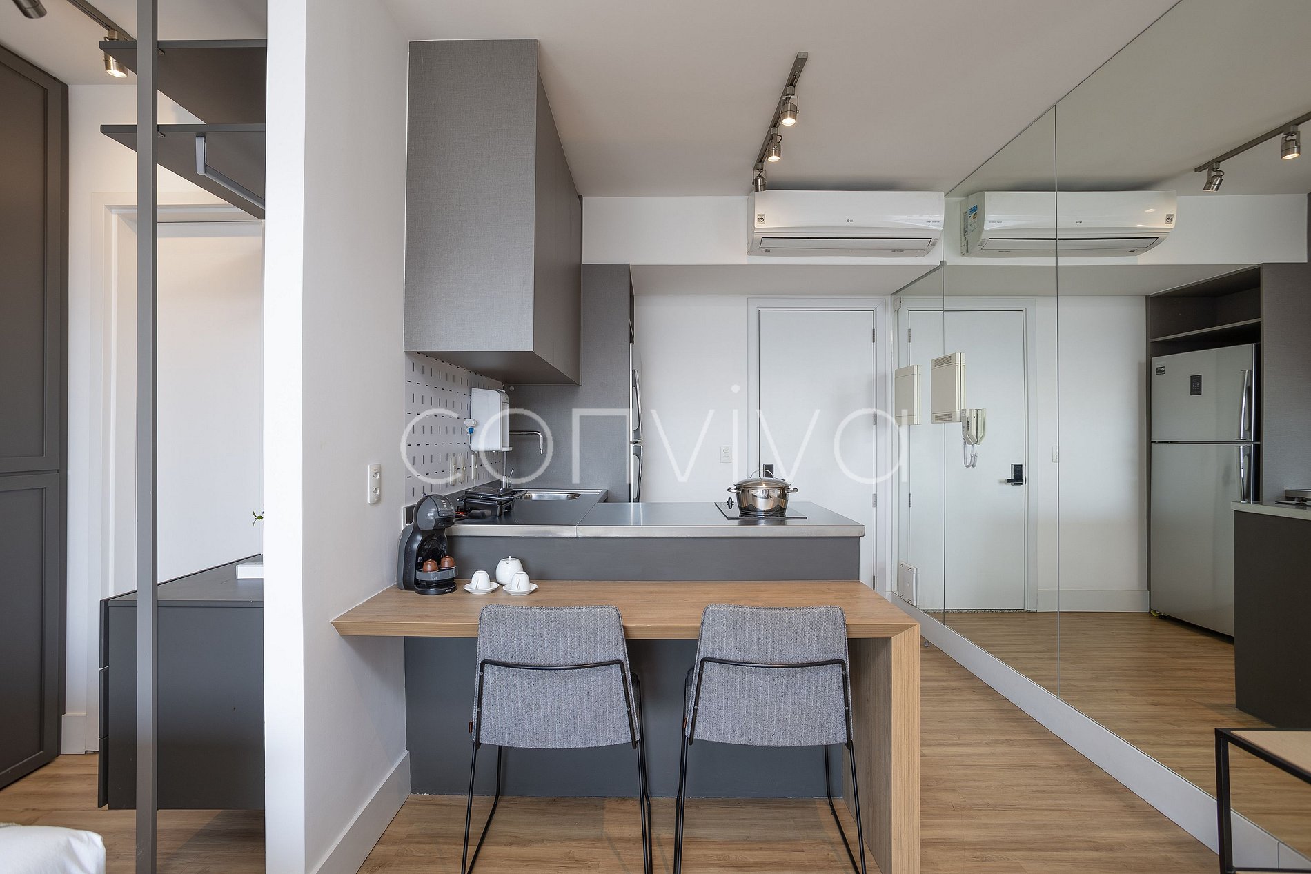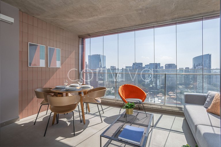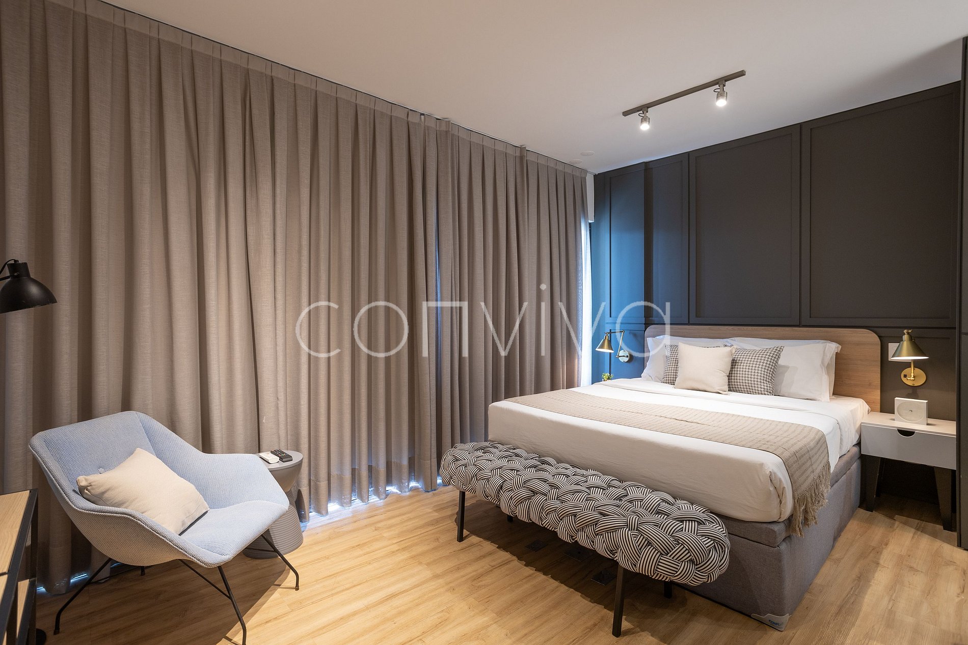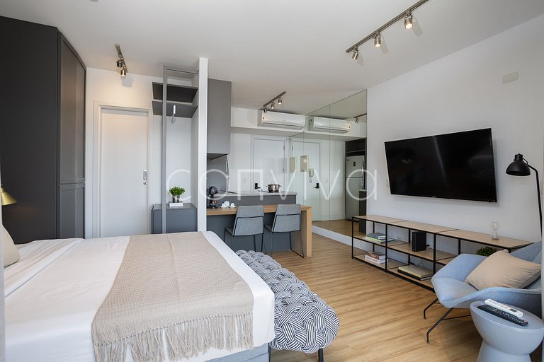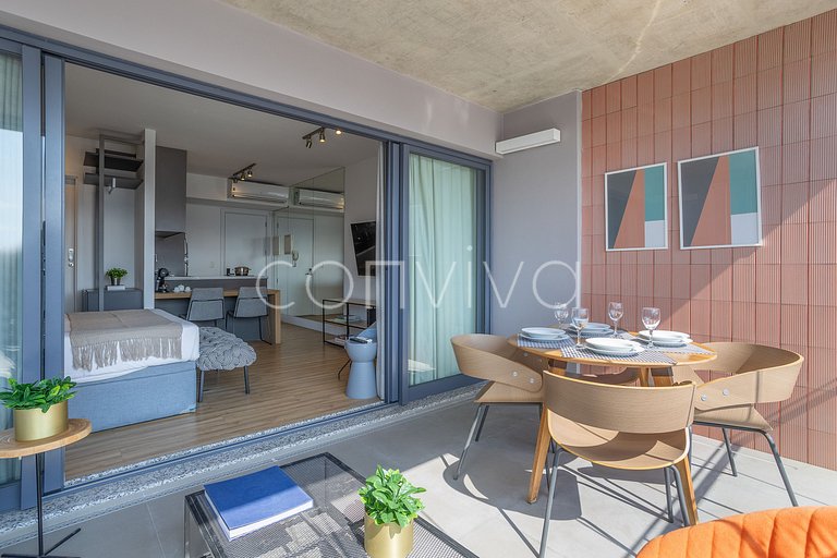 Espacio de 46m², en el 20º piso, con cama queen size, cocina americana y balcón.
