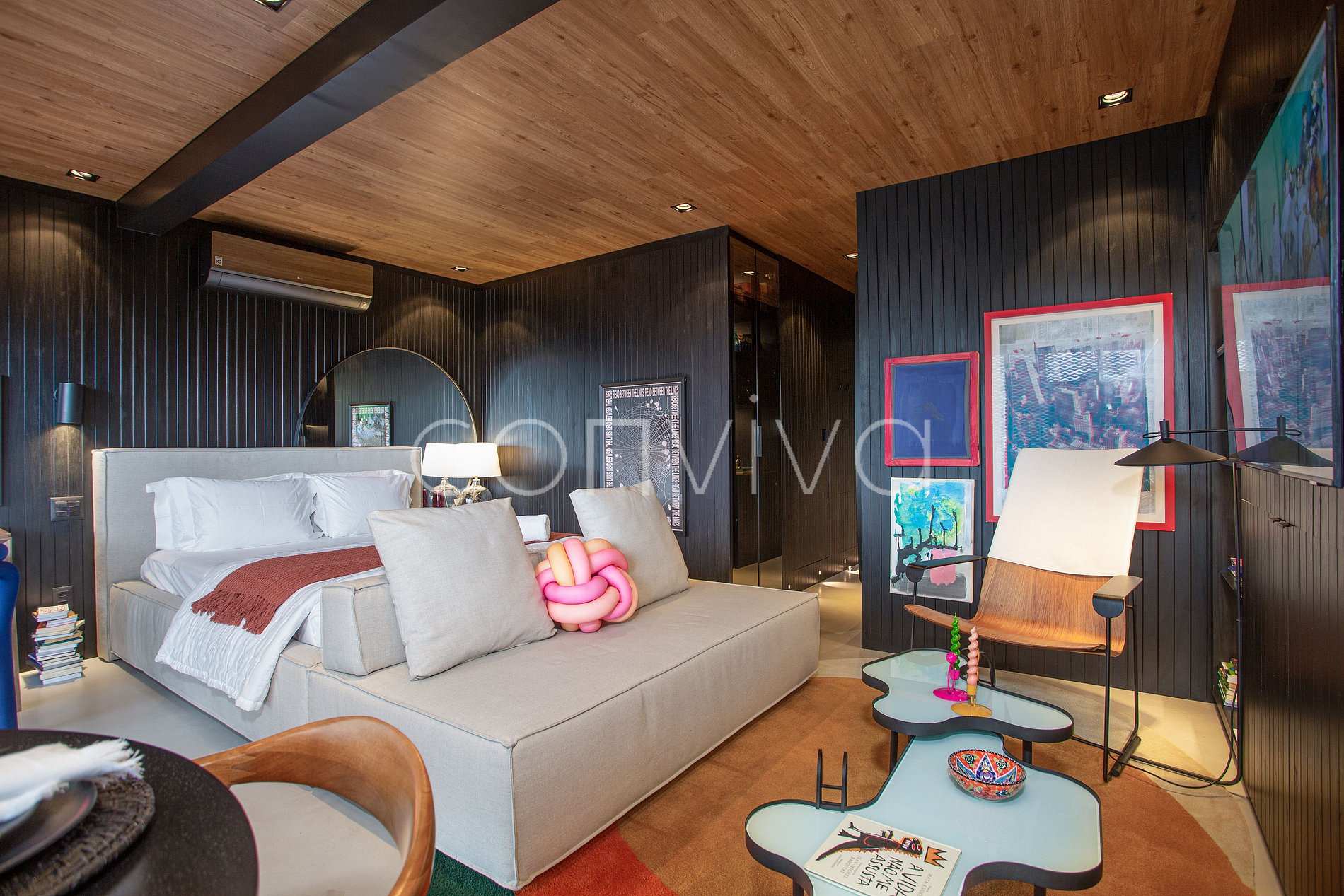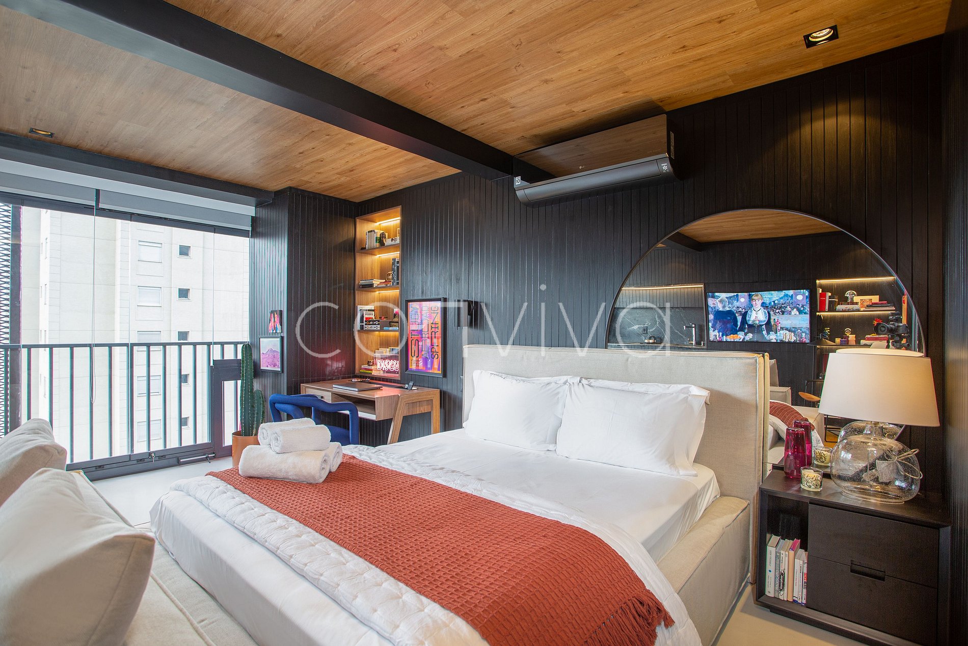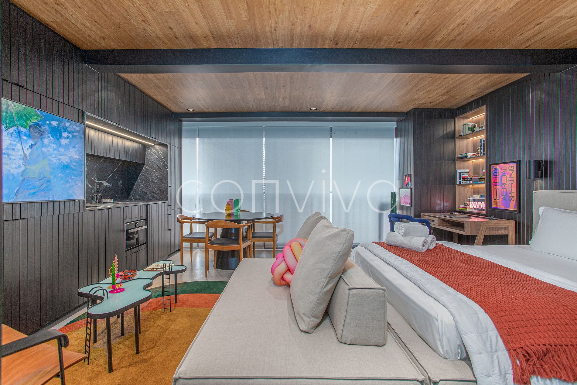 El espacio de 44m², en el 8º piso, cuenta con cama queen size, sofá, cocina americana, baño y una decoración deslumbrante en la mejor ubicación de Itaim Bibi.