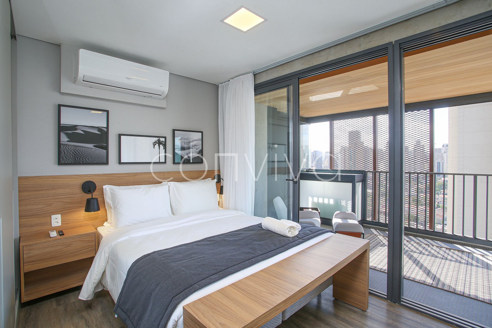 La unidad de 44m², en el piso 14, tiene una cama queen size, baño, cocina completa, sofá cama y un increíble balcón con vista al barrio.