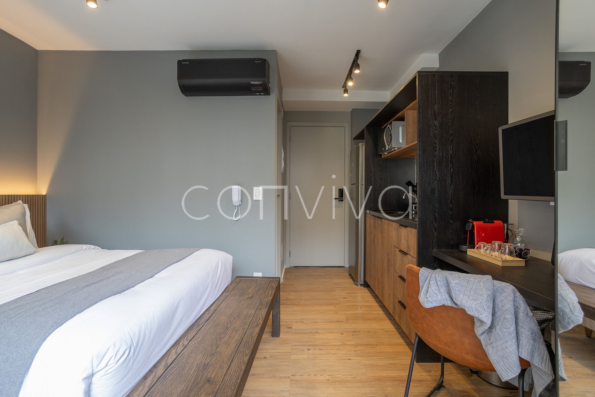 Espacio de 21m², en el 6º piso, con cama de matrimonio, baño, balcón y cocina completa.