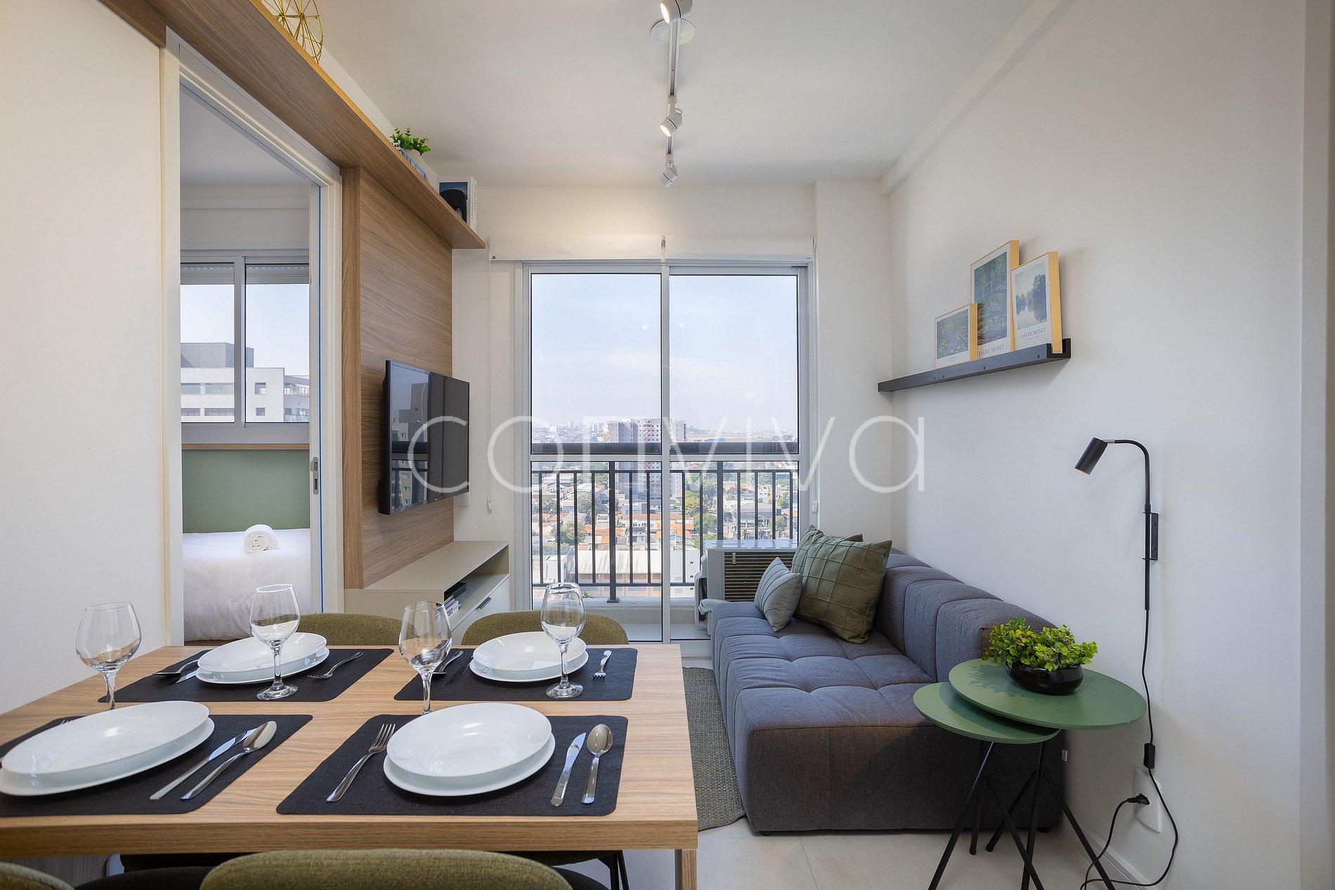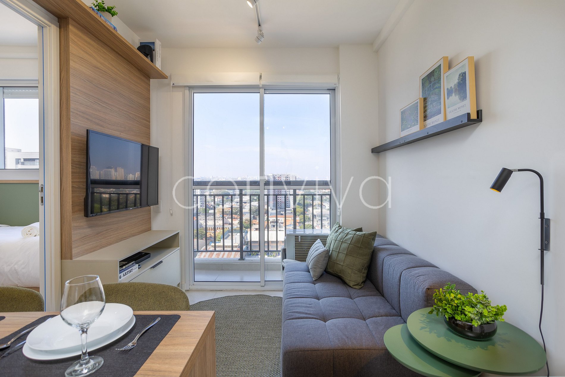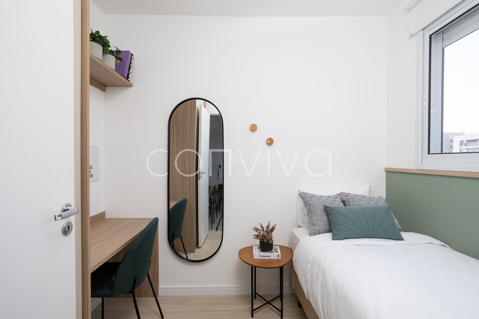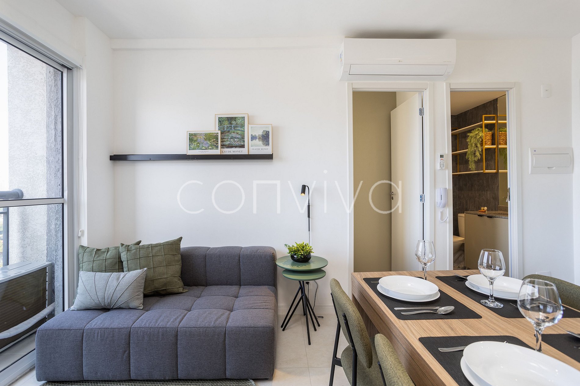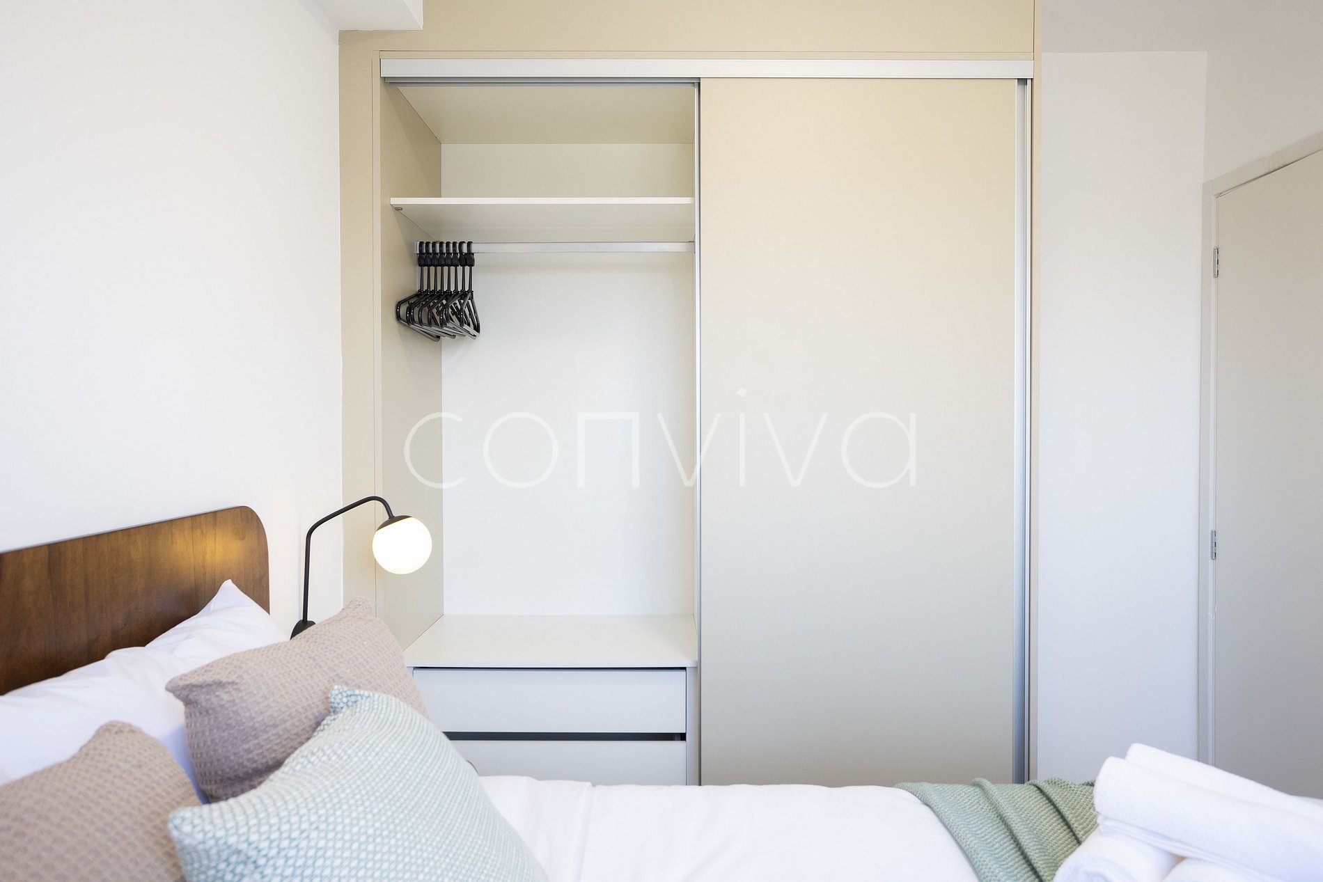 Con 36m², en la 14ª planta, dispone de dos habitaciones, una con cama de matrimonio y otra con cama individual y espacio para home office, sofá en el salón, cuarto de baño, cocina totalmente equipada y balcón con vistas al barrio.